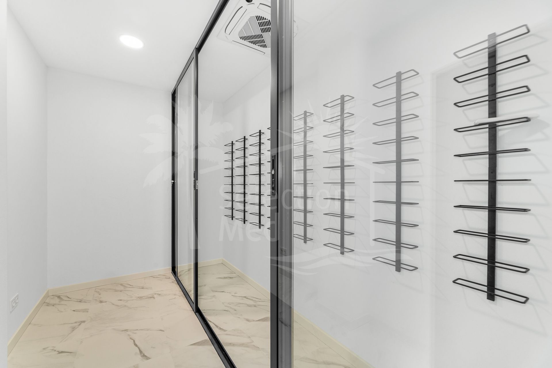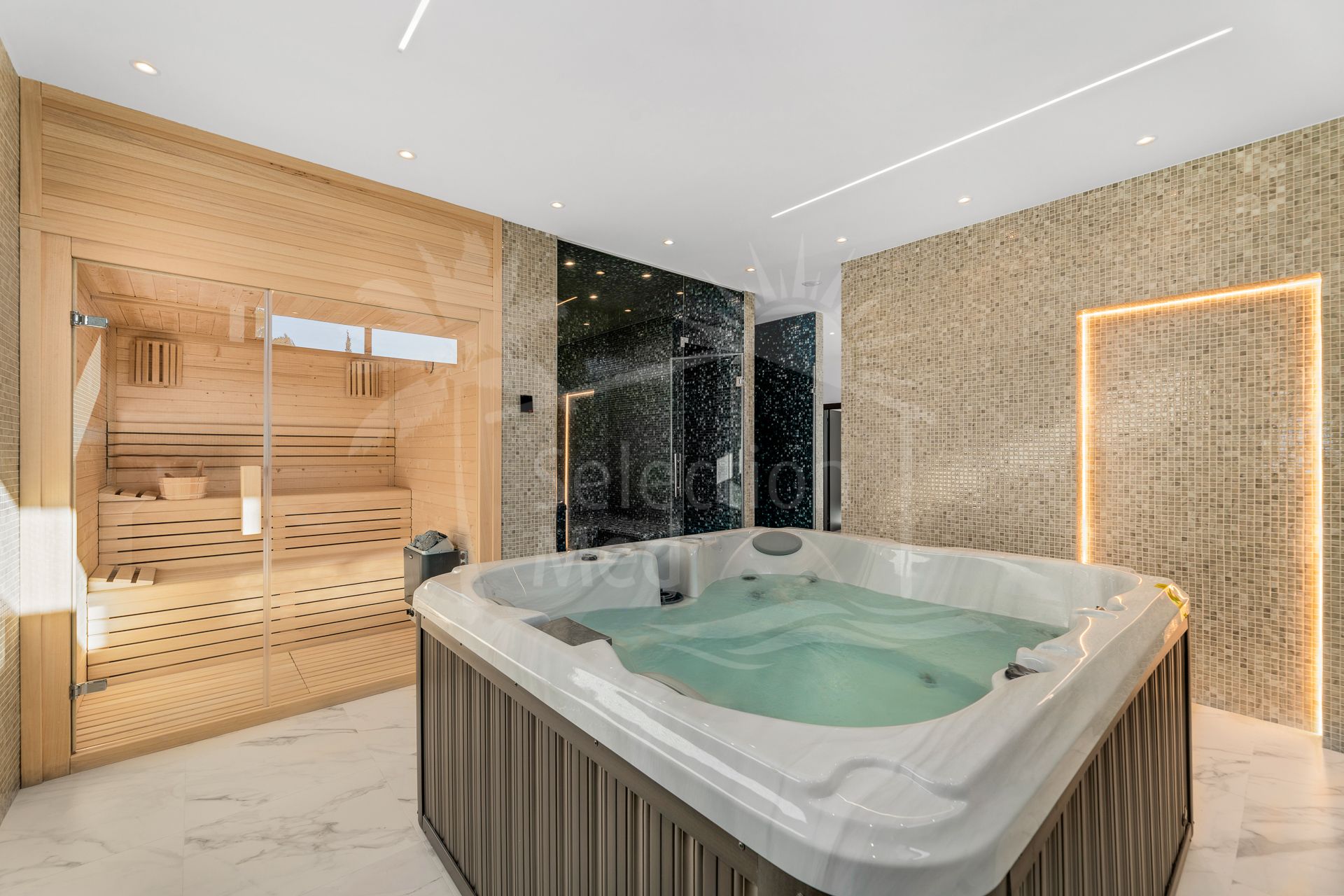 La planta inferior está dedicada al ocio y el bienestar, ofreciendo una zona de spa privada, saunas finlandesa y turca, y una bodega. También dispone de un apartamento para el personal y un área designada lista para la instalación de un gimnasio privado, permitiendo al futuro propietario personalizar el espacio.