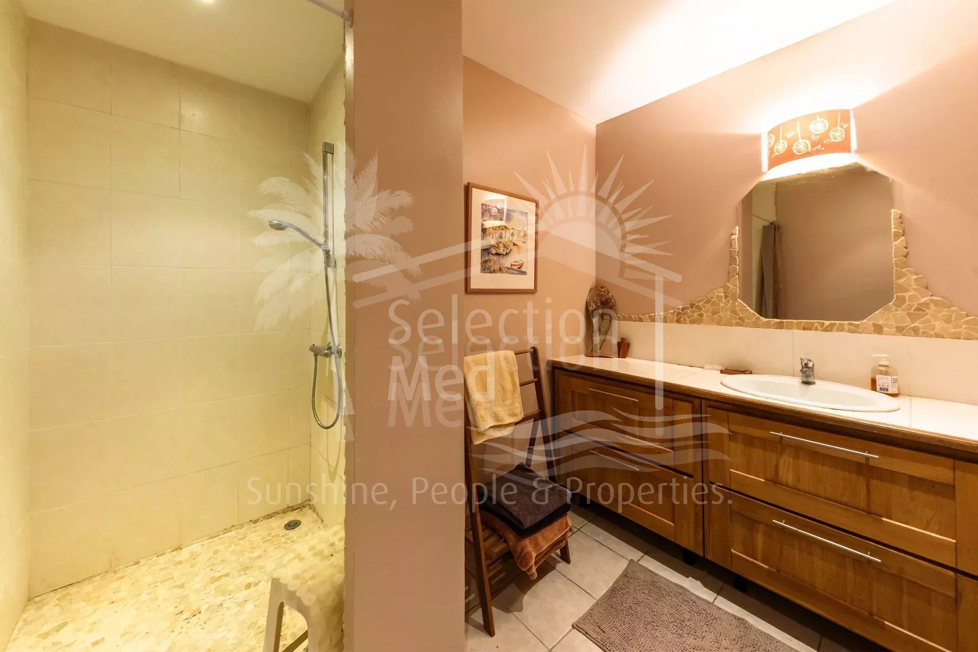 - Nivel del jardín: un garaje muy grande, embaldosado, aislado y reconvertido, un dormitorio muy grande de 28 m² con un espacio adicional de 12 m² que podría utilizarse como vestidor, y un cuarto de ducha.