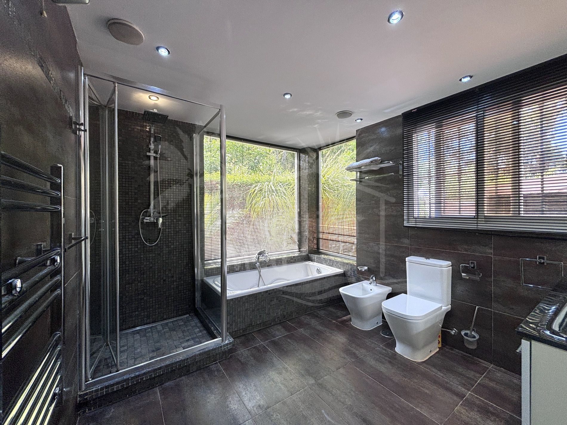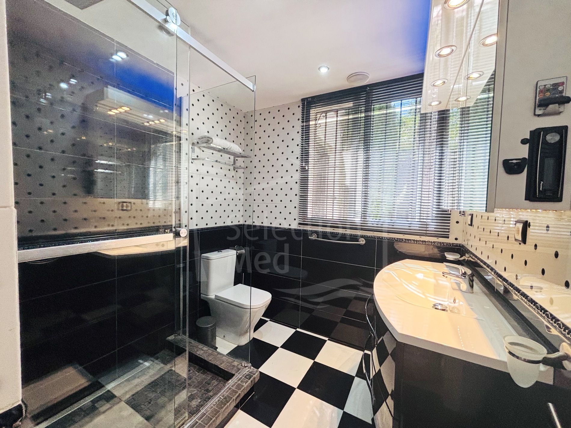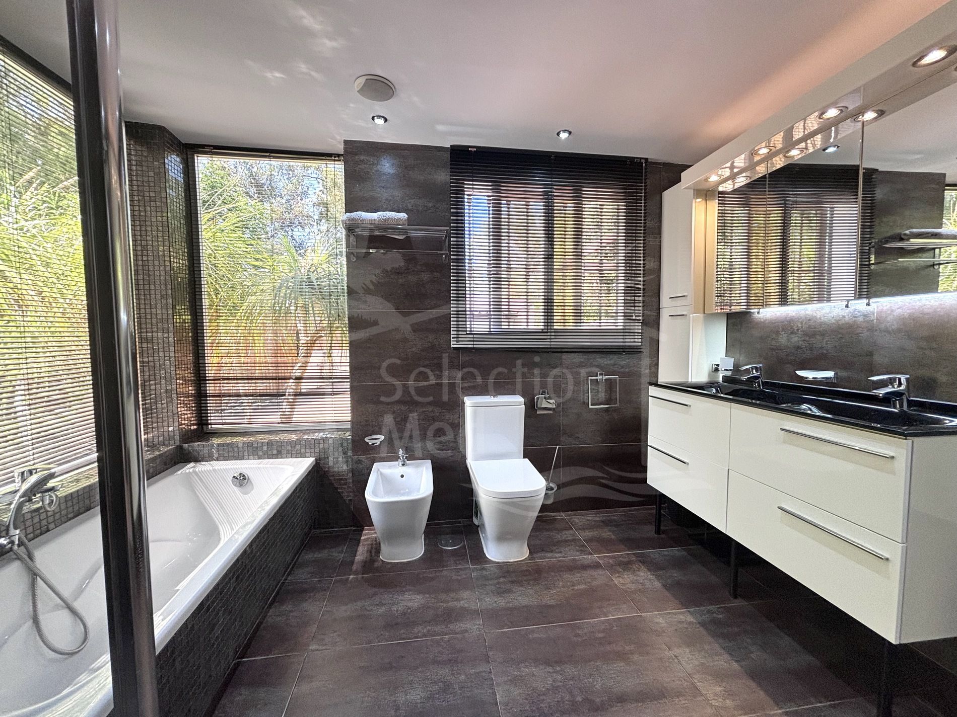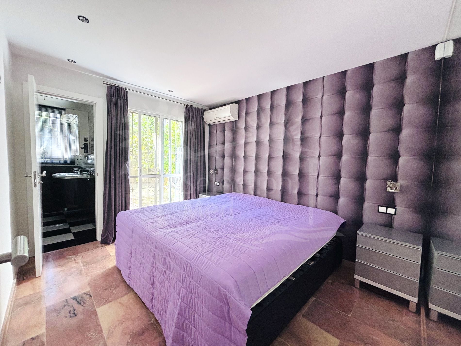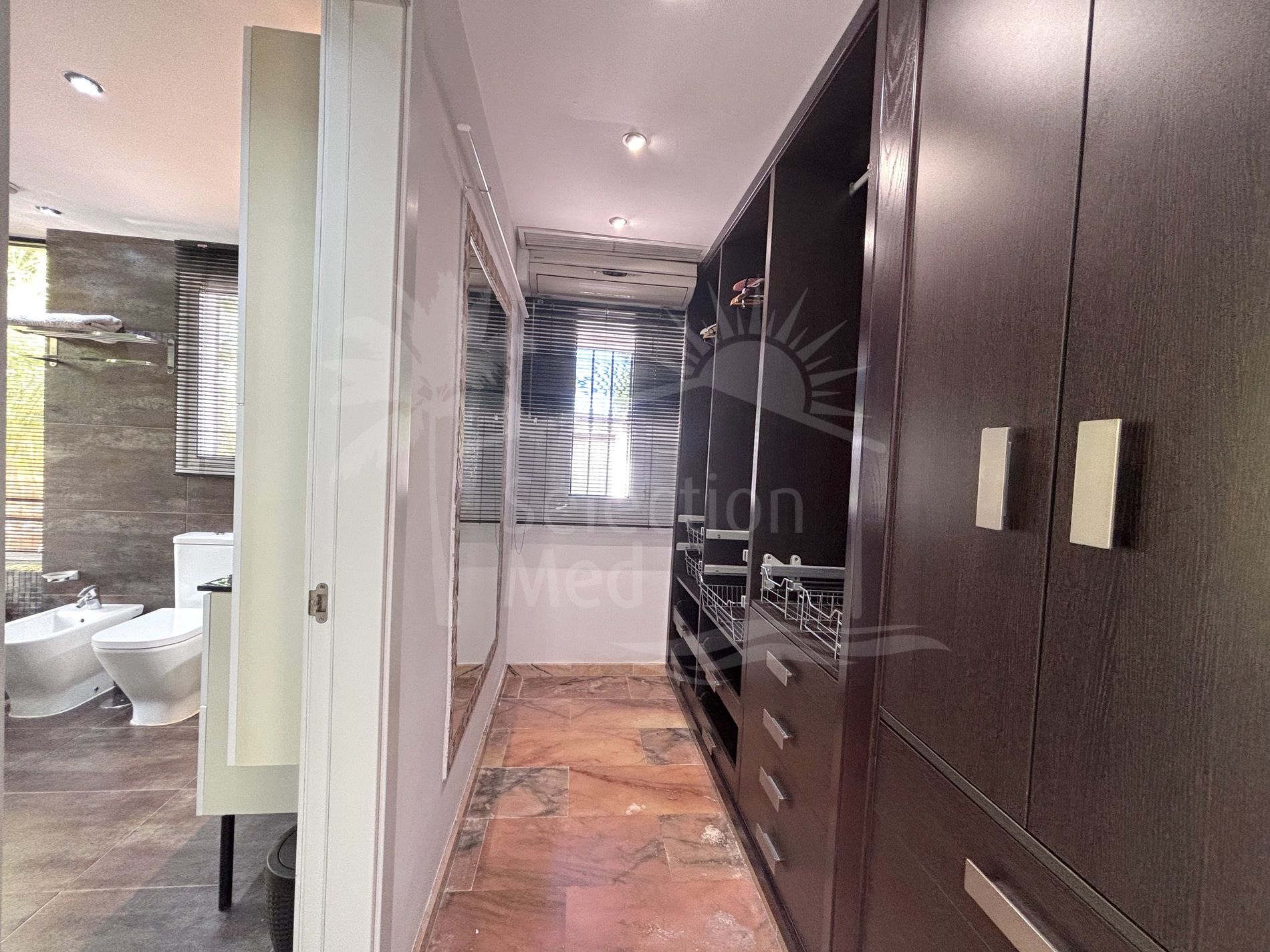 El dormitorio principal tiene su propio baño en suite, vestidor y acceso directo a la terraza y zona de piscina.
