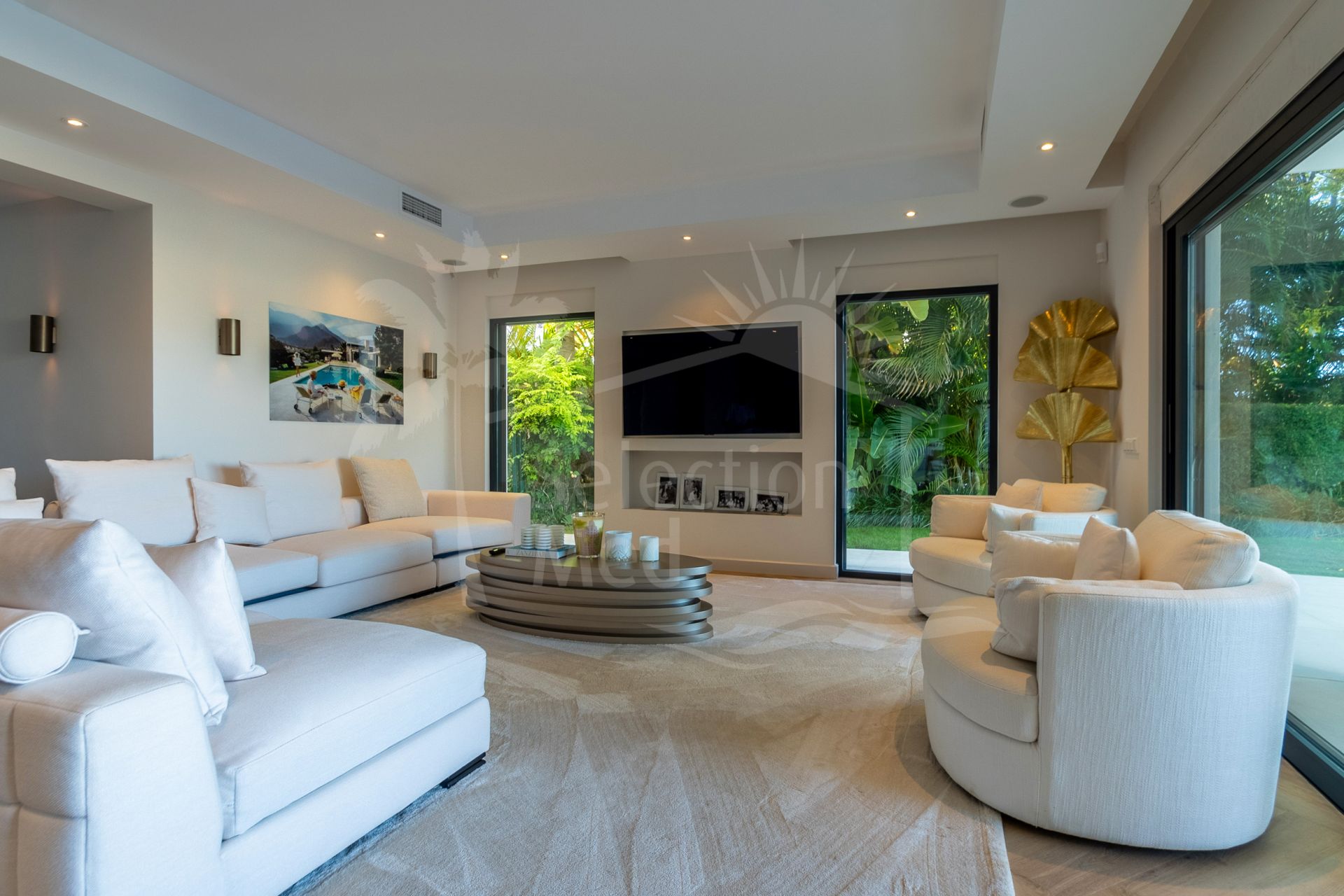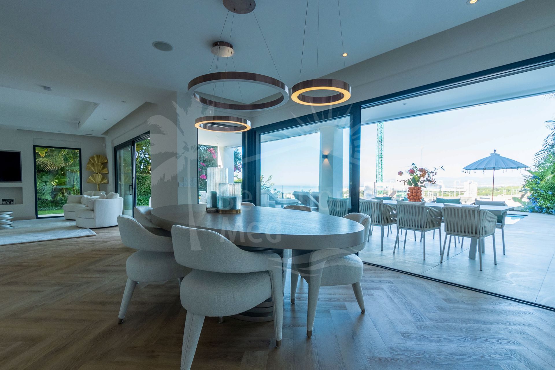 Salón luminoso con acceso directo al jardín y piscina
