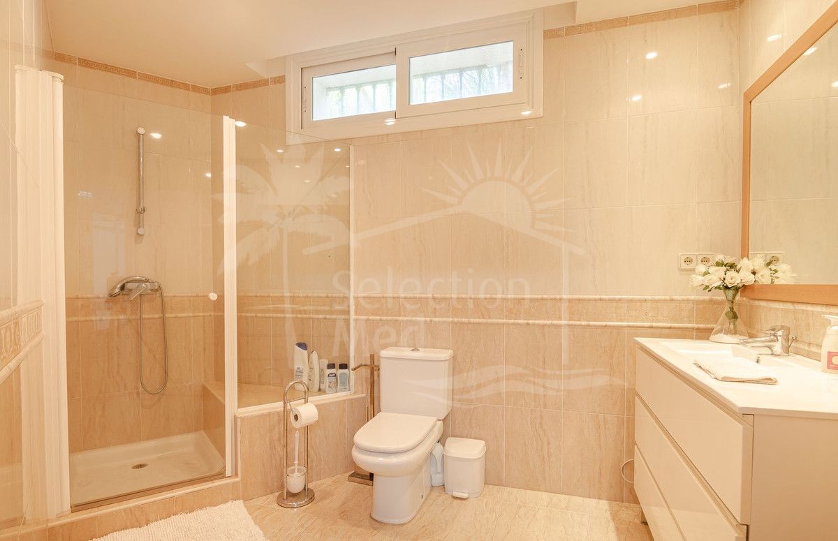 Esta espaciosa villa cuenta con seis amplios dormitorios y seis lujosos baños, cada uno diseñado cuidadosamente para combinar comodidad con estilo. Las áreas de estar de concepto abierto se conectan perfectamente con una terraza envolvente, mejorando la fluidez entre los espacios interiores y exteriores. La acogedora sala de estar también cuenta con una encantadora chimenea, ideal para las noches más frescas. En la planta superior, tres dormitorios en suite se abren a una amplia terraza, ofreciendo vistas panorámicas del paisaje circundante. Las ventanas amplias en toda la villa permiten que la luz natural inunde los interiores mientras ofrecen impresionantes vistas al mar desde casi todas las habitaciones.