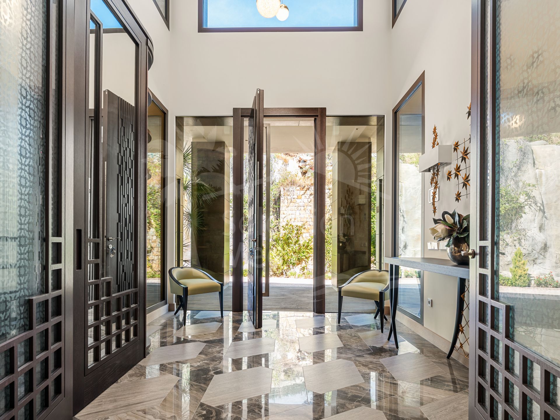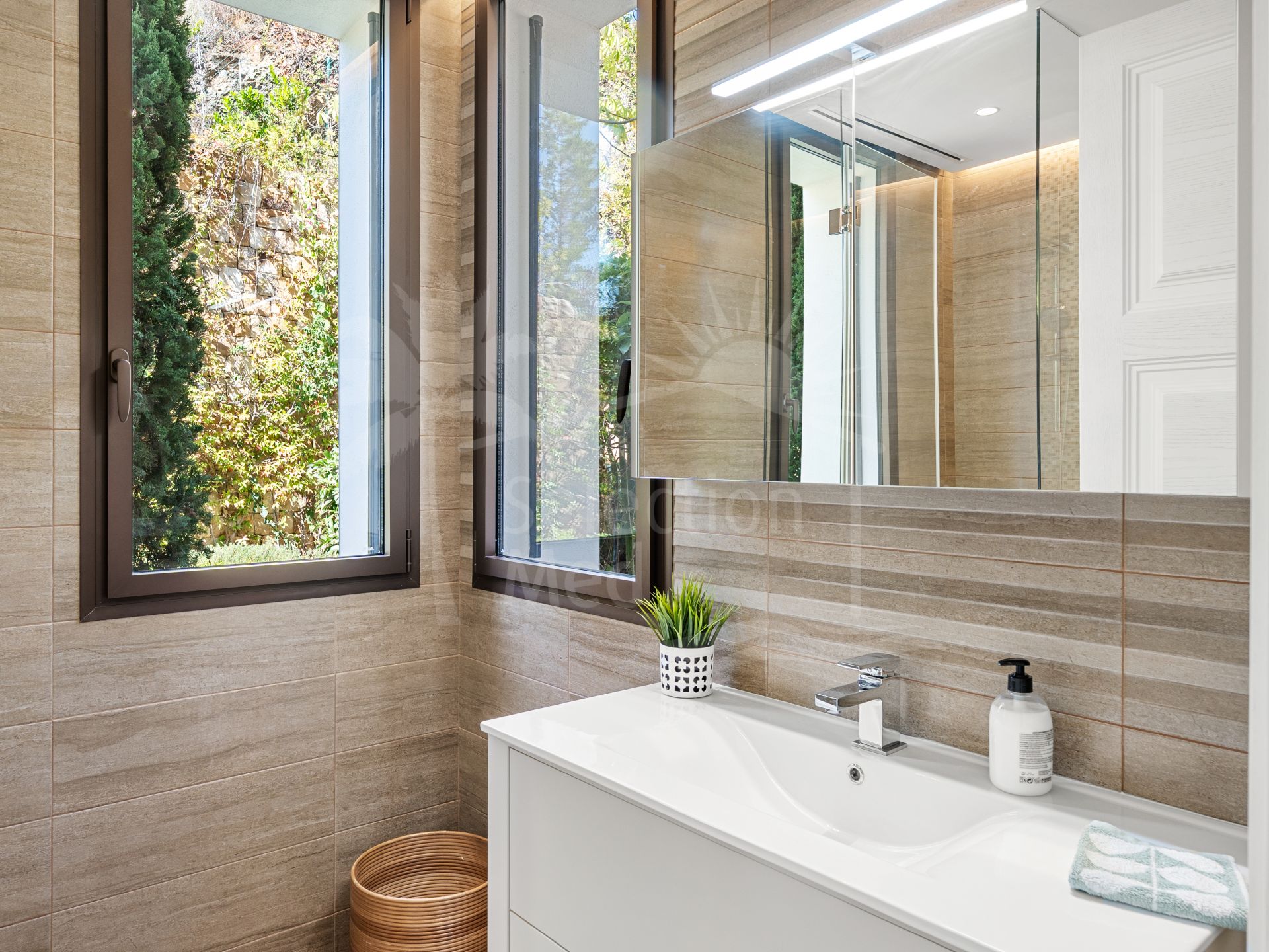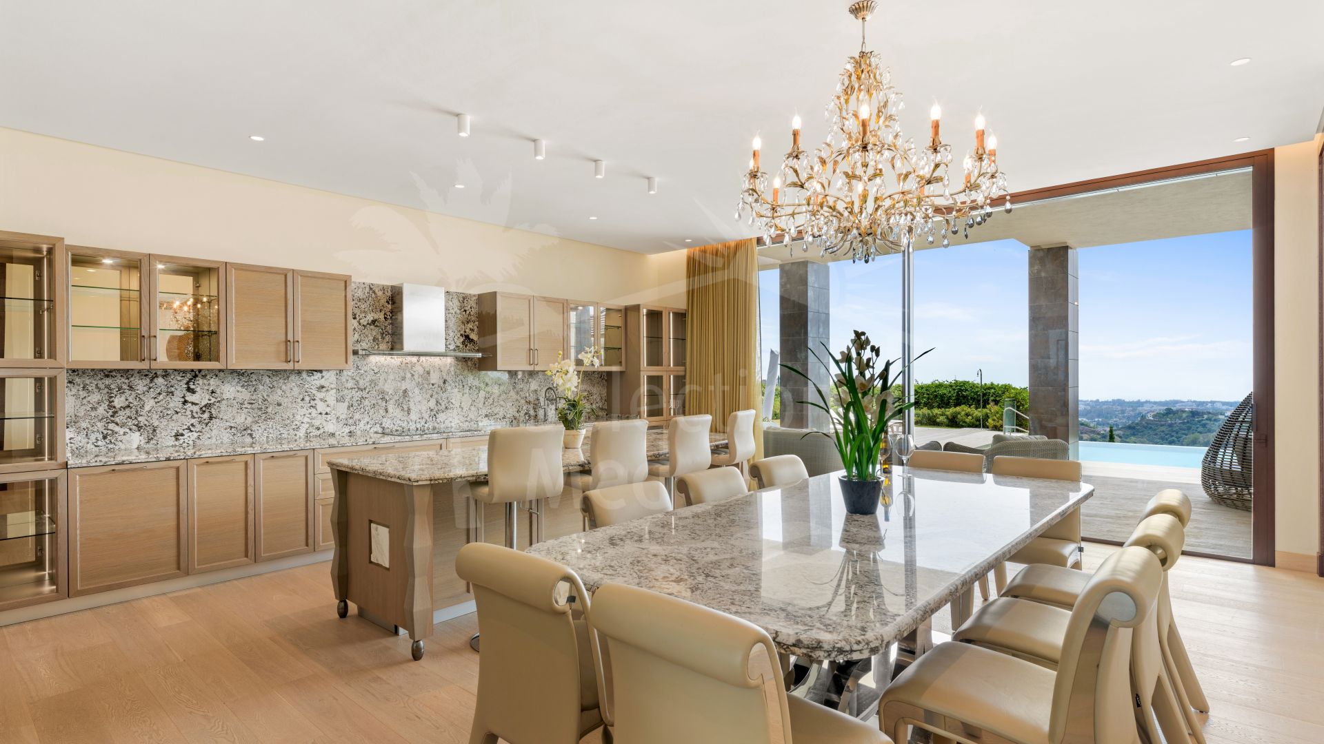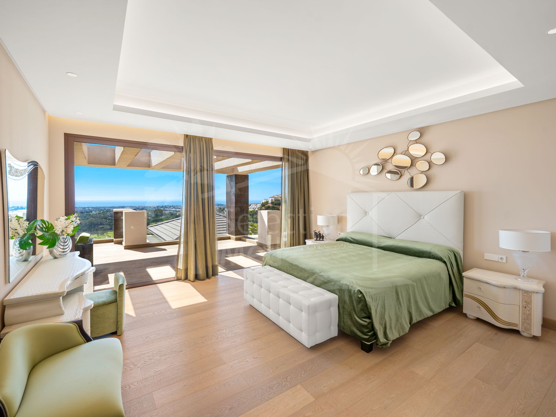Los aeropuertos internacionales de Málaga y Gibraltar están a menos de una hora. Rodeada de propiedades de lujo y una vegetación similar a la de Benahavís, esta espectacular villa de 1158 m² se encuentra en una amplia parcela de 3560 m². Esta impresionante casa cumple con los estándares modernos, ofreciendo respeto por el medio ambiente, tranquilidad, privacidad y lujo. Goza de magníficas vistas al campo de golf de Los Arqueros, a las exuberantes colinas y a las montañas cubiertas de pinos mediterráneos, así como impresionantes vistas panorámicas de la costa y el mar, llegando incluso a África. Esta elegante obra maestra arquitectónica, con detalles refinados, consta de planta baja, primer piso y sótano. Impresiona con sus amplios y luminosos salones y comedores, una moderna y elegante cocina totalmente equipada, terrazas de 298 m², 9 suites con baño privado, bodega y sala de juegos. Además de las zonas de estar, recepción y entretenimiento, esta casa también cuenta con lavandería, trastero, vestidor, dos aseos para invitados y un baño completo para el personal de limpieza. Las puertas de cristal y los amplios ventanales permiten que la luz natural inunde toda la casa. Las estancias se abren a magníficas terrazas, un jardín subtropical con exuberante césped, zonas ajardinadas y una terraza solárium. Una impresionante piscina de 12 × 6 metros con sistema de filtración de sal marina le invita a refrescarse en los días calurosos o a celebrar fiestas memorables durante todo el año. La región de Marbella es famosa por su clima, considerado el mejor de la Europa continental, y su piscina está climatizada. Un pabellón acristalado y una zona de relax complementan una cocina totalmente equipada, ideal para barbacoas y cenas al aire libre. Un garaje privado tiene capacidad para cuatro coches de su elección. Esta villa contemporánea de alta gama encarna el arte de la vida de lujo y se ofrece a la venta con numerosas comodidades, como ascensor, suelos de parquet, calefacción por suelo radiante y aire acondicionado en toda la casa, armarios empotrados, iluminación LED y mucho más. La paleta de colores neutros crea una atmósfera verdaderamente tranquila. Lo ultramoderno y lo relajante se fusionan a la perfección en esta propiedad de lujo, combinando a la perfección la elegancia mediterránea y la funcionalidad.