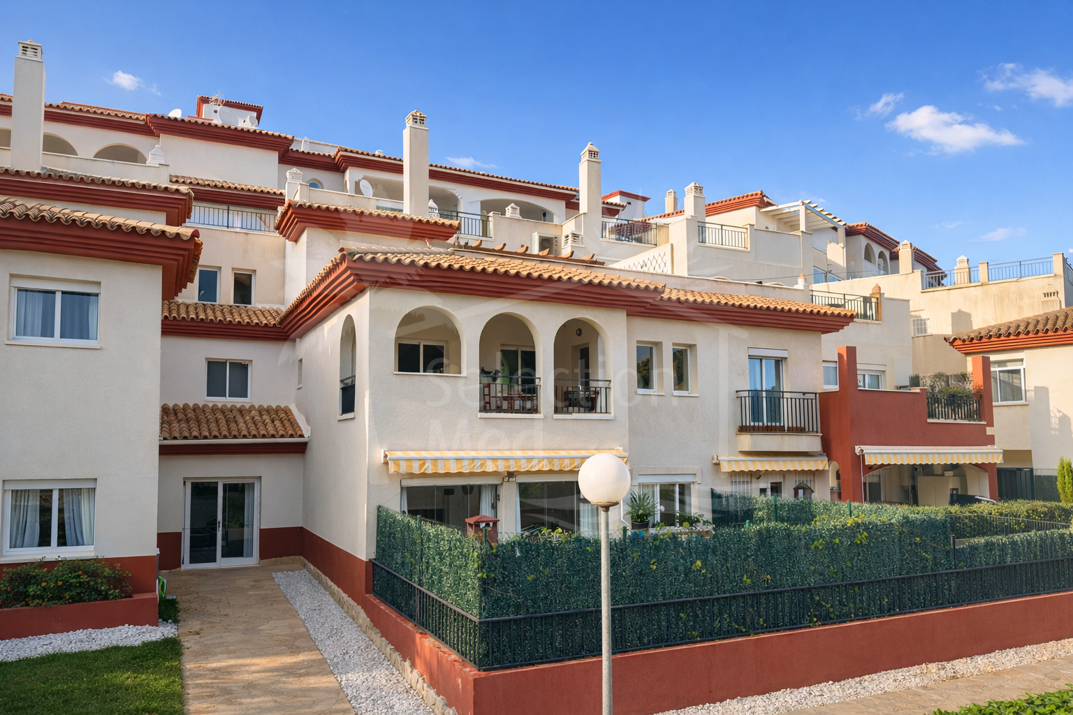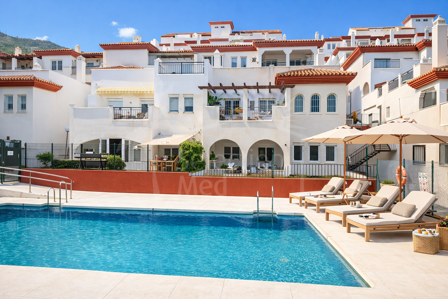 El apartamento se sitúa en la primera planta y dispone de una zona de estar de concepto abierto con cocina parcialmente integrada. Tiene terraza propia con vistas a los jardines y a la montaña. La terraza está cubierta y tiene aproximadamente 12 m², lo que permite disfrutar cómodamente del clima cálido de la Costa del Sol. La vivienda ofrece 2 dormitorios equipados con armarios empotrados y 2 baños, uno con plato de ducha y otro con bañera. Además, el apartamento dispone de una plaza de aparcamiento subterráneo asignada. La urbanización cuenta con piscina comunitaria y terrazas con espectaculares vistas al mar.