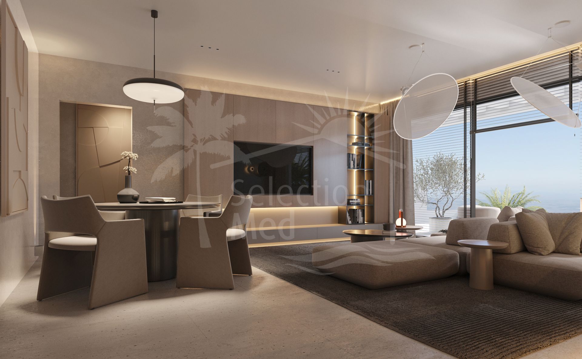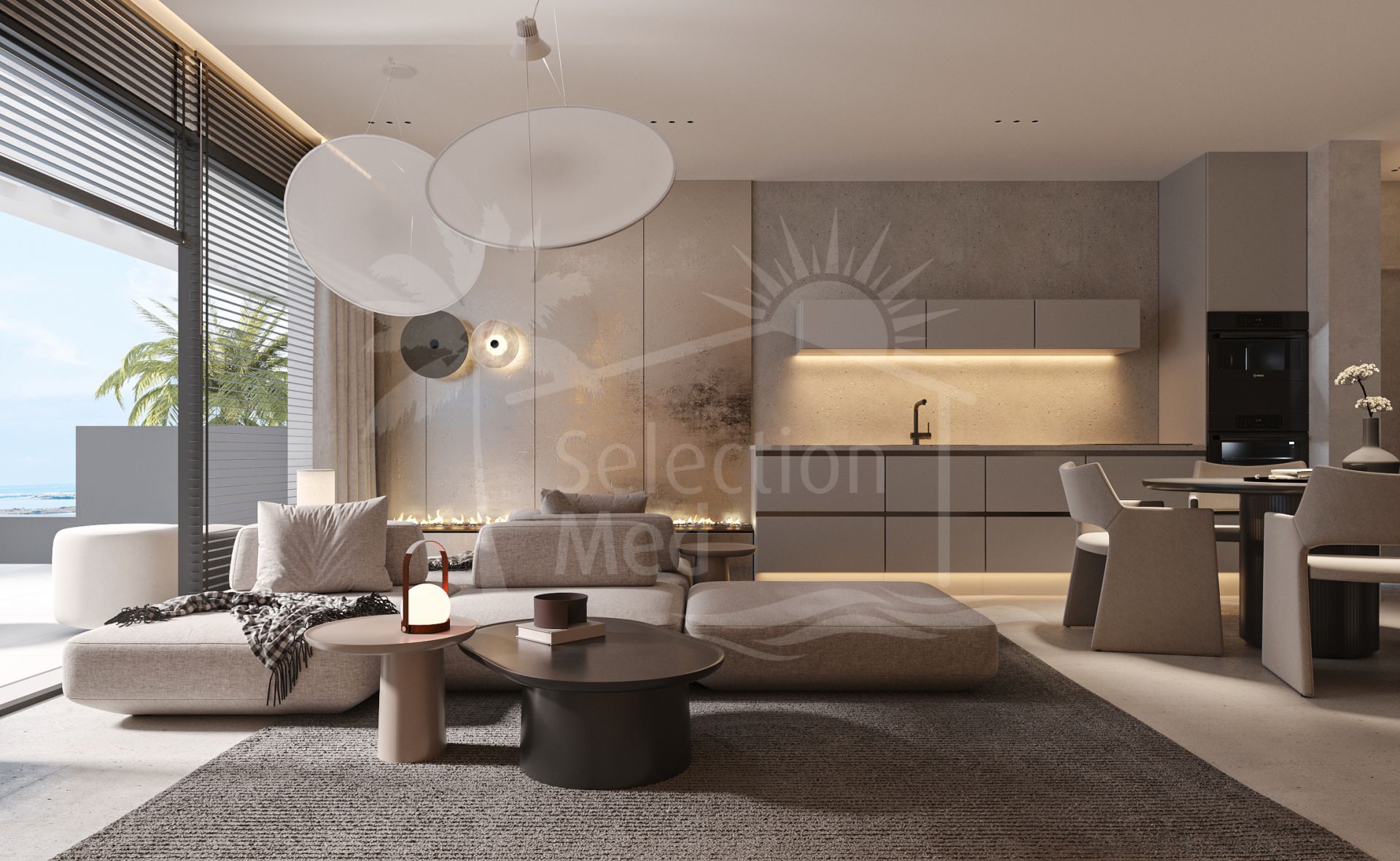 El apartamento está diseñado con un diseño de planta abierta, con un aseo de invitados fuera del hall de entrada, y una cocina americana de estilo, que conduce al salón de planta abierta y comedor con acceso directo a las amplias terrazas, con una amplia terraza superior a 200m2