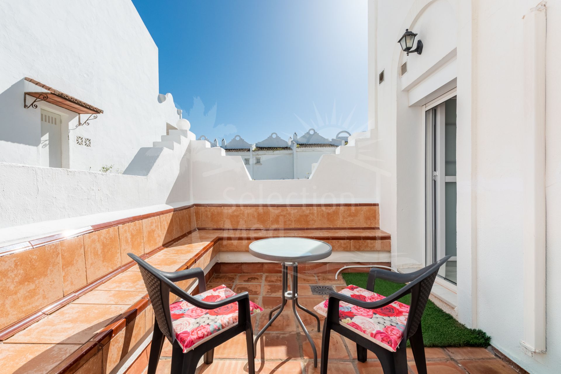 En la planta superior se encuentra una espaciosa terraza orientada al oeste, un lugar perfecto para desconectar al sol de la tarde mientras se disfrutan de hermosas vistas al atardecer.