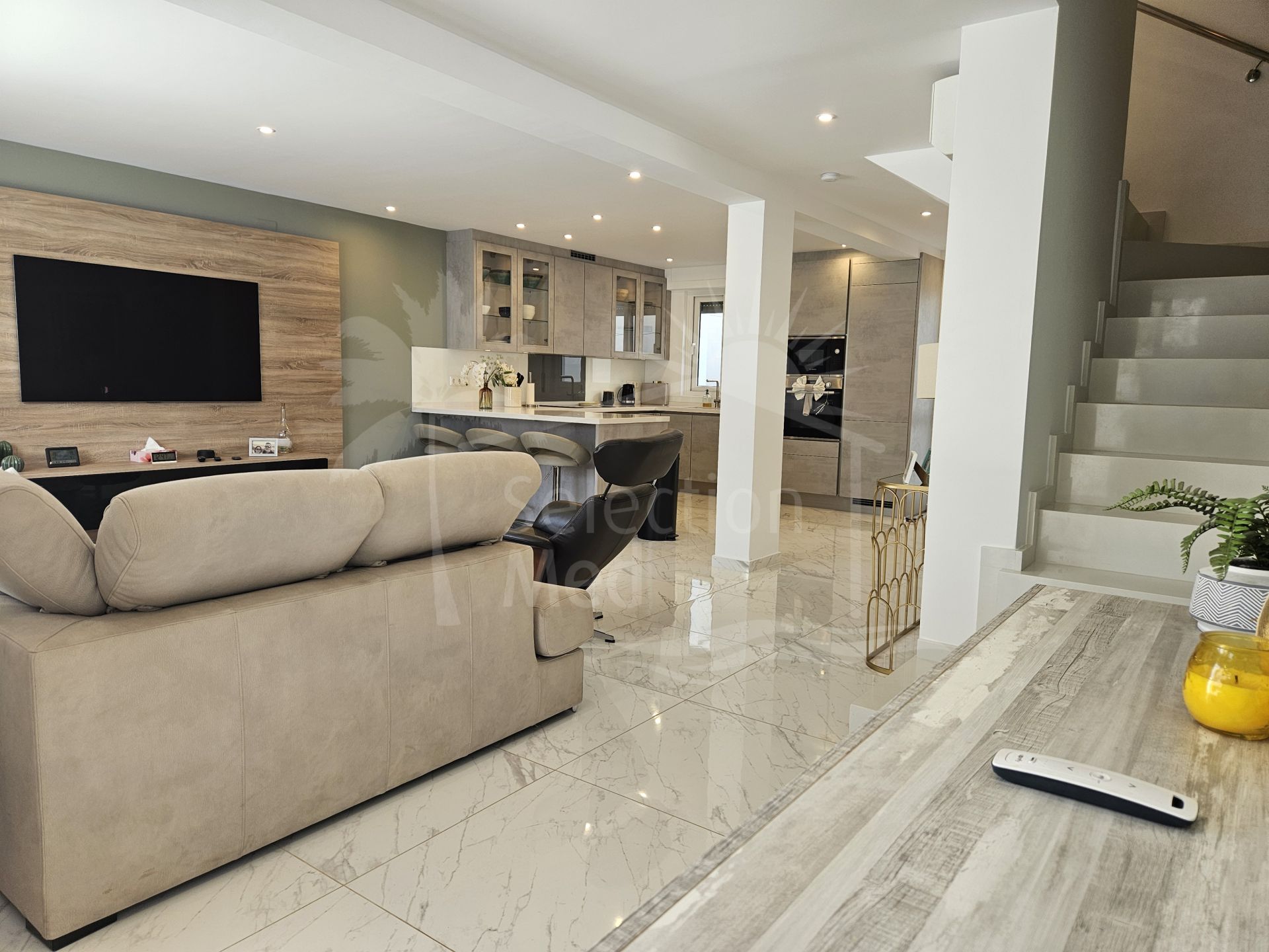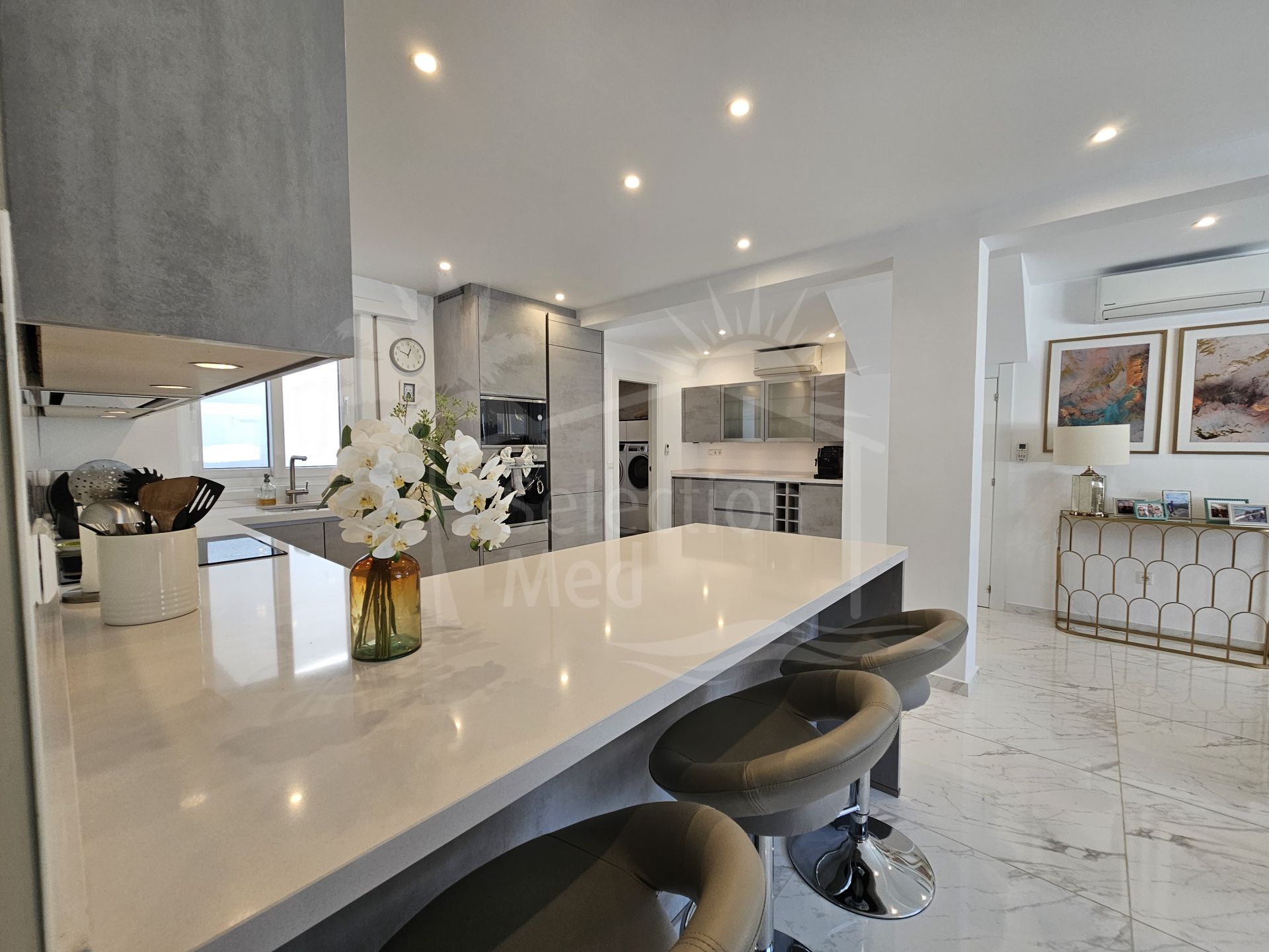 Se accede a la vivienda a través de una amplia terraza privada y segura, orientada al oeste para aprovechar al máximo el sol. Al entrar, encontramos un gran espacio diáfano con una cocina de alta gama equipada con encimeras de Silestone y electrodomésticos modernos, zona de comedor y salón. Junto a la cocina hay también una barra de desayuno en la parte trasera y un lavadero independiente con aseo y acceso a un patio posterior que ofrece espacio adicional de almacenaje. En la planta superior se encuentran los 4 dormitorios: el principal con baño en suite y los otros tres comparten un baño. Todos los dormitorios disponen de aire acondicionado y tienen un buen tamaño.
