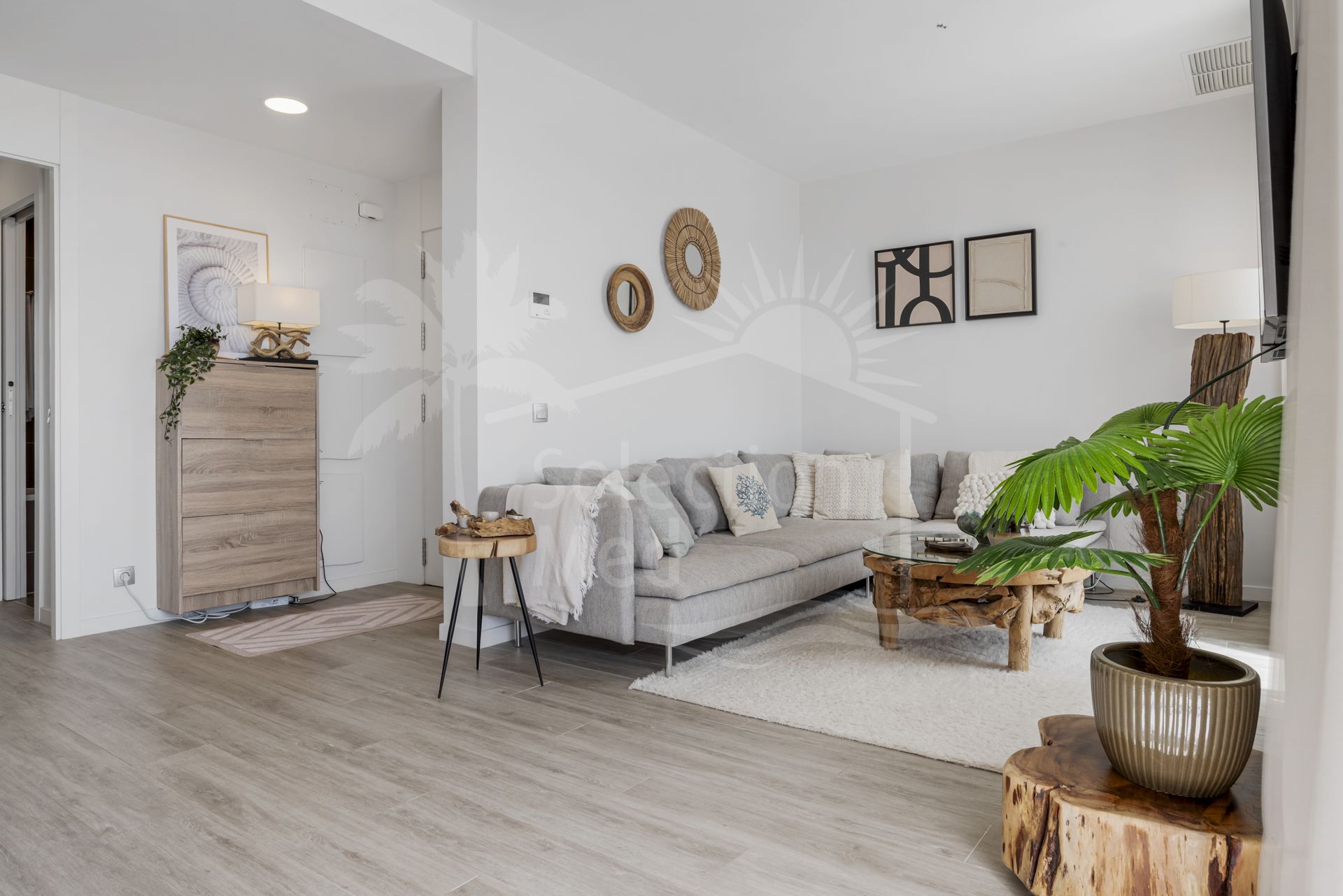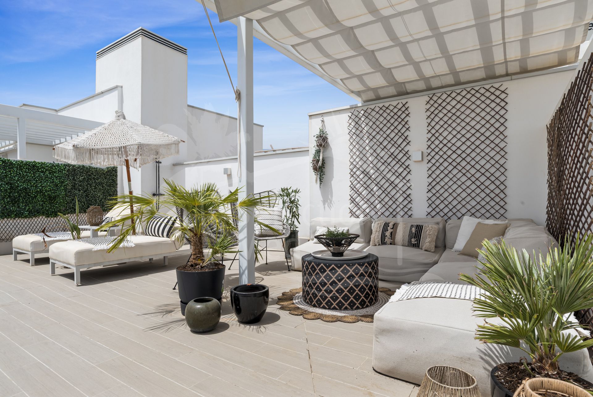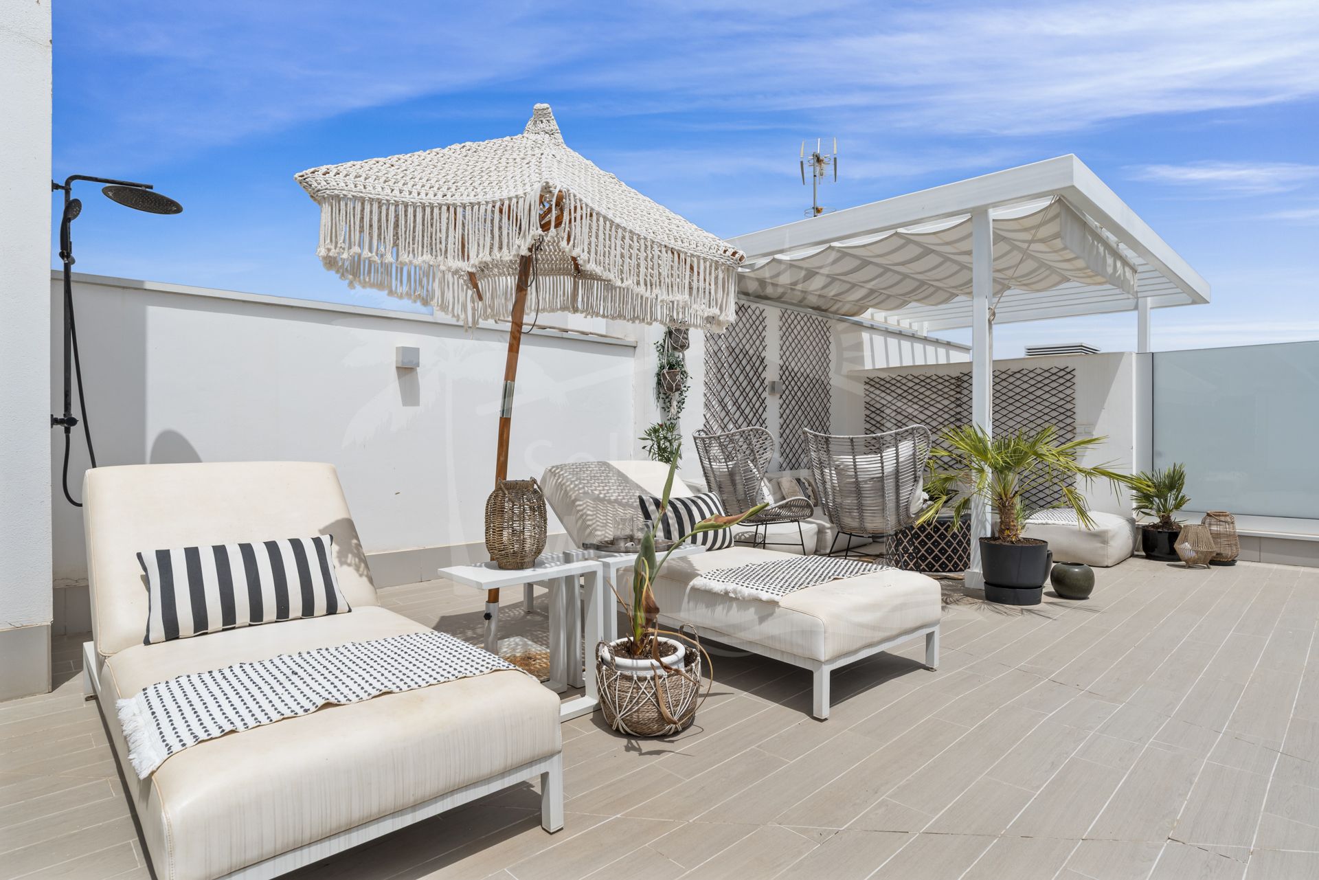 El dormitorio principal está completo con armarios empotrados y un baño en suite, mientras que el dormitorio de invitados disfruta de acceso a un segundo baño bien equipado. Arriba, el solarium privado en la azotea ofrece un espacio acogedor para relajarse, entretener y disfrutar del sol todo el día, enmarcado por vistas panorámicas que se extienden hacia Gibraltar y las montañas.