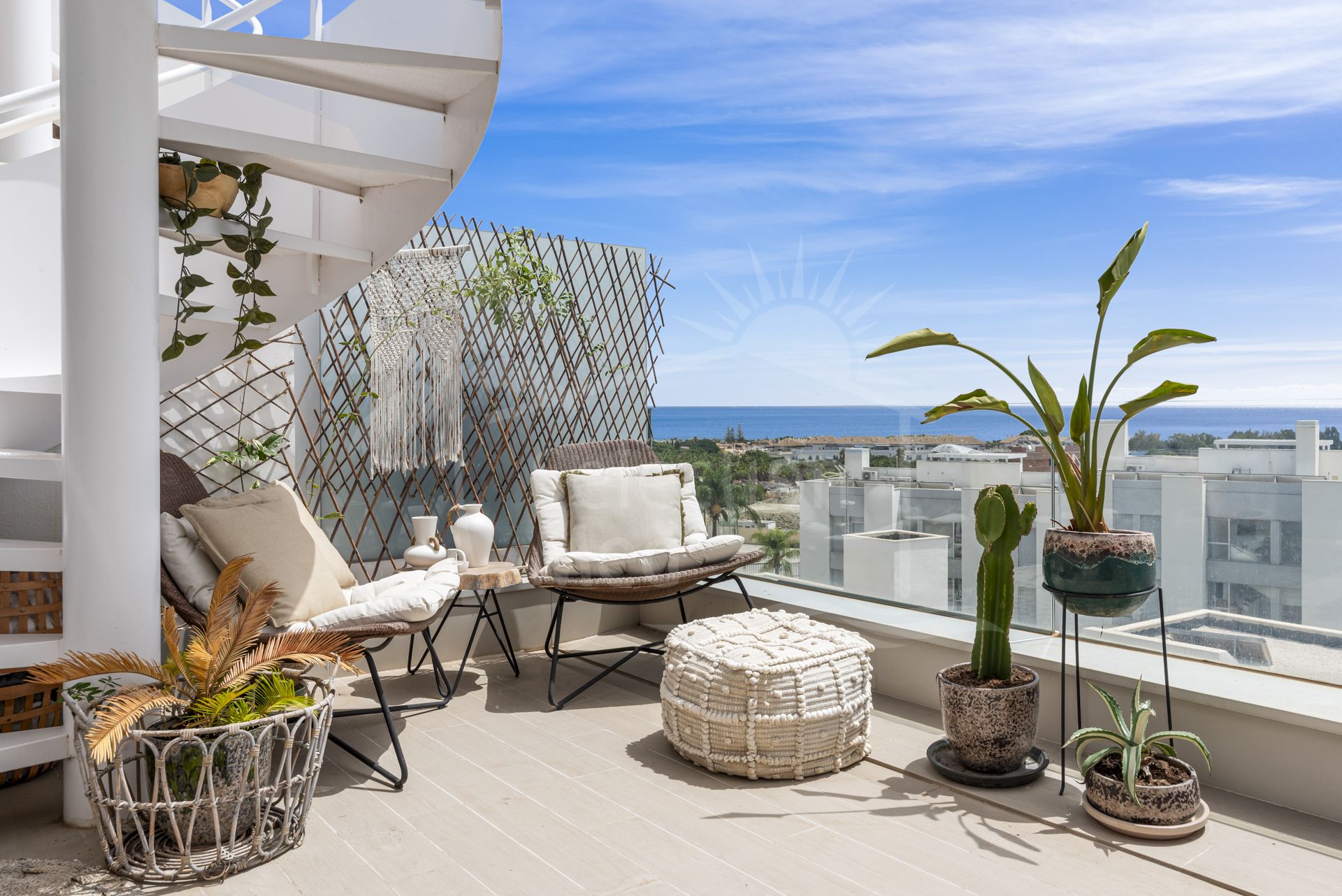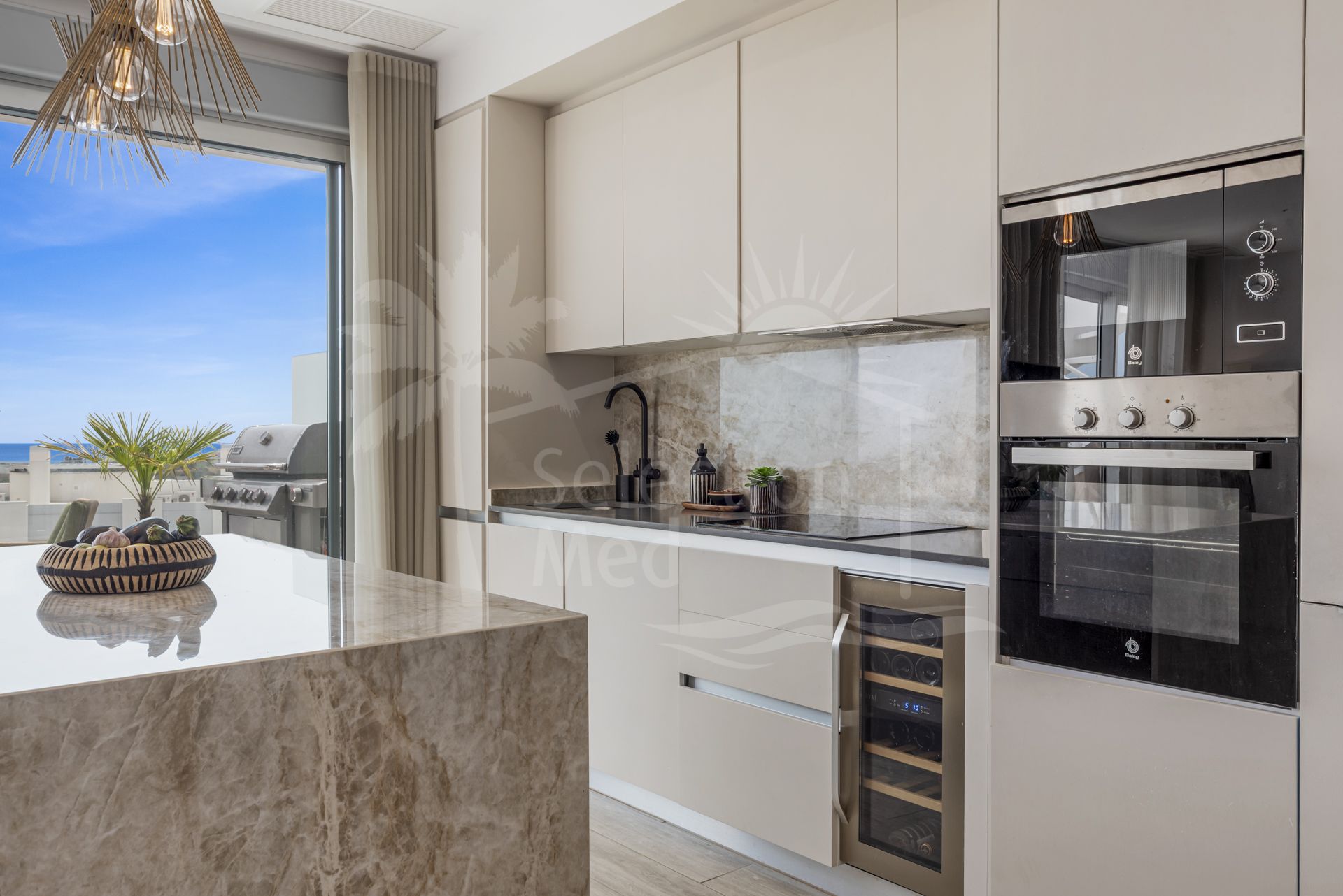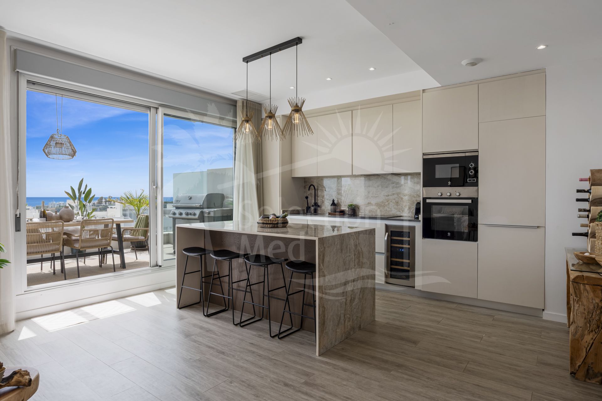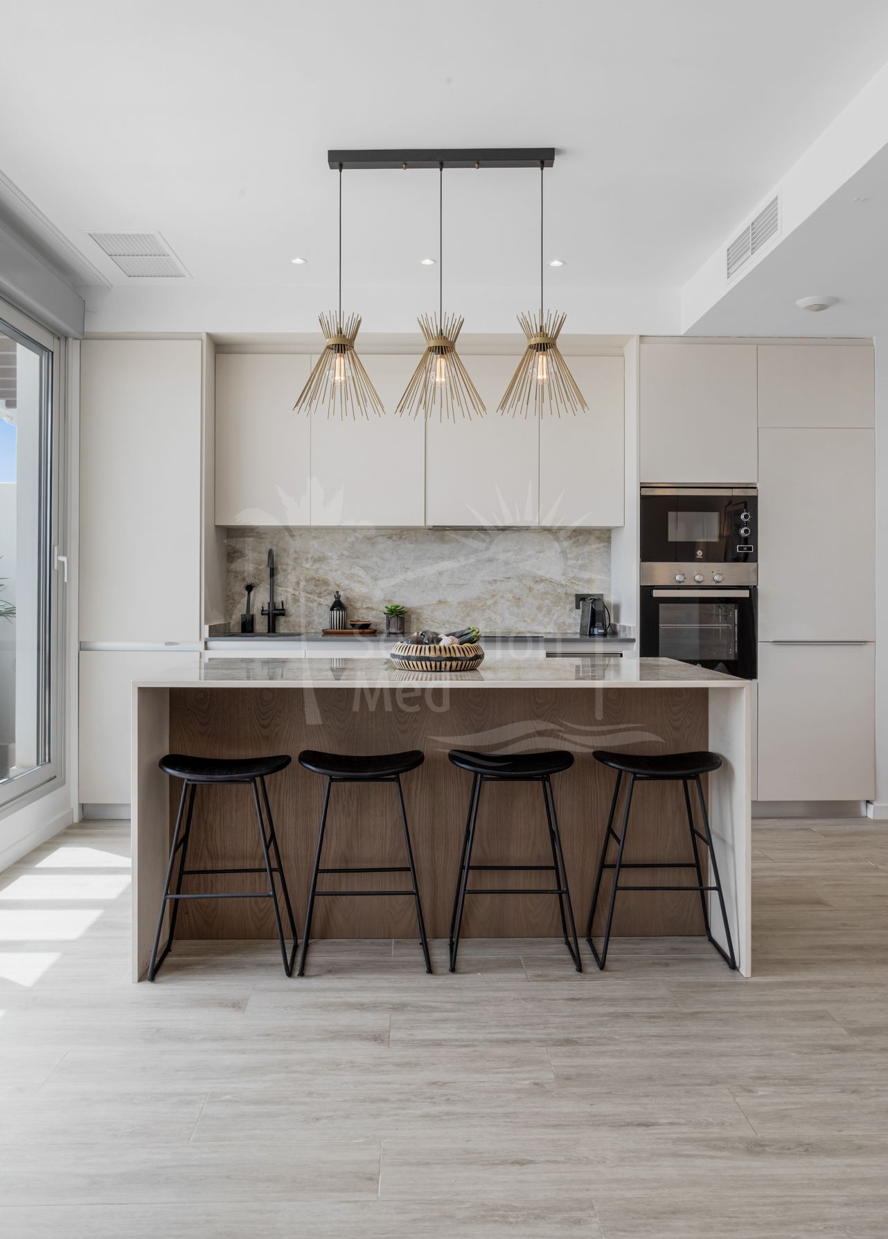Este ático de 2 dormitorios, de 2 baños, está situado en la exclusiva Fase Le Mirage III de la Nueva Milla de Oro, que ofrece un espacio de vida moderno con un toque de lujo. El corazón de la casa es la elegante cocina de planta abierta, con una impresionante isla de mármol que sirve como un espacio de trabajo práctico y una sofisticada pieza central. La cocina fluye perfectamente en el luminoso salón y comedor, donde grandes puertas correderas de vidrio abren a una amplia terraza con vistas de gran alcance del Mediterráneo y el paisaje circundante.
