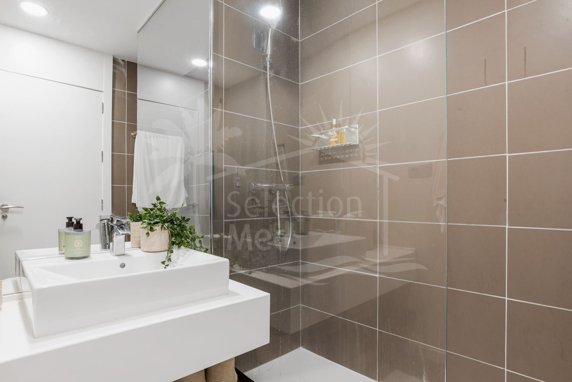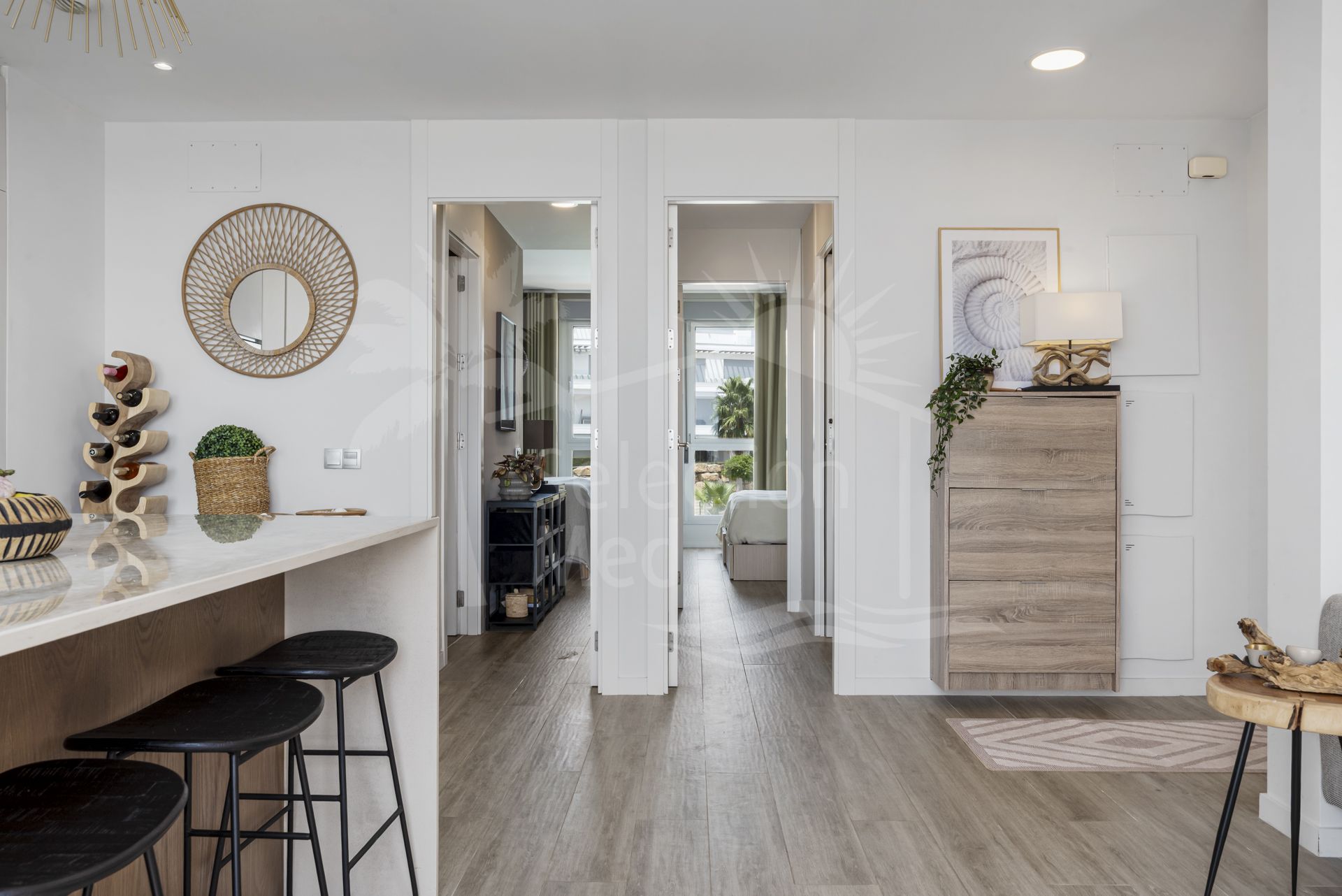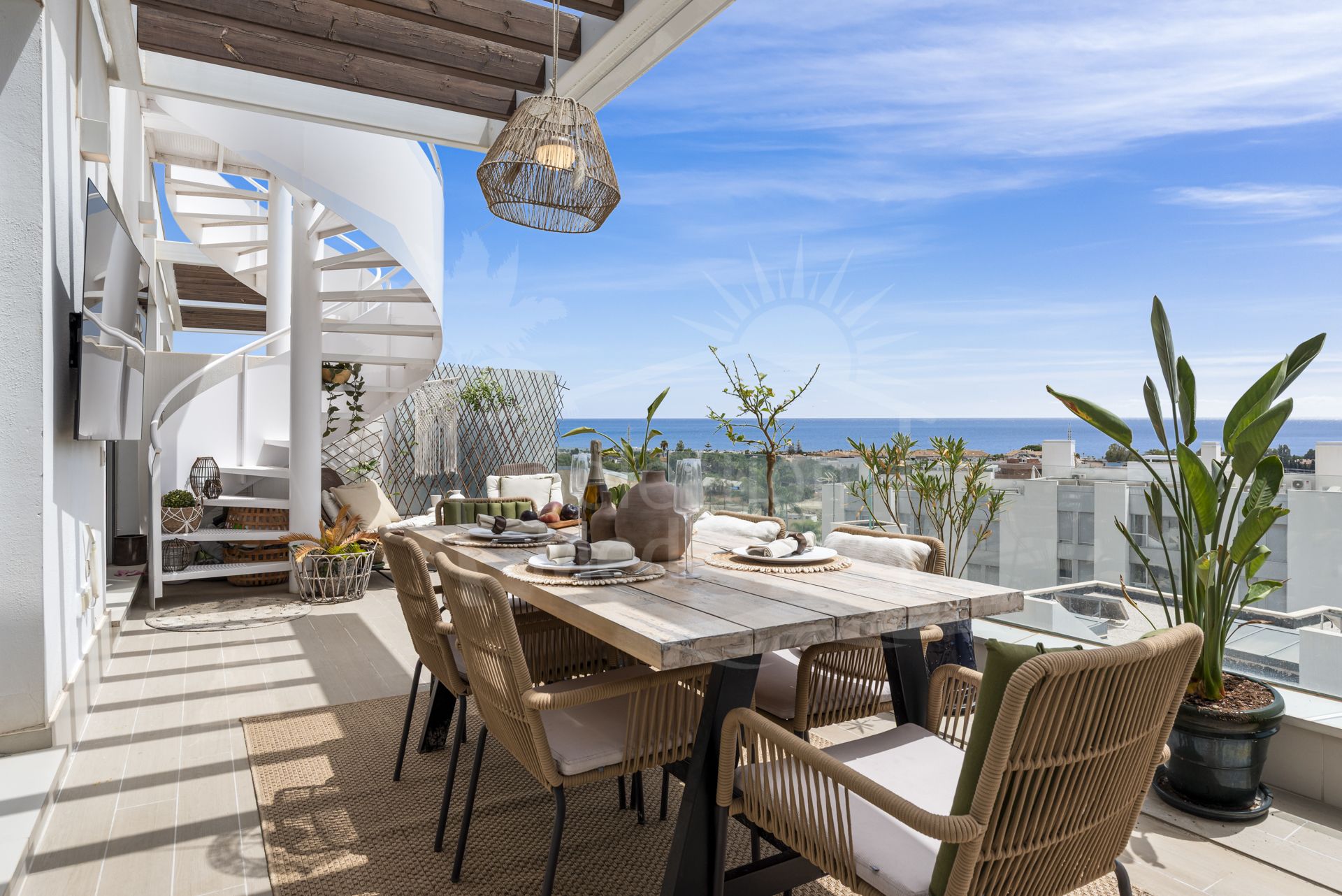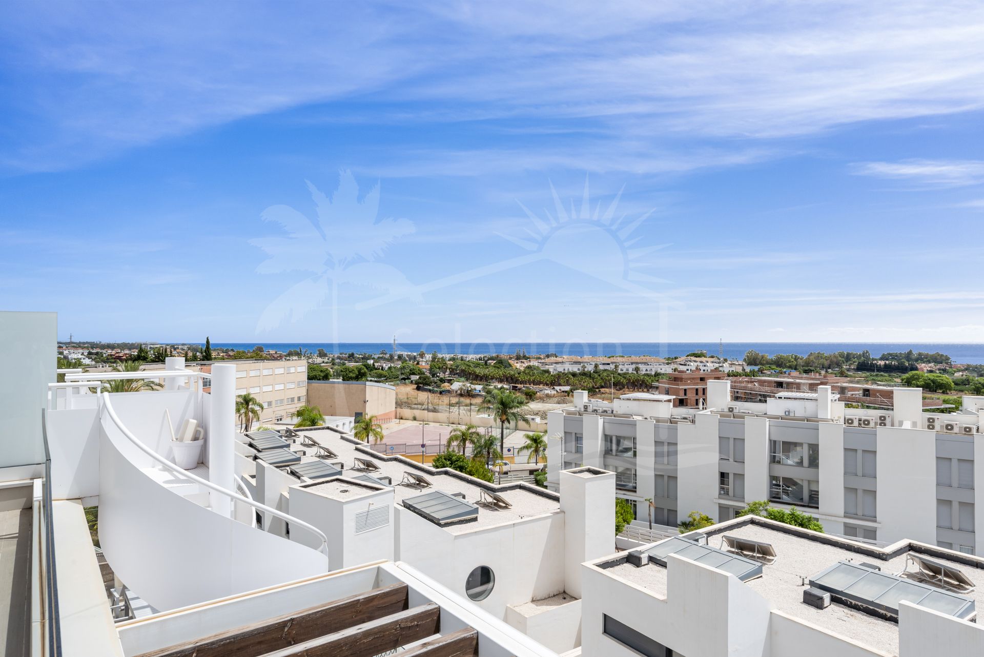 Este ático de 2 dormitorios, de 2 baños, está situado en la exclusiva Fase Le Mirage III de la Nueva Milla de Oro, que ofrece un espacio de vida moderno con un toque de lujo. El corazón de la casa es la elegante cocina de planta abierta, con una impresionante isla de mármol que sirve como un espacio de trabajo práctico y una sofisticada pieza central. La cocina fluye perfectamente en el luminoso salón y comedor, donde grandes puertas correderas de vidrio abren a una amplia terraza con vistas de gran alcance del Mediterráneo y el paisaje circundante.