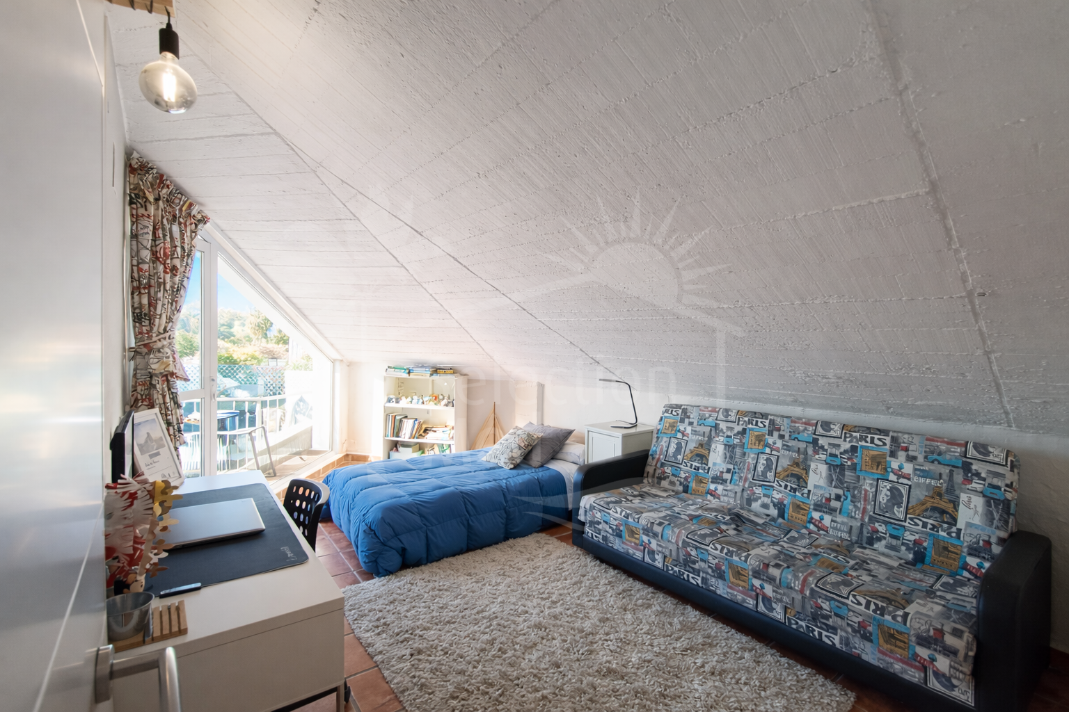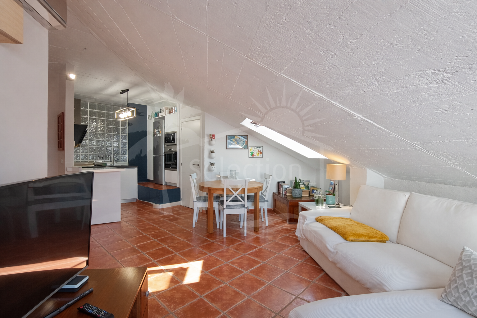 Ubicado en una quinta planta de un edificio en muy buen estado en el centro de Marbella, este ático abuhardillado de 104 m² destaca por su carácter, luminosidad y vistas panorámicas despejadas a la montaña y al casco urbano.