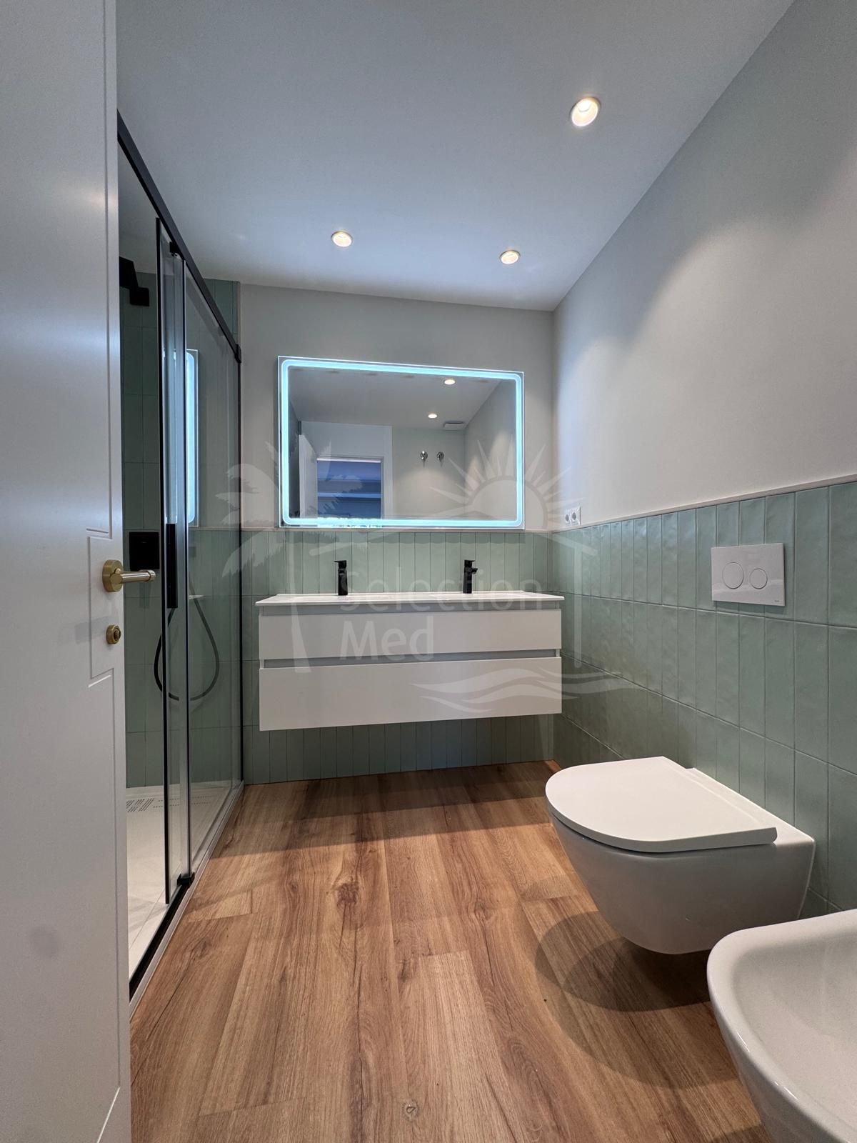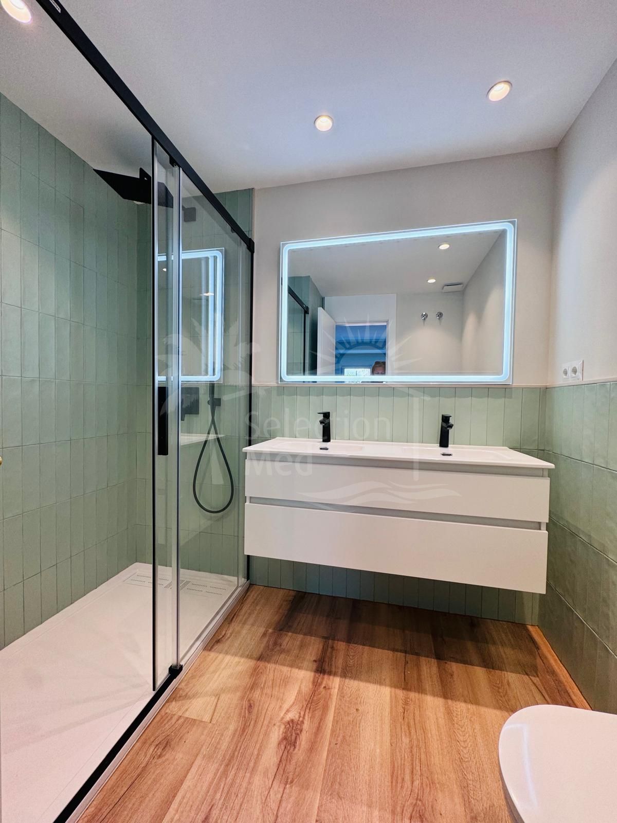 Con 92 m² de espacio interior impecablemente renovado y un jardín privado de 41 m², esta joya con orientación este ha sido actualizada a los más altos estándares: nueva fontanería, electricidad, aire acondicionado y ventanas de alta calidad con persianas eléctricas para óptima eficiencia energética y confort. La distribución pensada incluye dos dormitorios amplios con armarios empotrados, dos baños modernos, un luminoso salón integrado con cocina abierta y acceso directo al jardín —perfecto para relax al aire libre entre exuberante vegetación—. Se vende totalmente amueblado y decorado en estilo contemporáneo, listo para entrar a vivir.