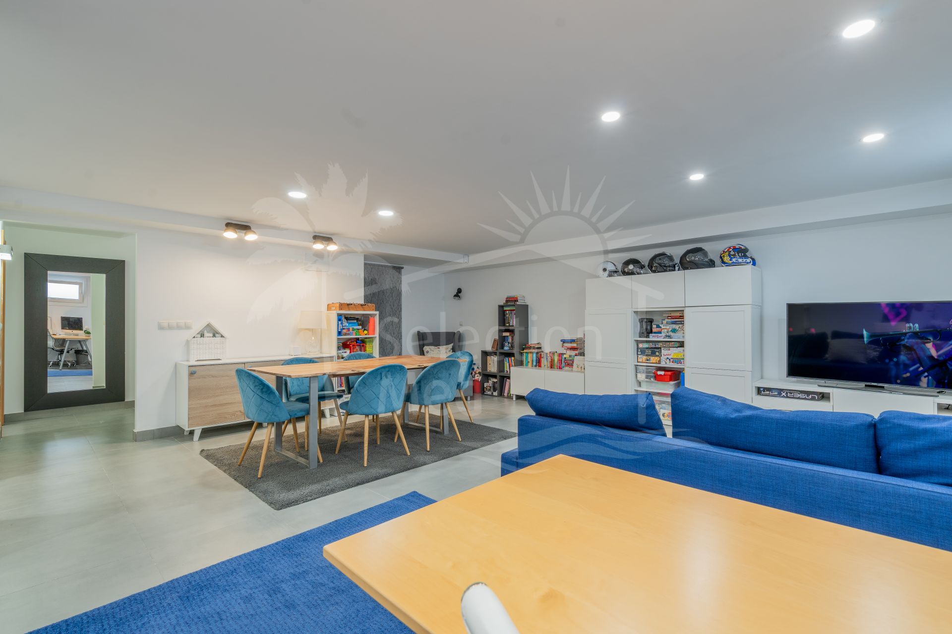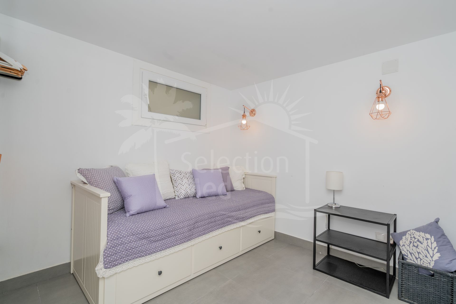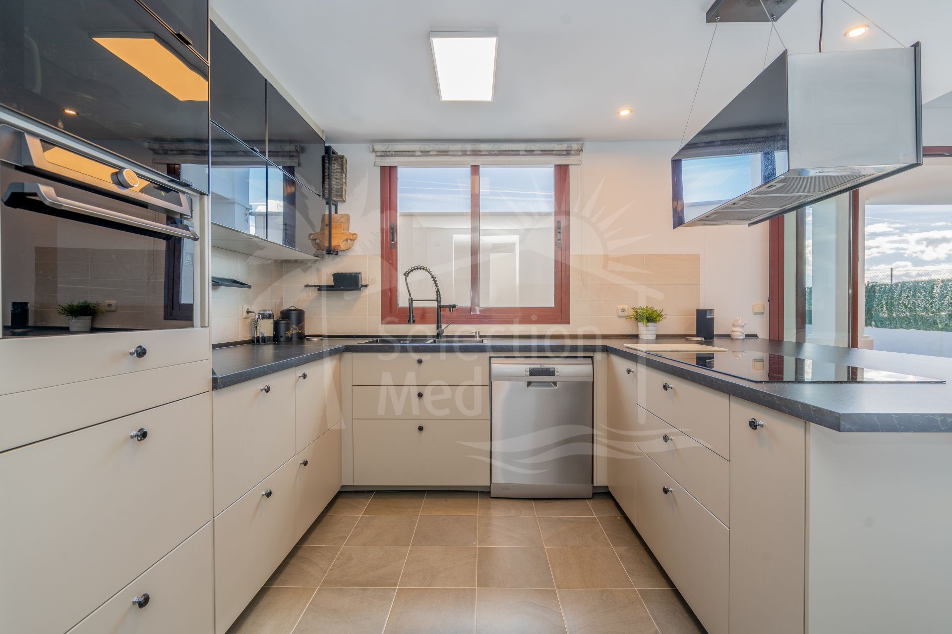 Bajando las escaleras, la casa se abre a un luminoso salón con una moderna cocina abierta — renovada con esmero y buen gusto por los actuales propietarios para su propio disfrute, no solo para la venta. Desde aquí se accede a su propio patio con piscina, espacio para comer y zona de barbacoa. Es perfecto para desayunos tranquilos, largas comidas y atardeceres dorados que nunca cansan.