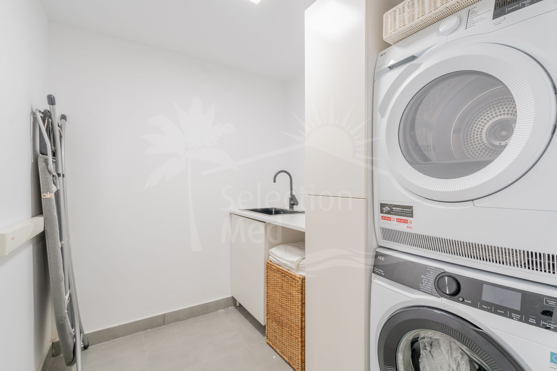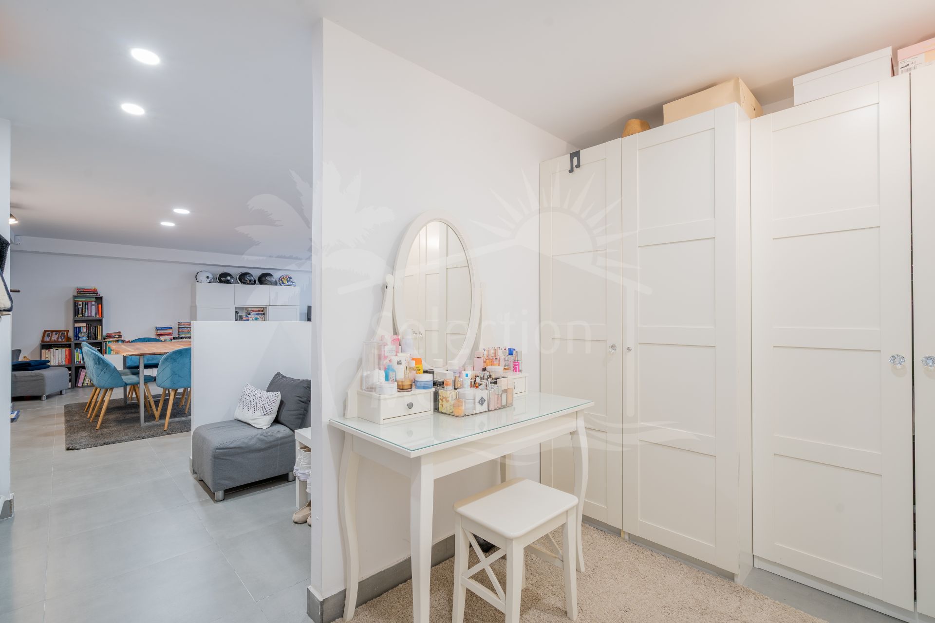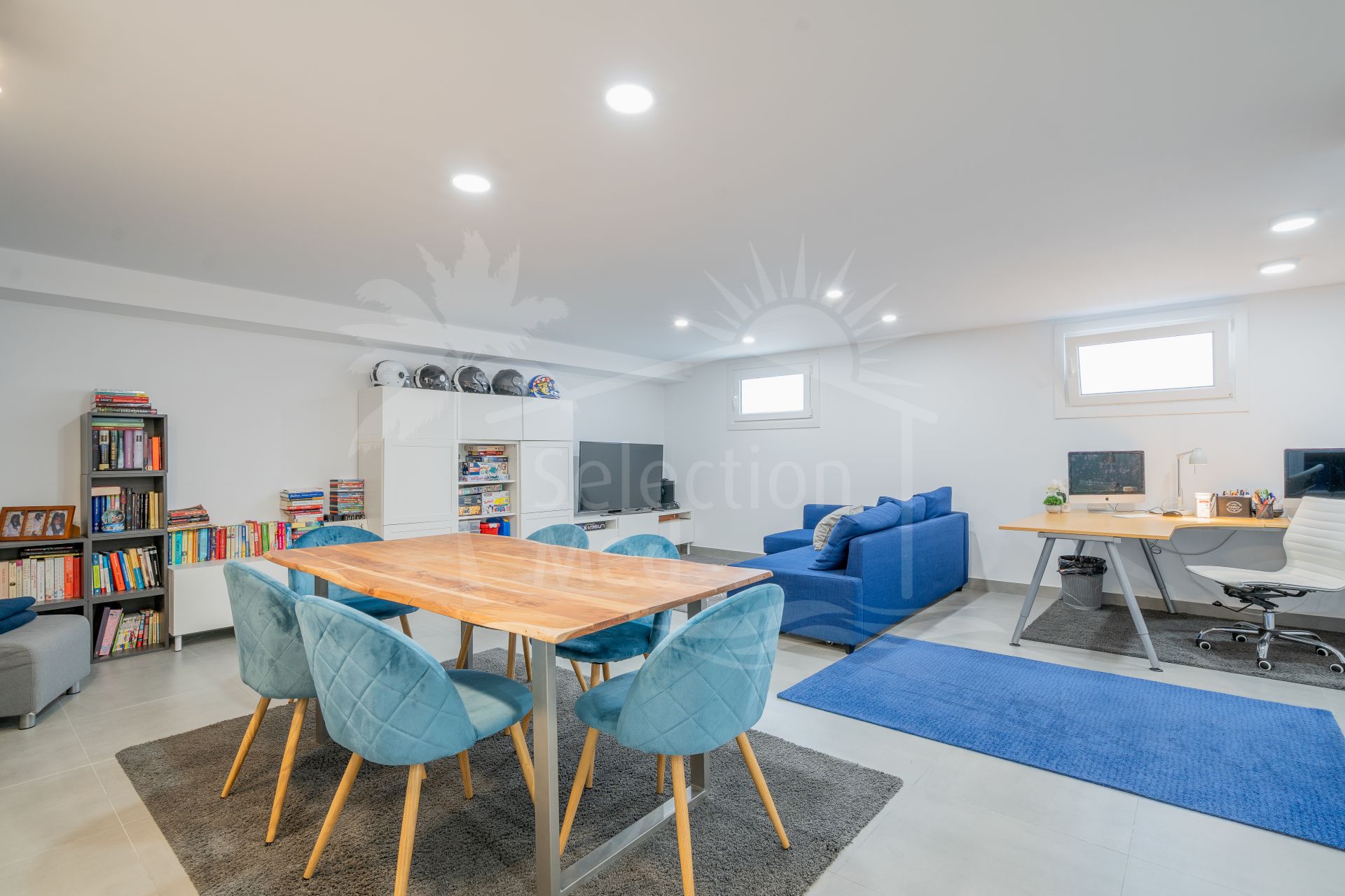 Bajando las escaleras, la casa se abre a un luminoso salón con una moderna cocina abierta — renovada con esmero y buen gusto por los actuales propietarios para su propio disfrute, no solo para la venta. Desde aquí se accede a su propio patio con piscina, espacio para comer y zona de barbacoa. Es perfecto para desayunos tranquilos, largas comidas y atardeceres dorados que nunca cansan.