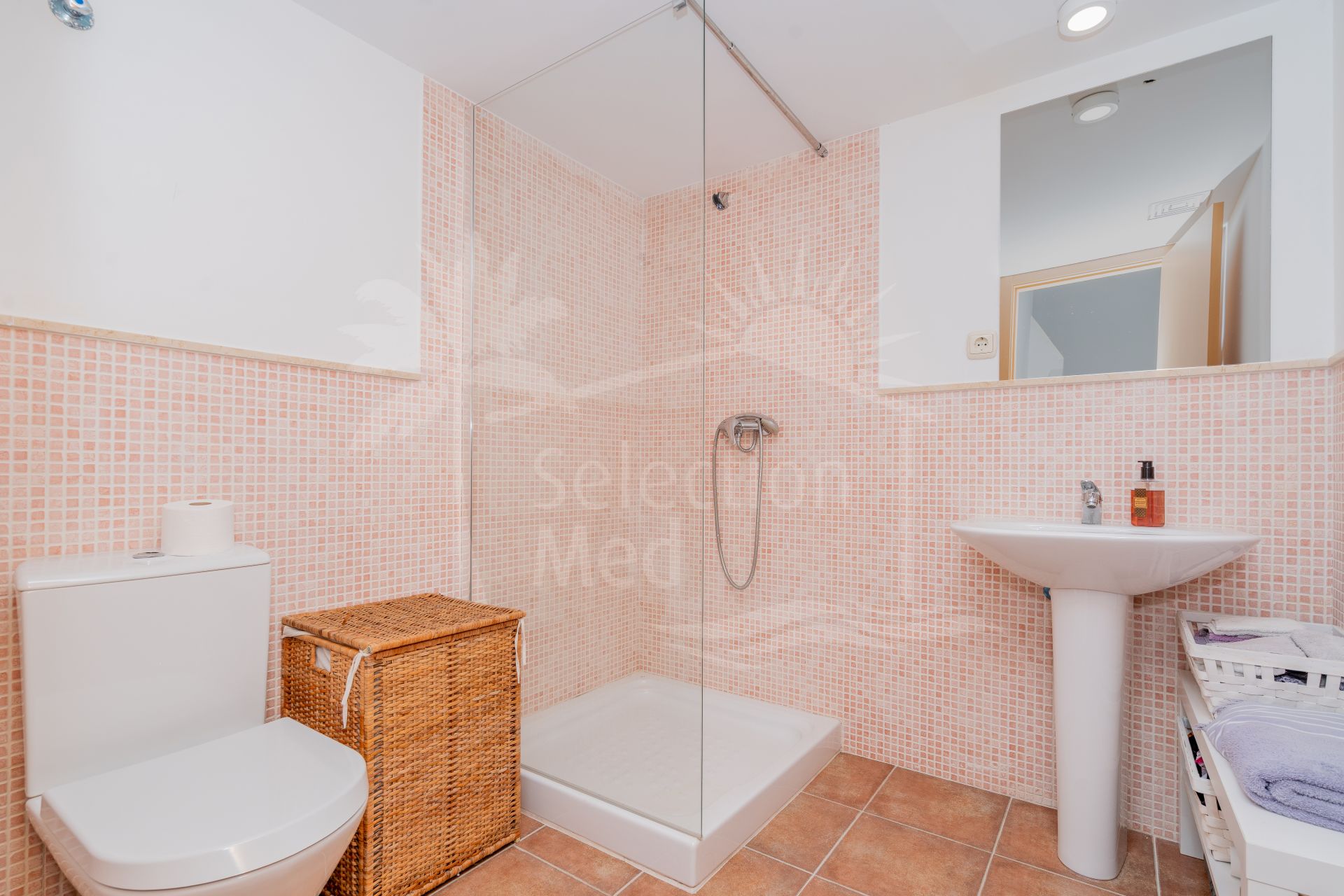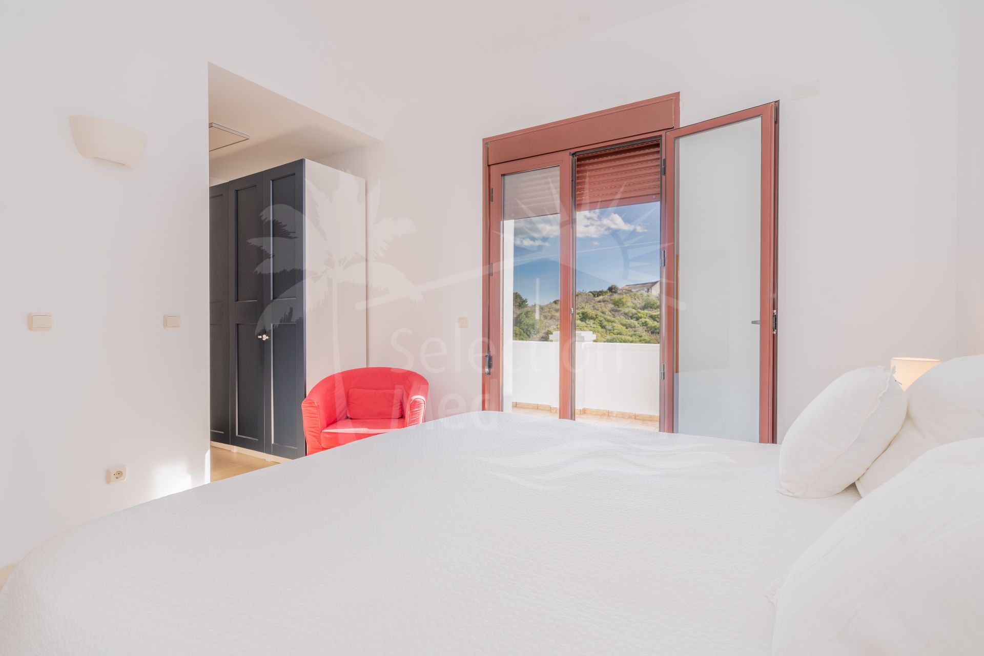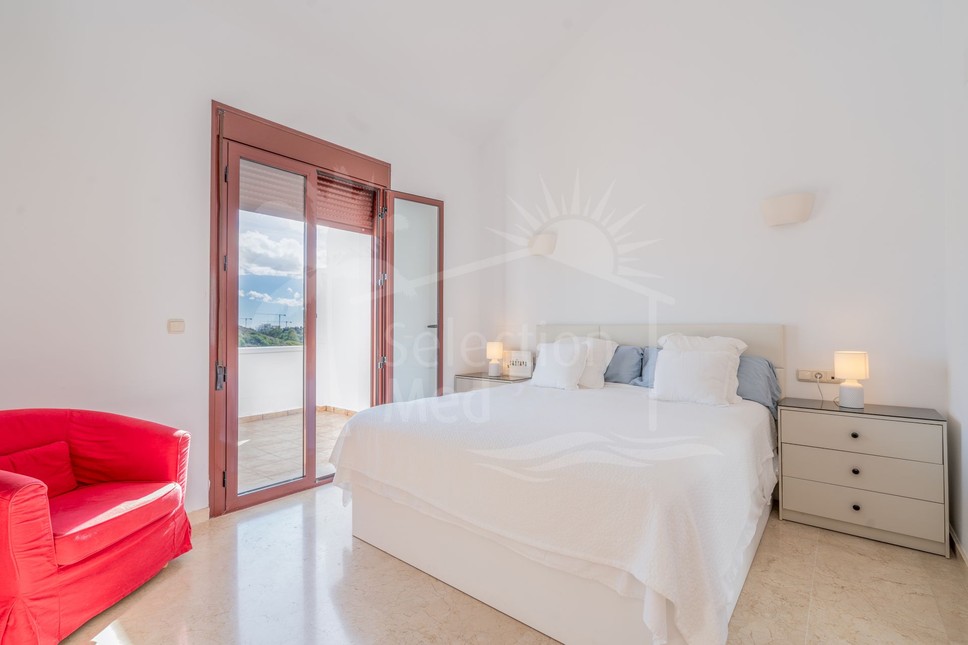 En la planta principal encontrará dos amplios dormitorios, cada uno con su propio baño. El dormitorio principal dispone de vestidor y una gran terraza privada con vistas abiertas a las colinas verdes, un poco de mar e incluso parte del campo de golf. Techos altos, mucha luz y esa sensación instantánea de confort al entrar.