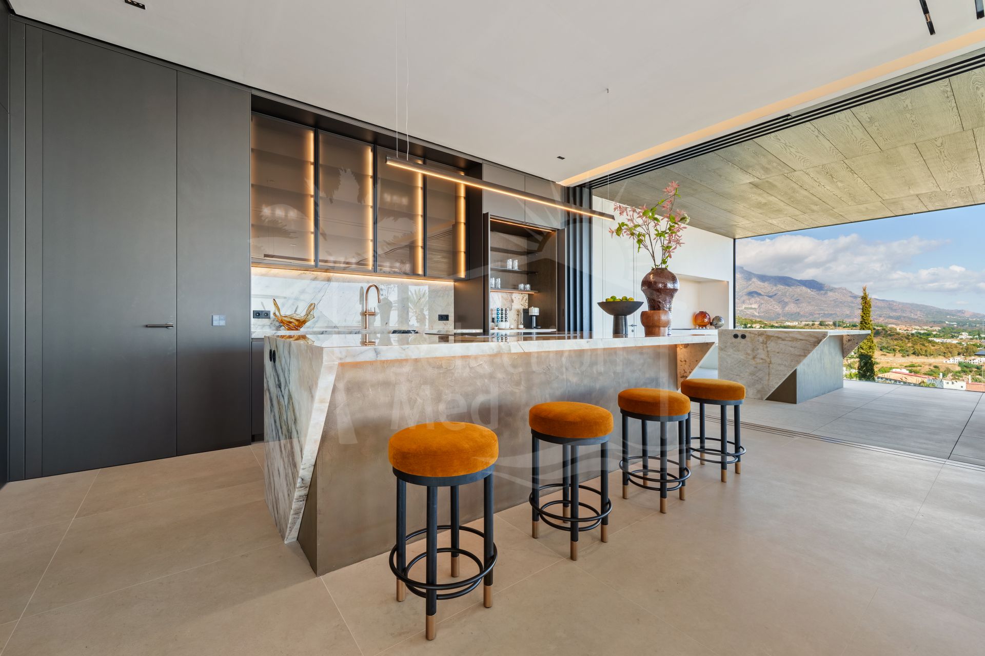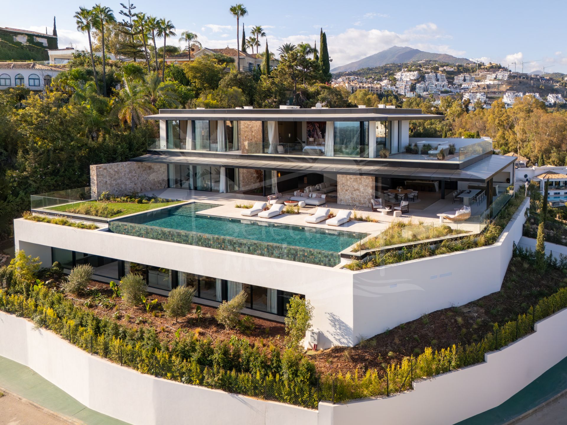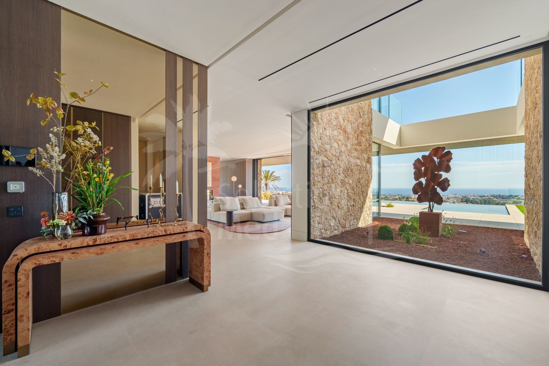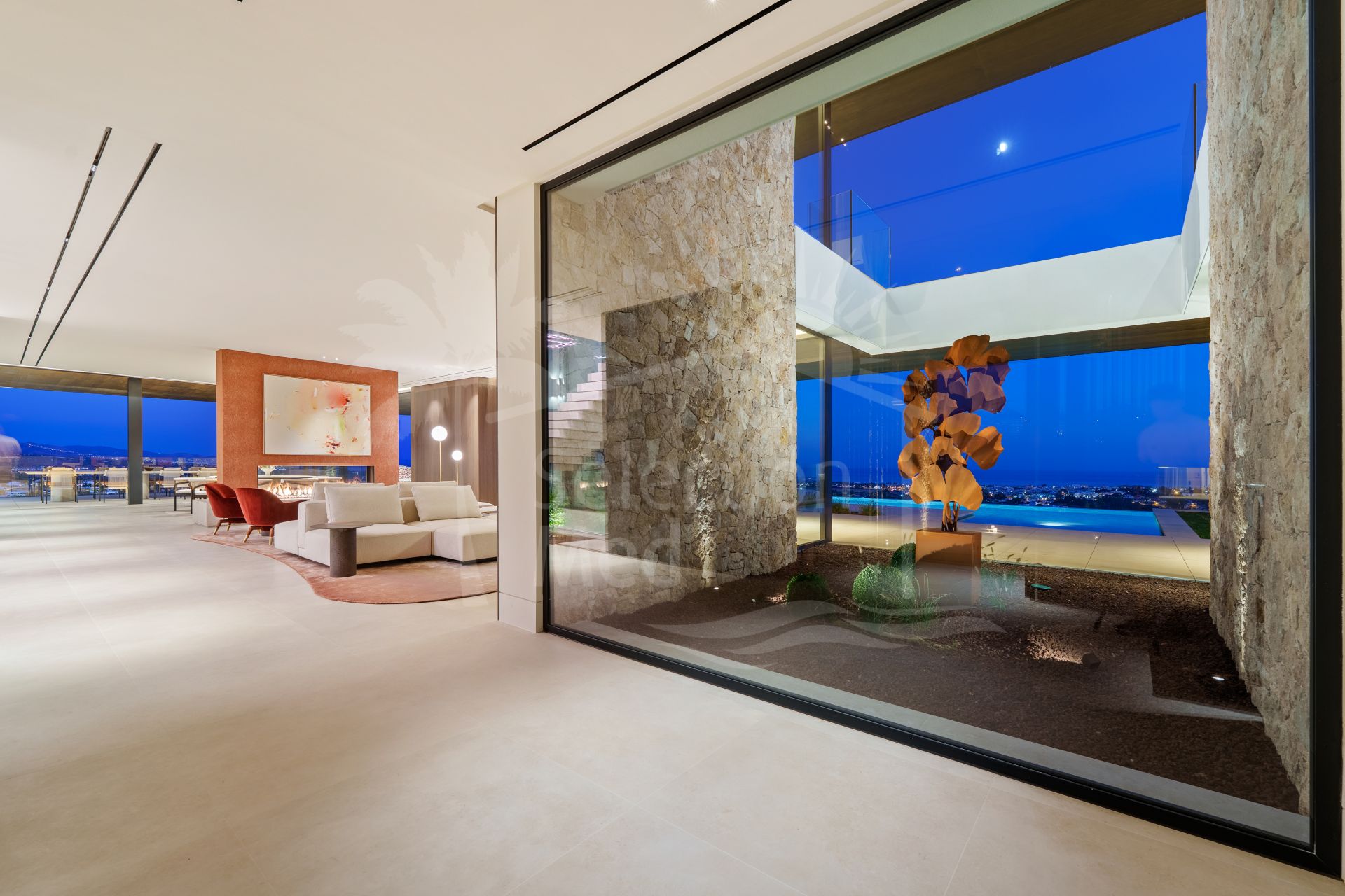 Situada en lo alto de La Quinta en la exclusiva comunidad cerrada de El Herrojo Alto, esta extraordinaria villa contemporánea de 9 dormitorios ofrece impresionantes vistas panorámicas sobre el Mediterráneo, Gibraltar y la costa africana. Diseñada con precisión arquitectónica, la residencia combina perfectamente la sofisticación moderna con materiales naturales, creando una atmósfera cálida y acogedora en todas partes.
