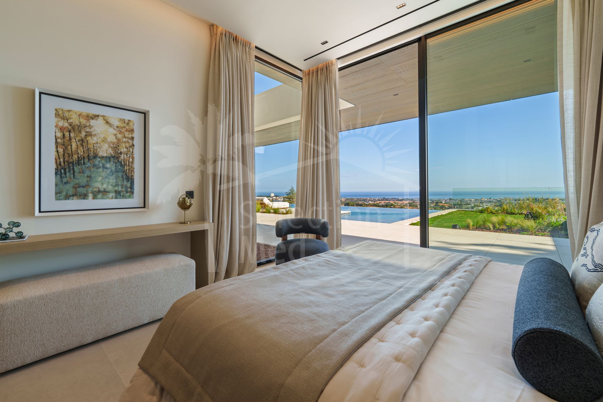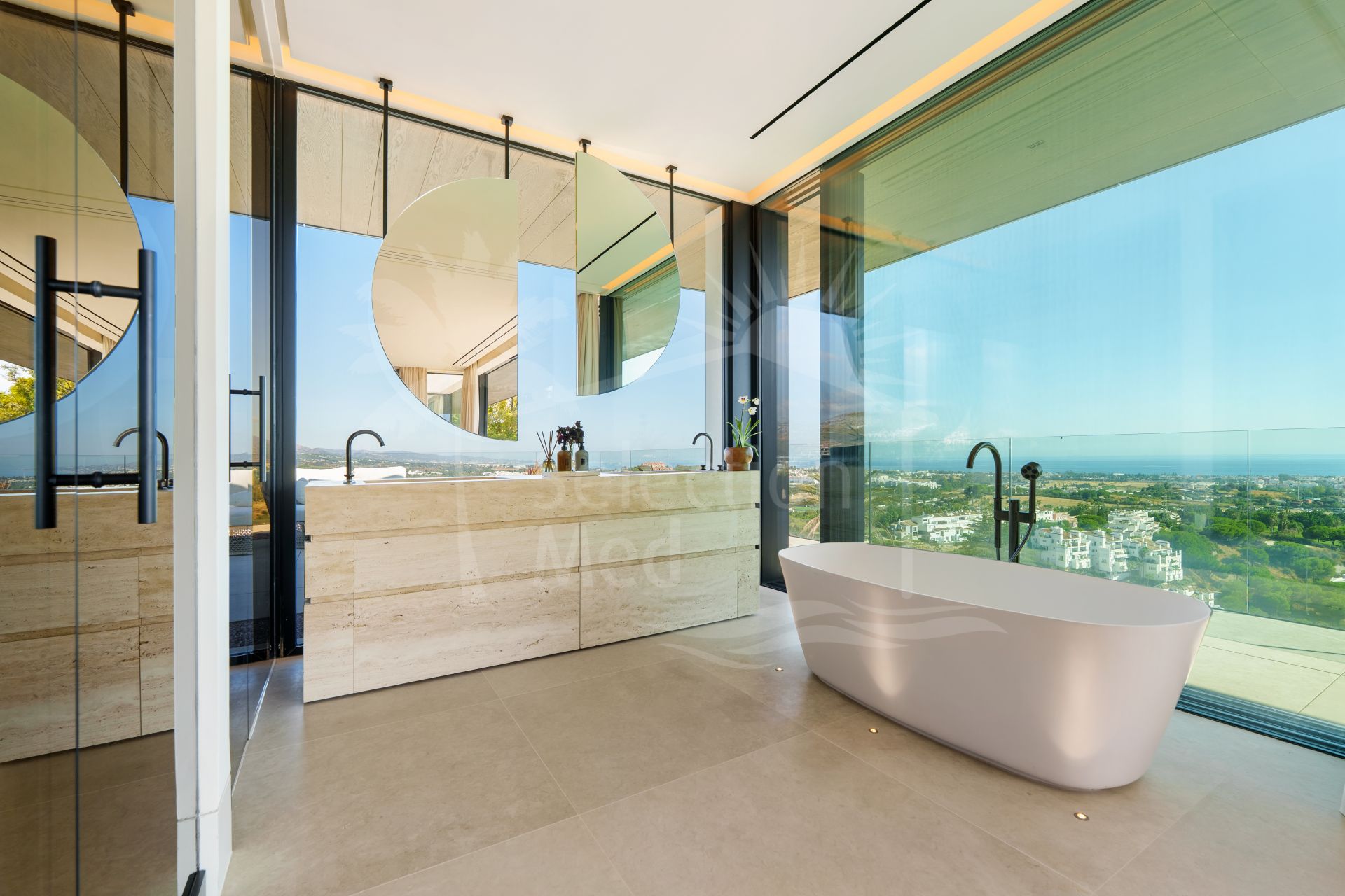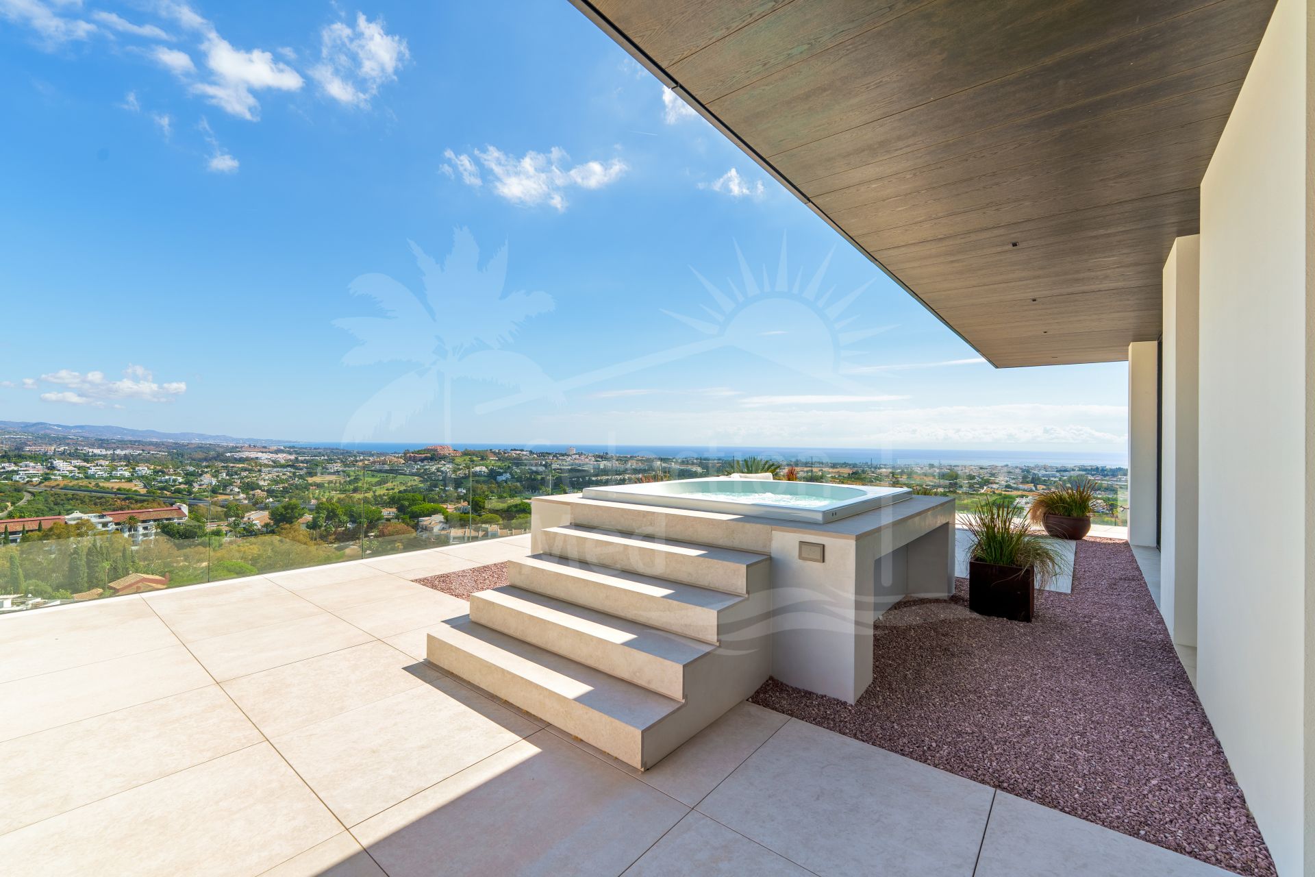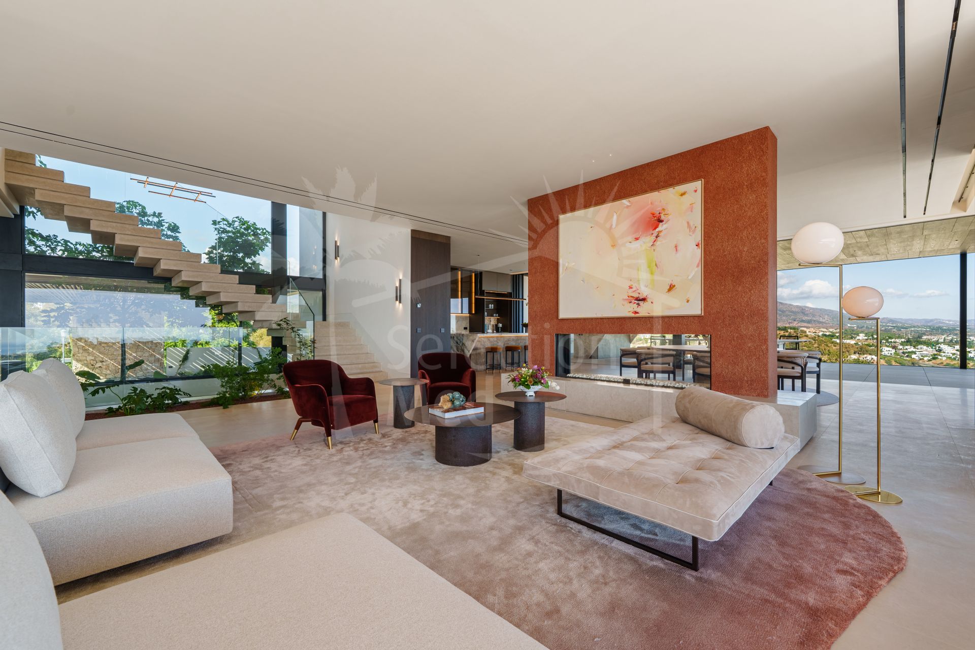 Situada en lo alto de La Quinta en la exclusiva comunidad cerrada de El Herrojo Alto, esta extraordinaria villa contemporánea de 9 dormitorios ofrece impresionantes vistas panorámicas sobre el Mediterráneo, Gibraltar y la costa africana. Diseñada con precisión arquitectónica, la residencia combina perfectamente la sofisticación moderna con materiales naturales, creando una atmósfera cálida y acogedora en todas partes.