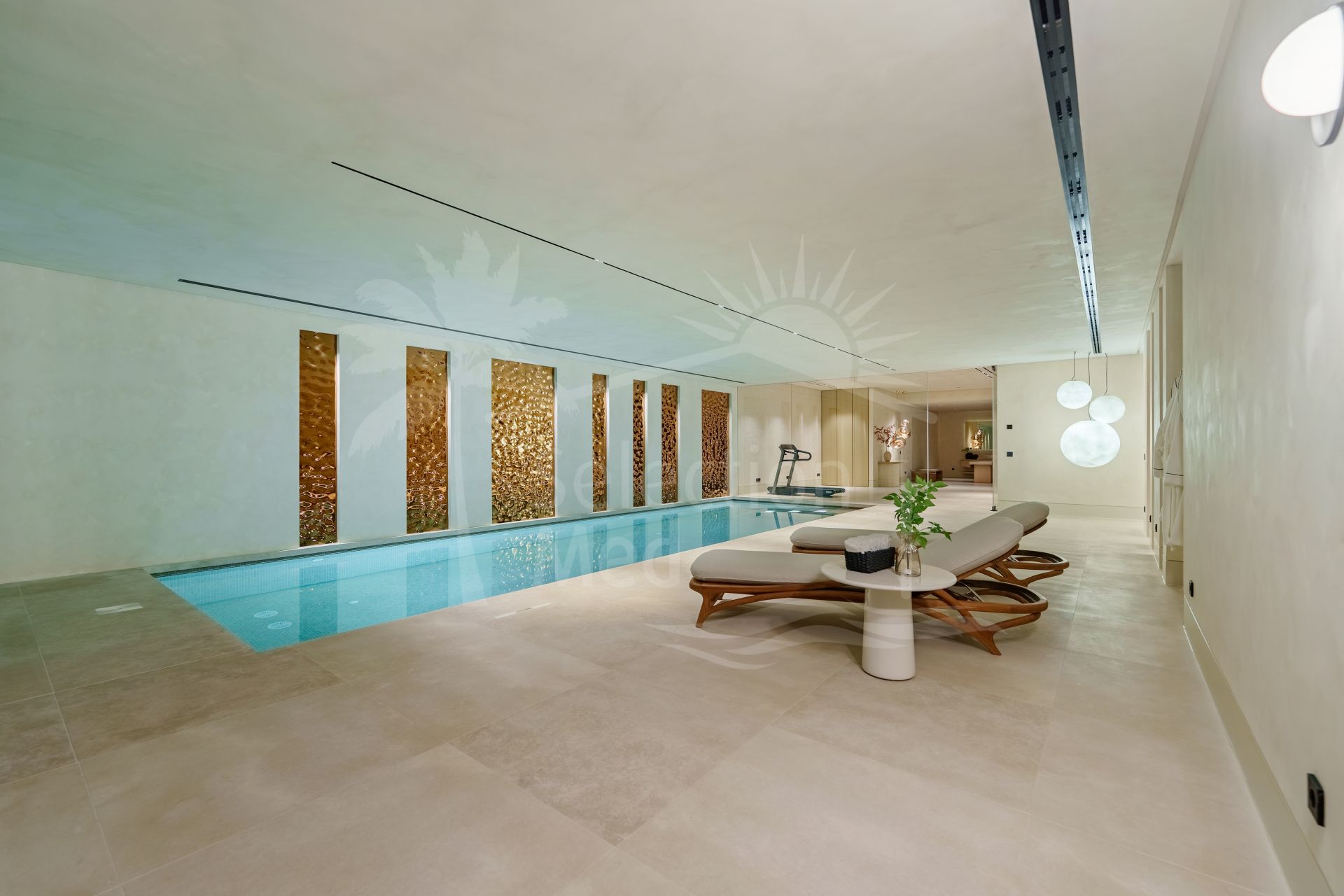 El nivel inferior abarca casi 800 m² y está dedicado al ocio y al bienestar. Incluye múltiples salones, una sala de cine, sala de juegos, gimnasio totalmente equipado y un spa privado con piscina cubierta y jacuzzi, todo diseñado para maximizar la luz natural y las vistas.