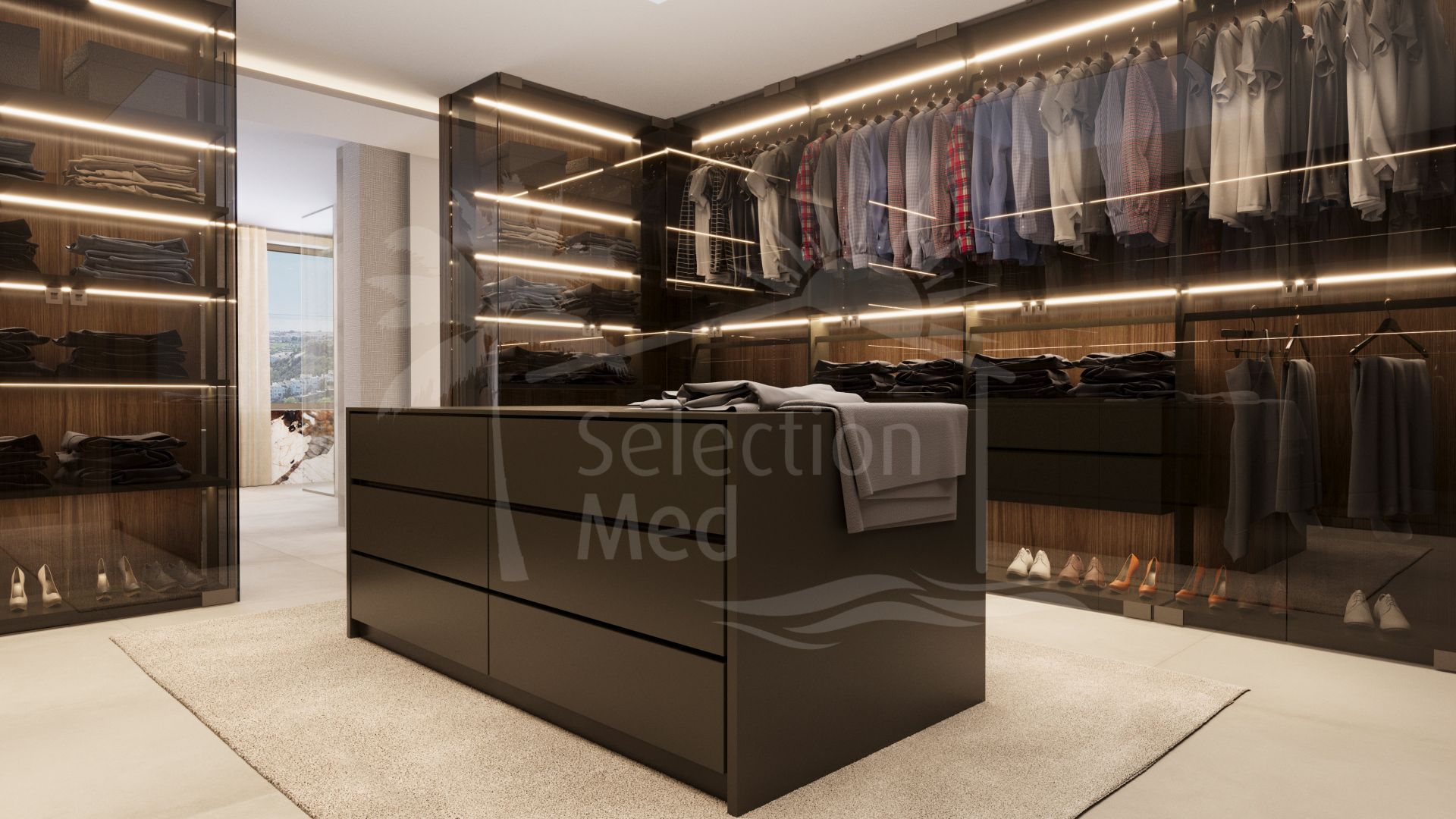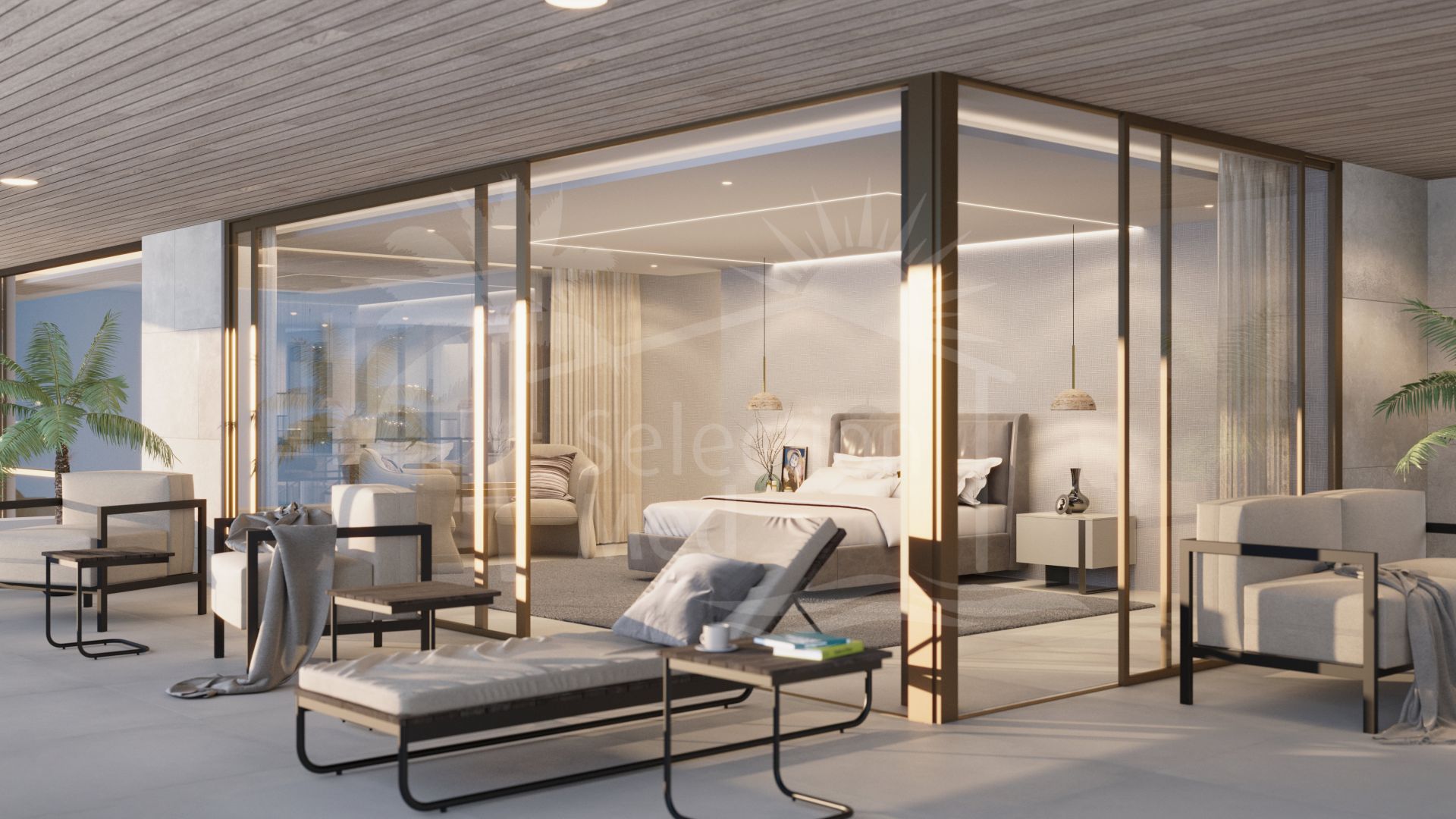La primera planta también tiene dos alas. En el ala izquierda se encuentra el espacioso dormitorio principal con baño en suite, aseo y vestidor, que incluye una isla central para guardar los objetos más valiosos de su armario, como joyas y bolsos exclusivos. La isla también incluye un elemento oculto. La terraza privada del dormitorio principal incluye una zona chill-out y tumbonas. El ala izquierda también incluye un despacho y una biblioteca, donde las ventanas también pueden abrirse por completo, de forma similar a la zona de estar. El ala derecha contiene otros dos dormitorios con baños en suite y terrazas privadas.