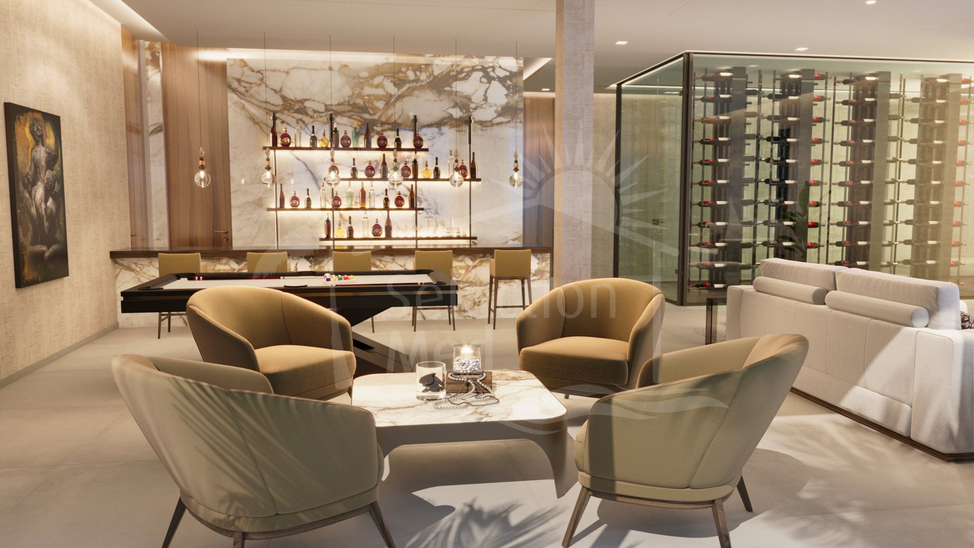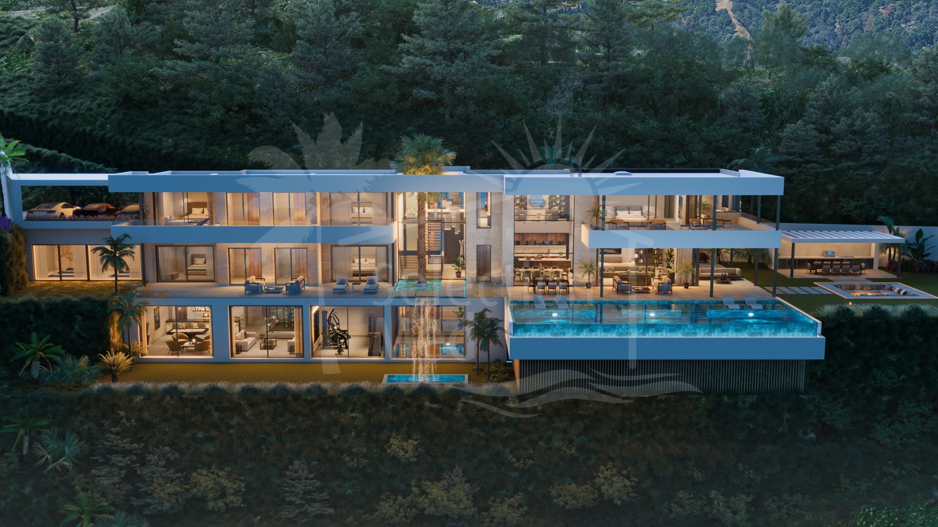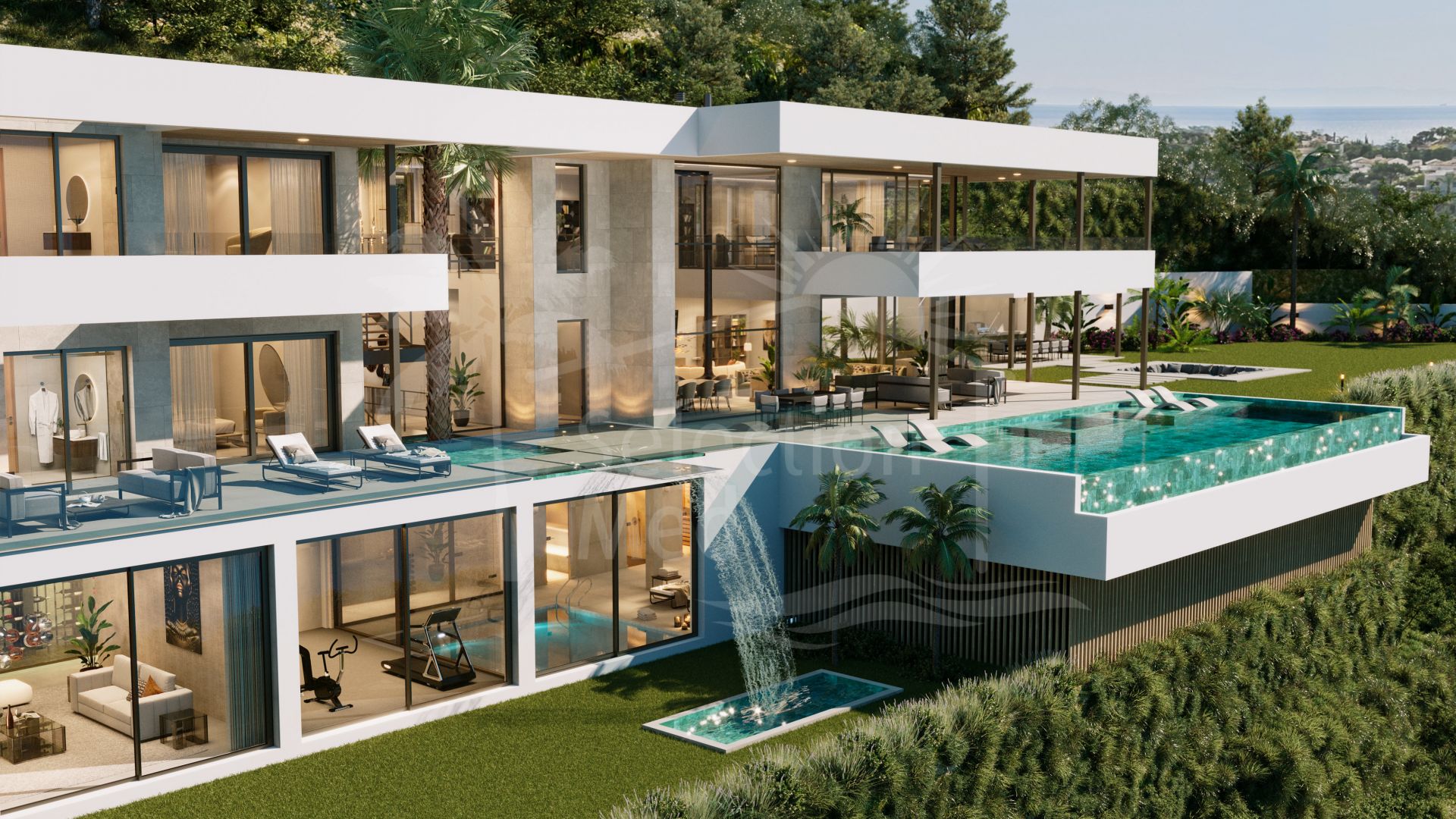 El nivel inferior incluye una bodega, un bar, una sala de cine, una sala multiusos con billar y zonas de relax, un gimnasio totalmente equipado y un spa con piscina cubierta climatizada, sauna, baño turco y ducha de hidromasaje. El gimnasio ofrece vistas panorámicas. El SPA no sólo ofrece impresionantes vistas de la costa, sino que también muestra la cascada de la villa. Además, este nivel incluye un apartamento de servicio con su propia zona de estar, cocina y baño, con entrada privada y acceso directo a la cocina principal de servicio.
