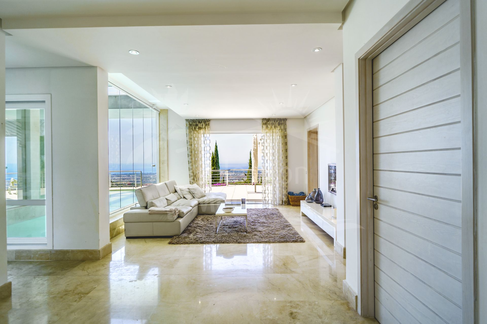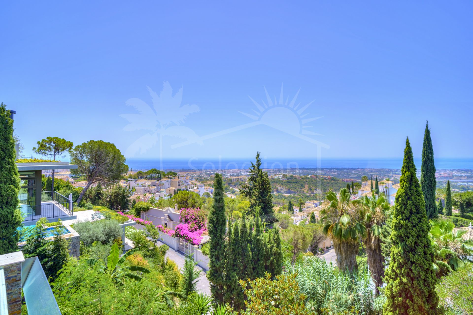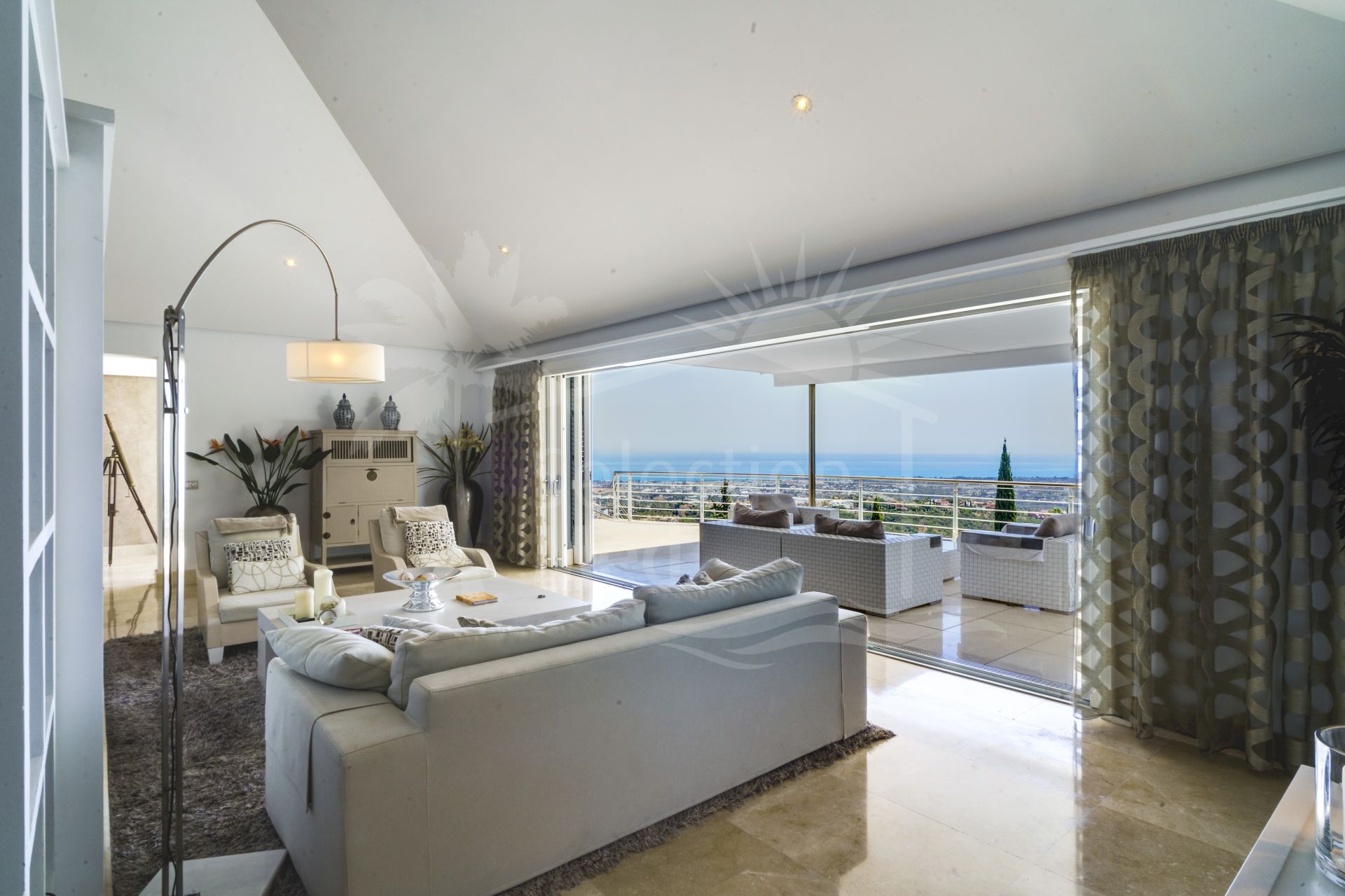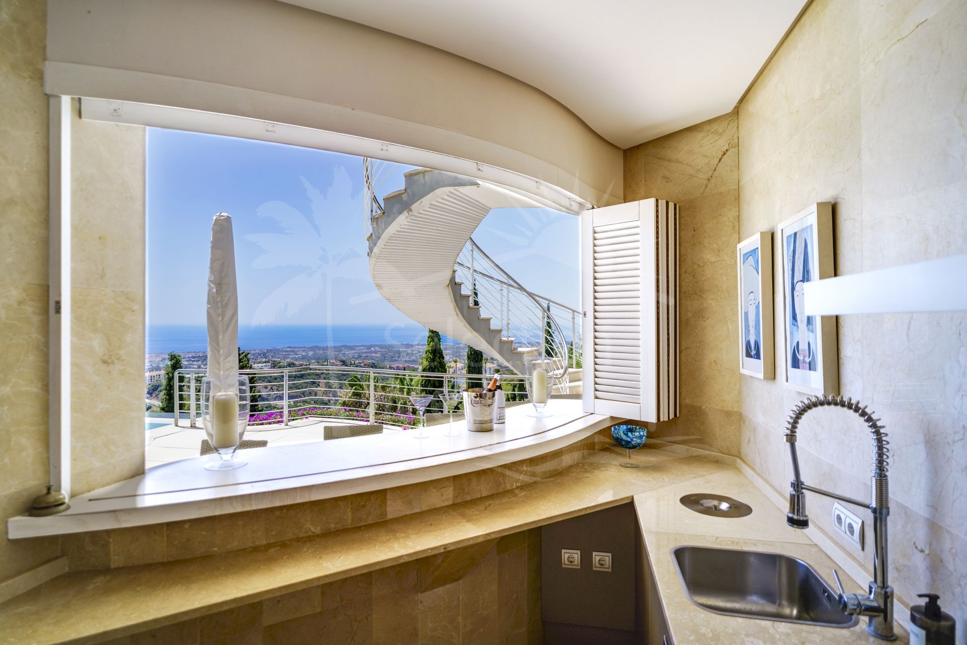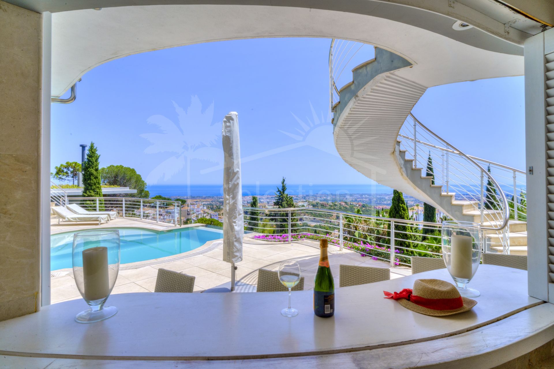 - La villa está situada en una posición elevada en el punto más alto de la urbanización, ofreciendo unas vistas panorámicas absolutamente impresionantes y excepcionales sobre todo el valle de Marbella – Estepona y su costa.