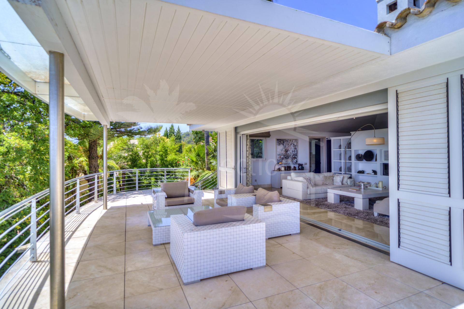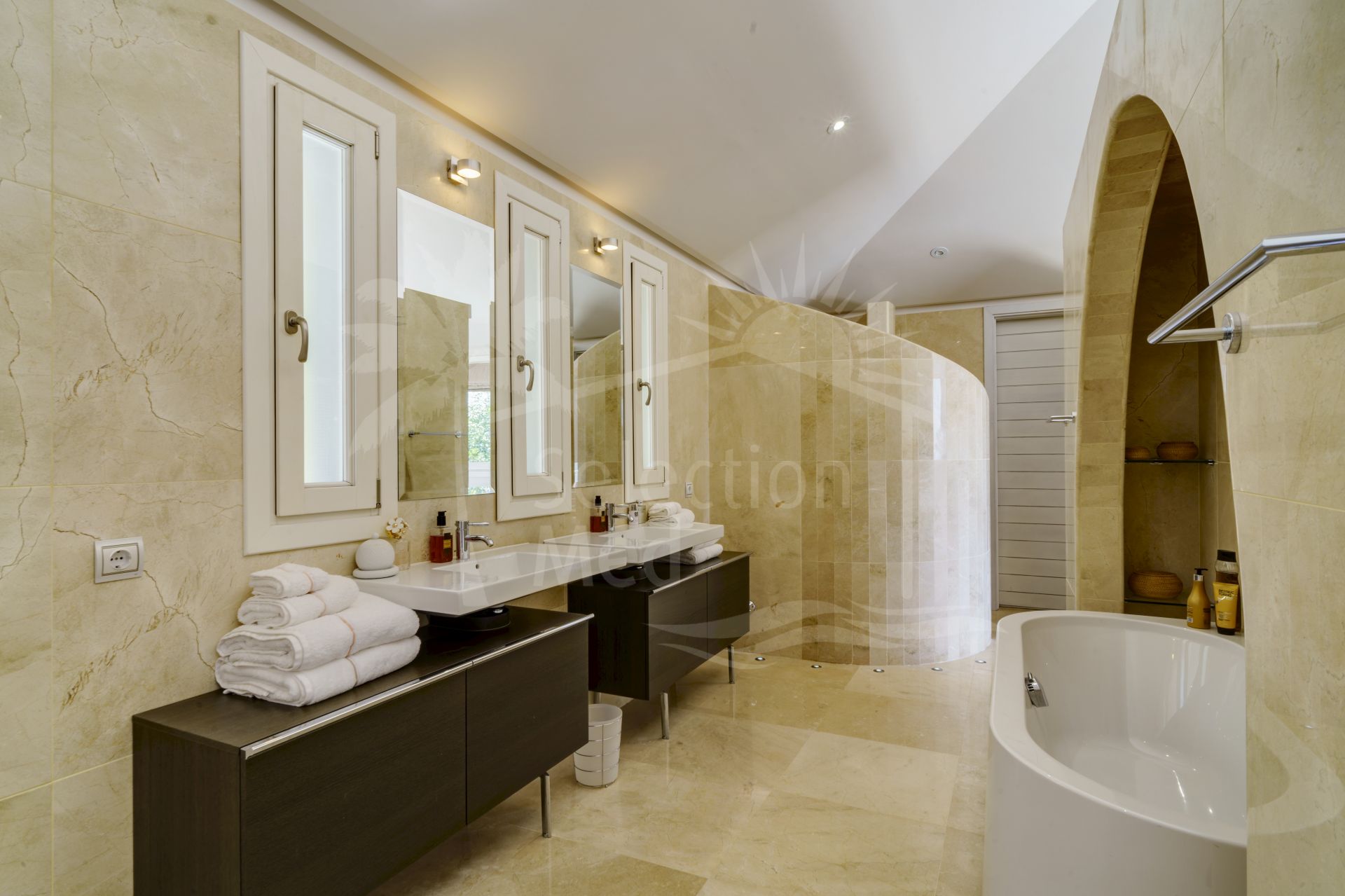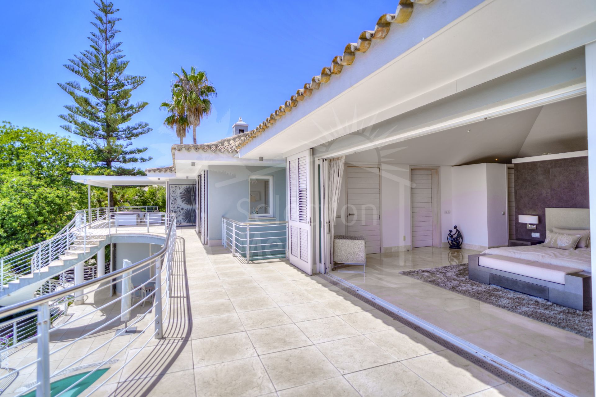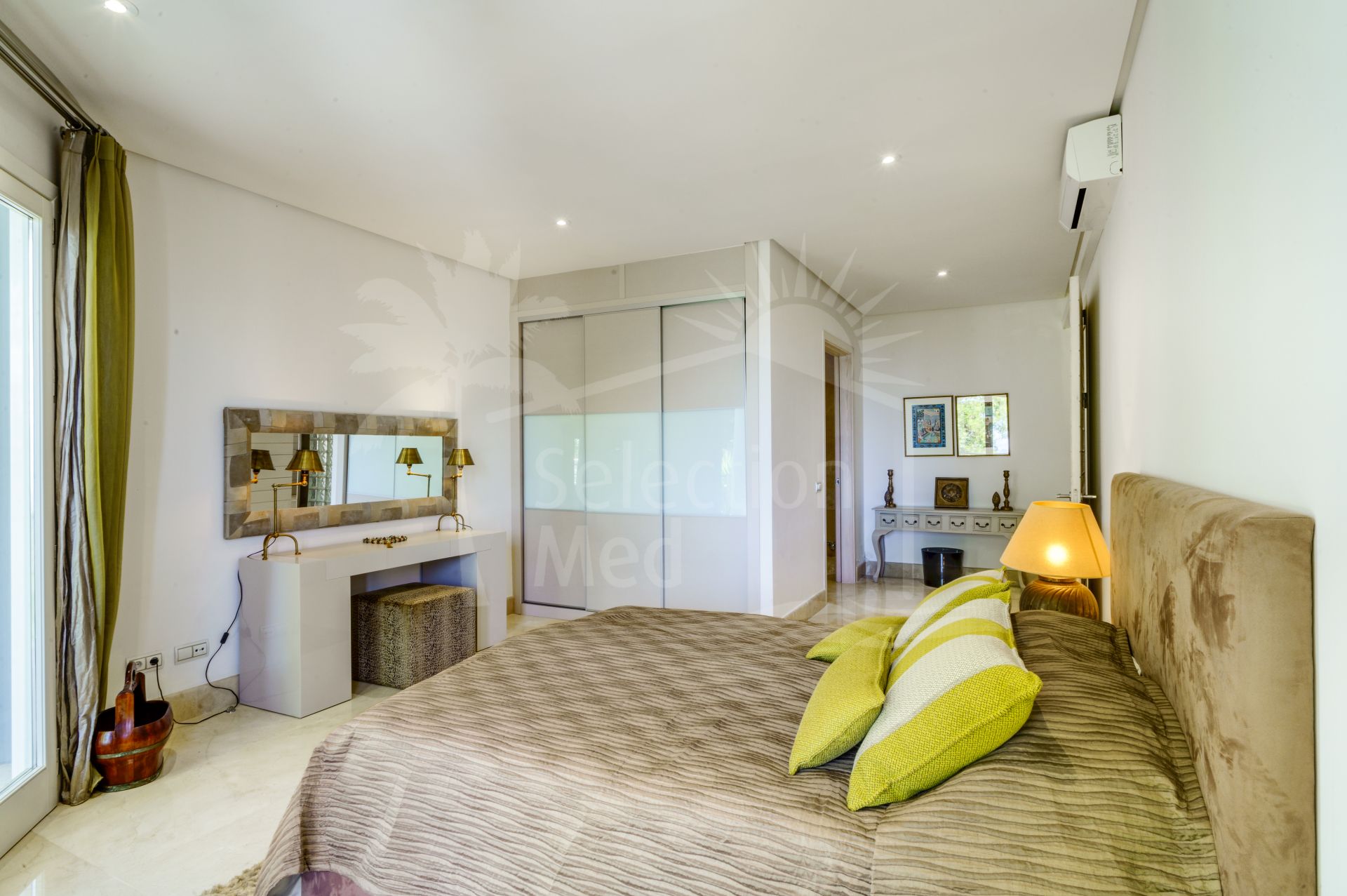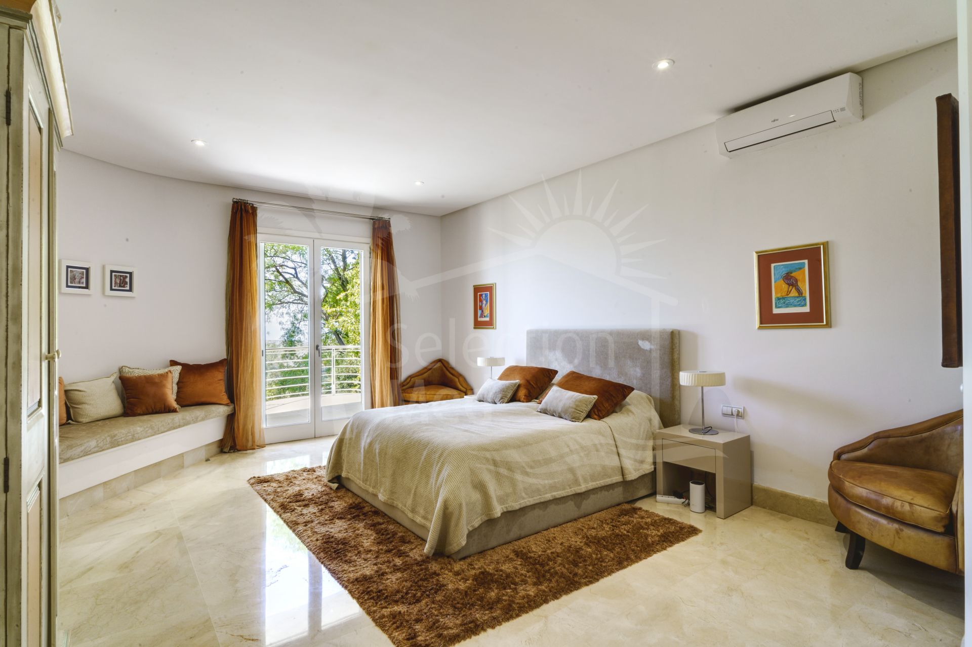 - La villa está situada en una posición elevada en el punto más alto de la urbanización, ofreciendo unas vistas panorámicas absolutamente impresionantes y excepcionales sobre todo el valle de Marbella – Estepona y su costa.