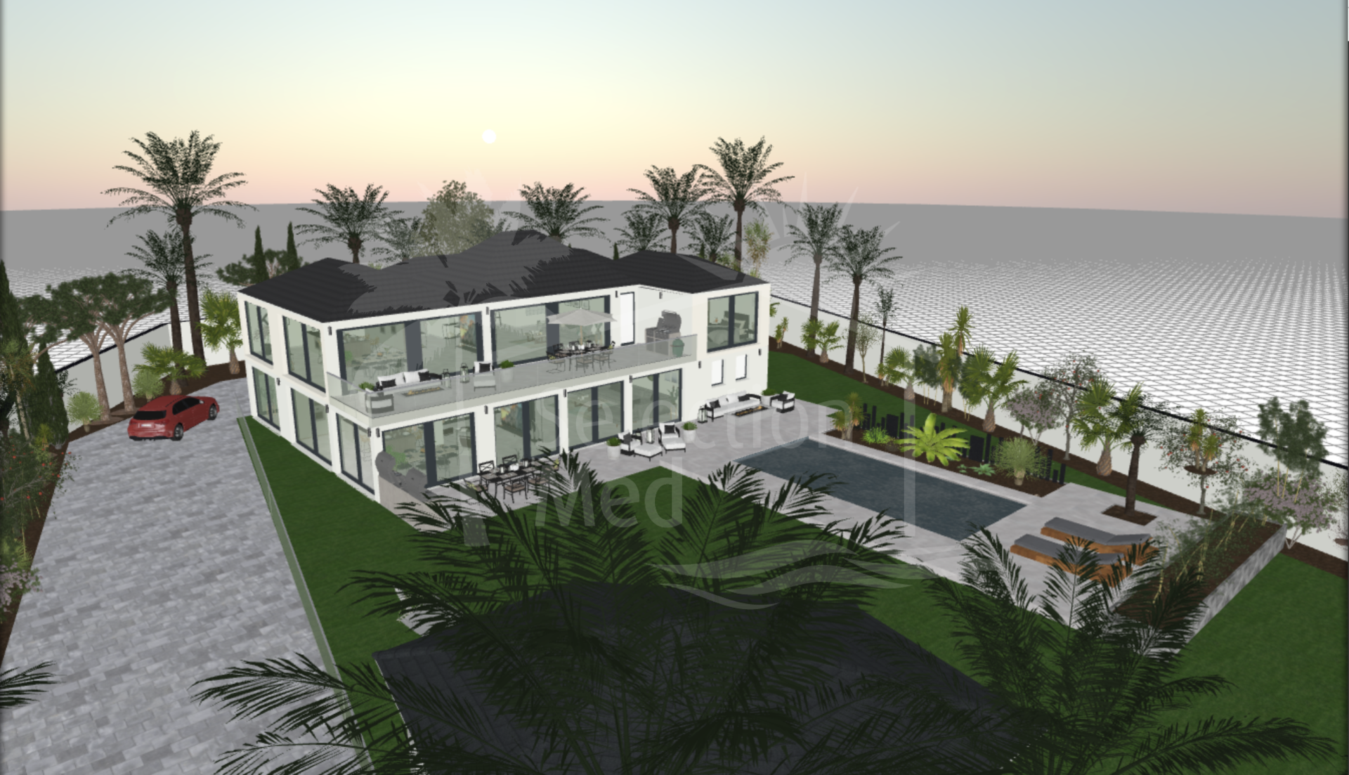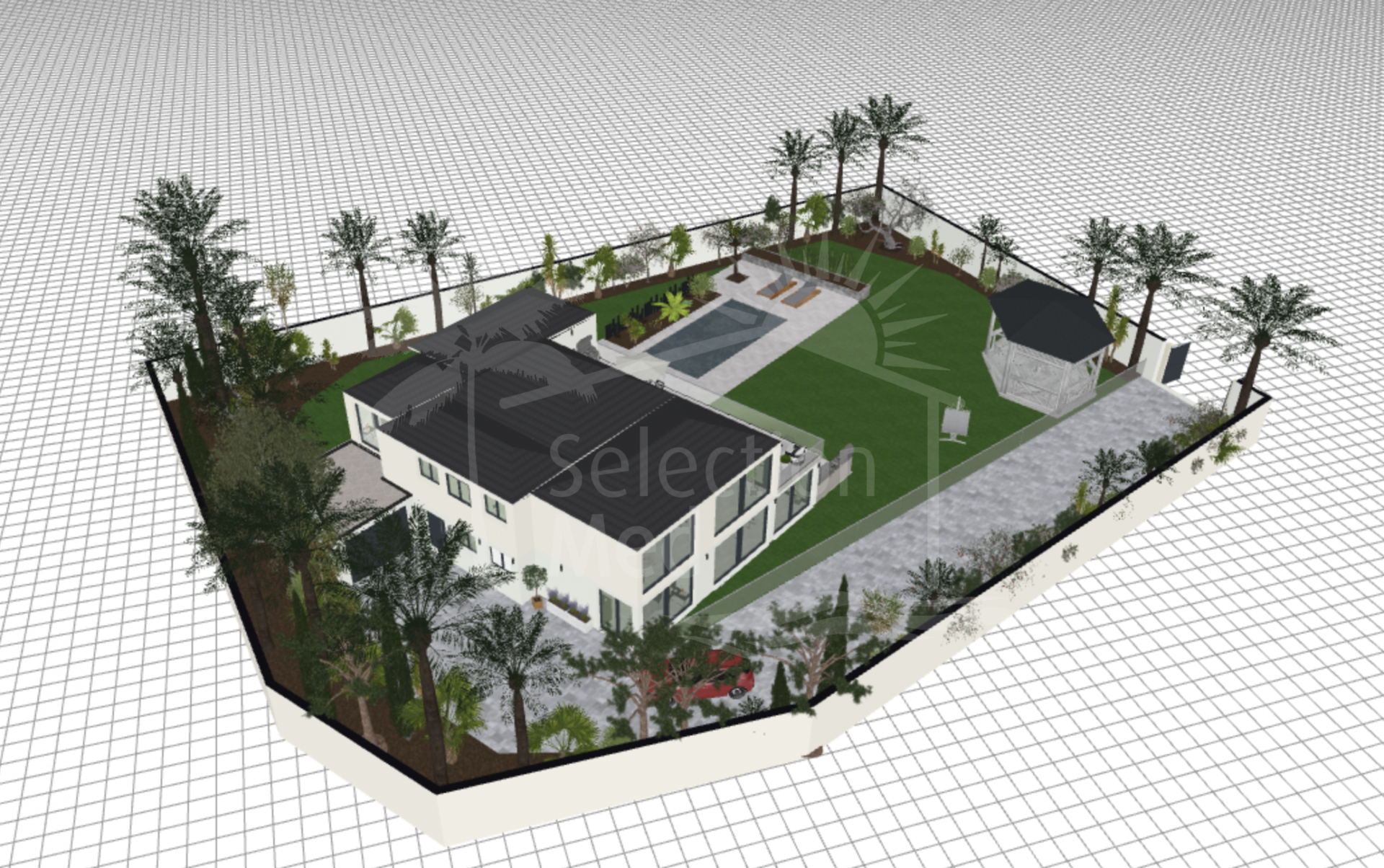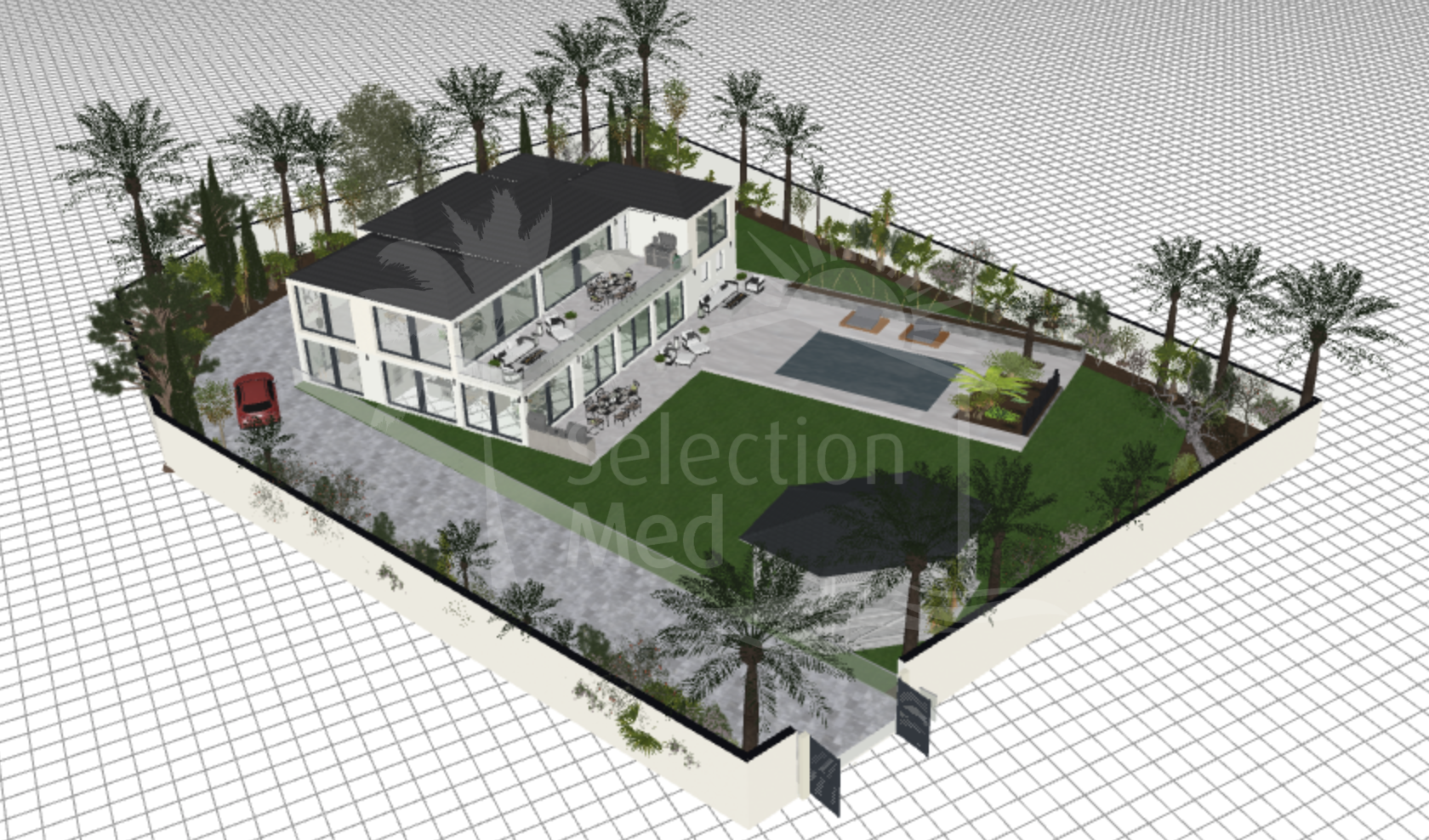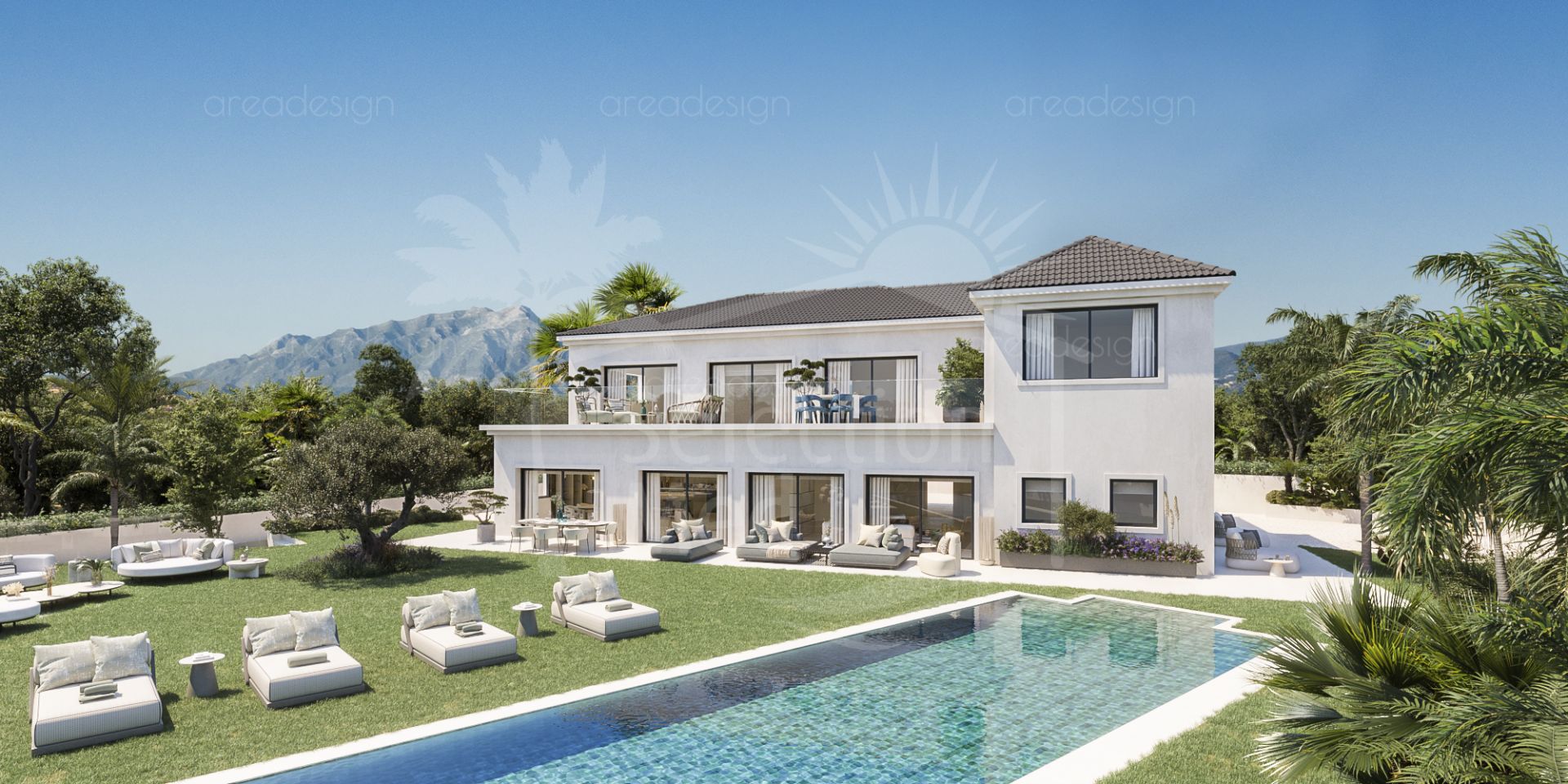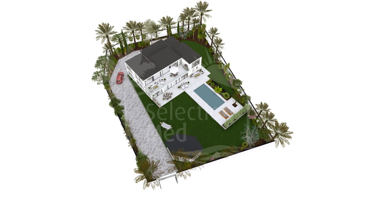 La villa está perfectamente integrada en la parcela y cuenta con amplias zonas ajardinadas, terrazas soleadas y una piscina privada, ideales para disfrutar del estilo de vida mediterráneo. Su ubicación en una calle residencial muy tranquila refuerza la sensación de exclusividad y calma.