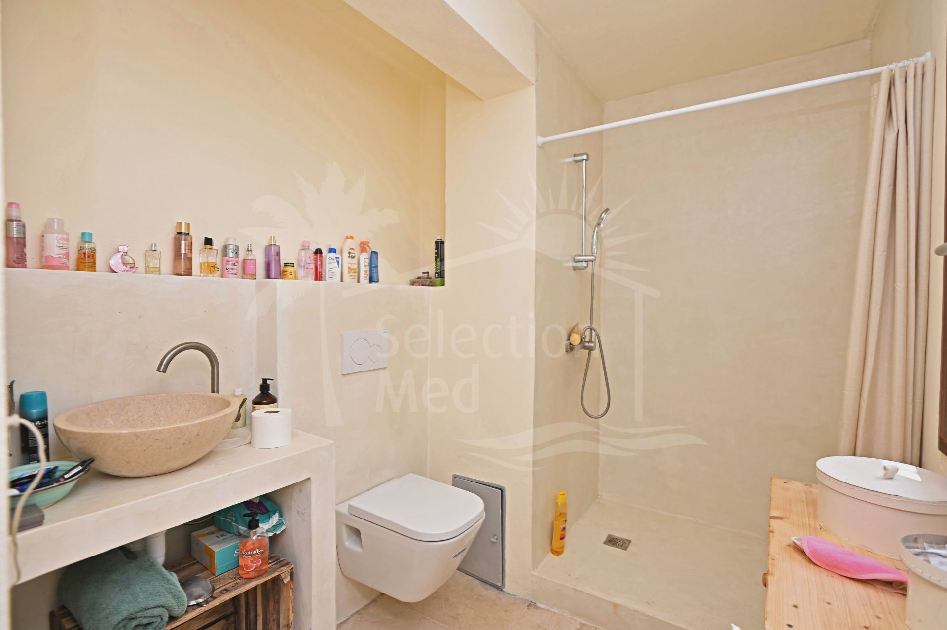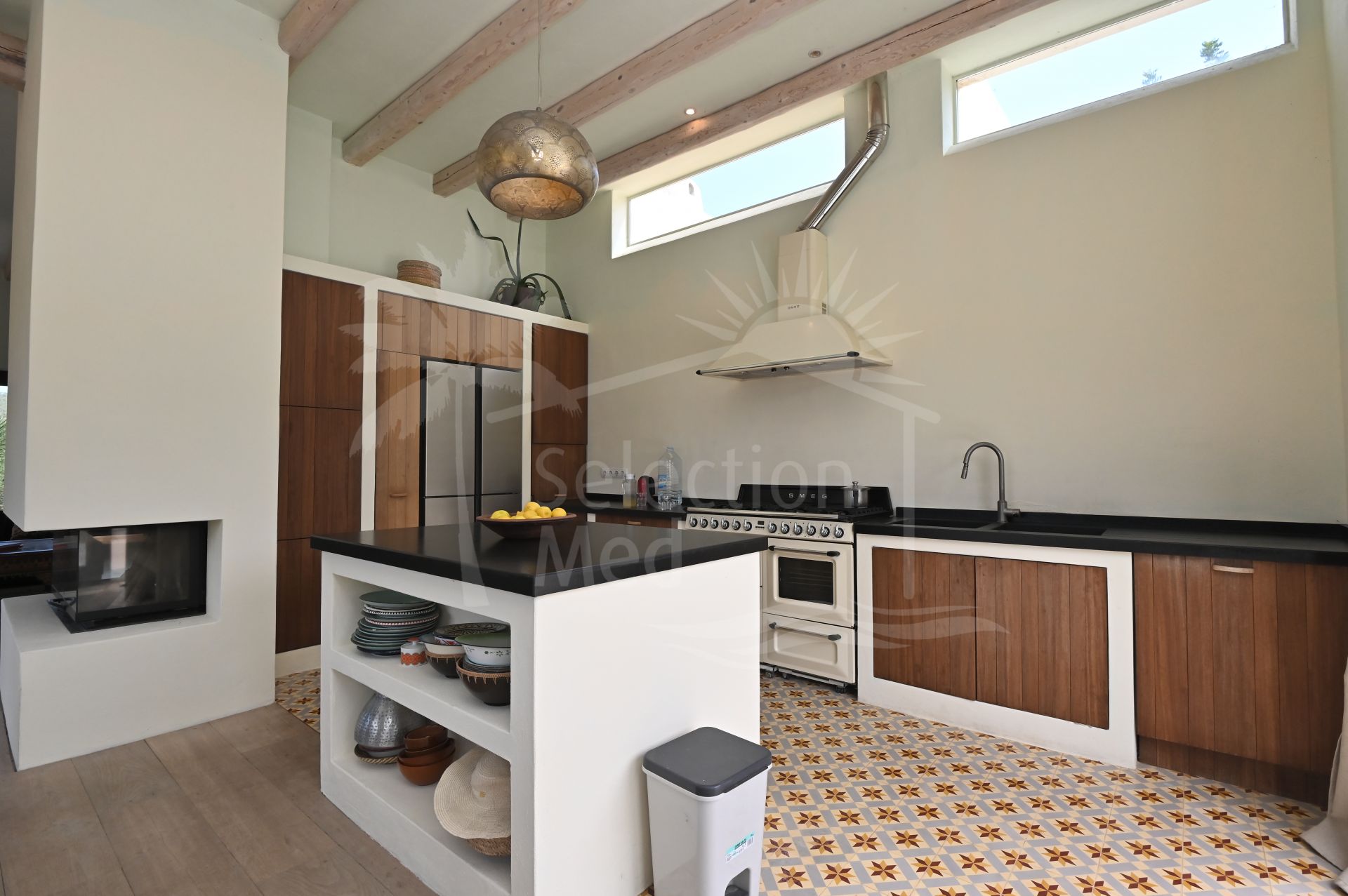La vivienda principal cuenta con cinco amplios dormitorios y cuatro baños completos, además de un aseo de cortesía. El salón, con suelos de parquet y chimenea, se abre a una terraza cubierta con vistas al jardín y la piscina privada, creando un ambiente cálido y acogedor. La cocina, totalmente equipada y de concepto abierto, se complementa con un comedor independiente y una práctica lavandería. El sistema de calefacción por suelo radiante, presente en toda la casa y especialmente en los baños, garantiza el máximo confort durante todo el año.