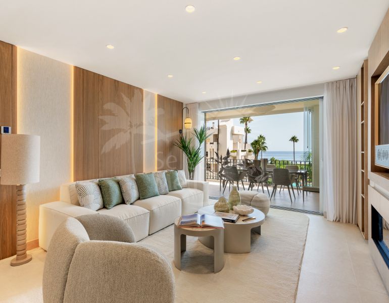 Este apartamento en planta baja reformado en Alcazaba Beach ofrece espacios luminosos y abiertos, diseñados para un estilo de vida costero moderno. El salón cuenta con una chimenea contemporánea y conecta con el comedor y la cocina moderna con isla...