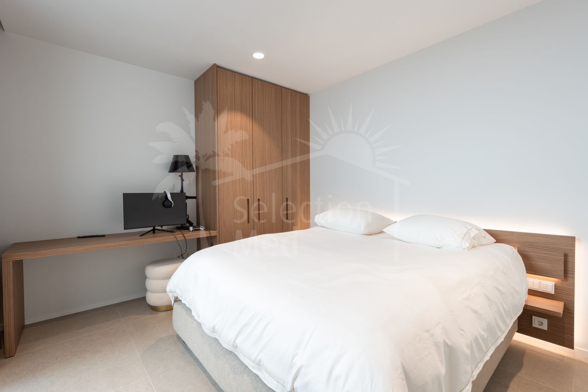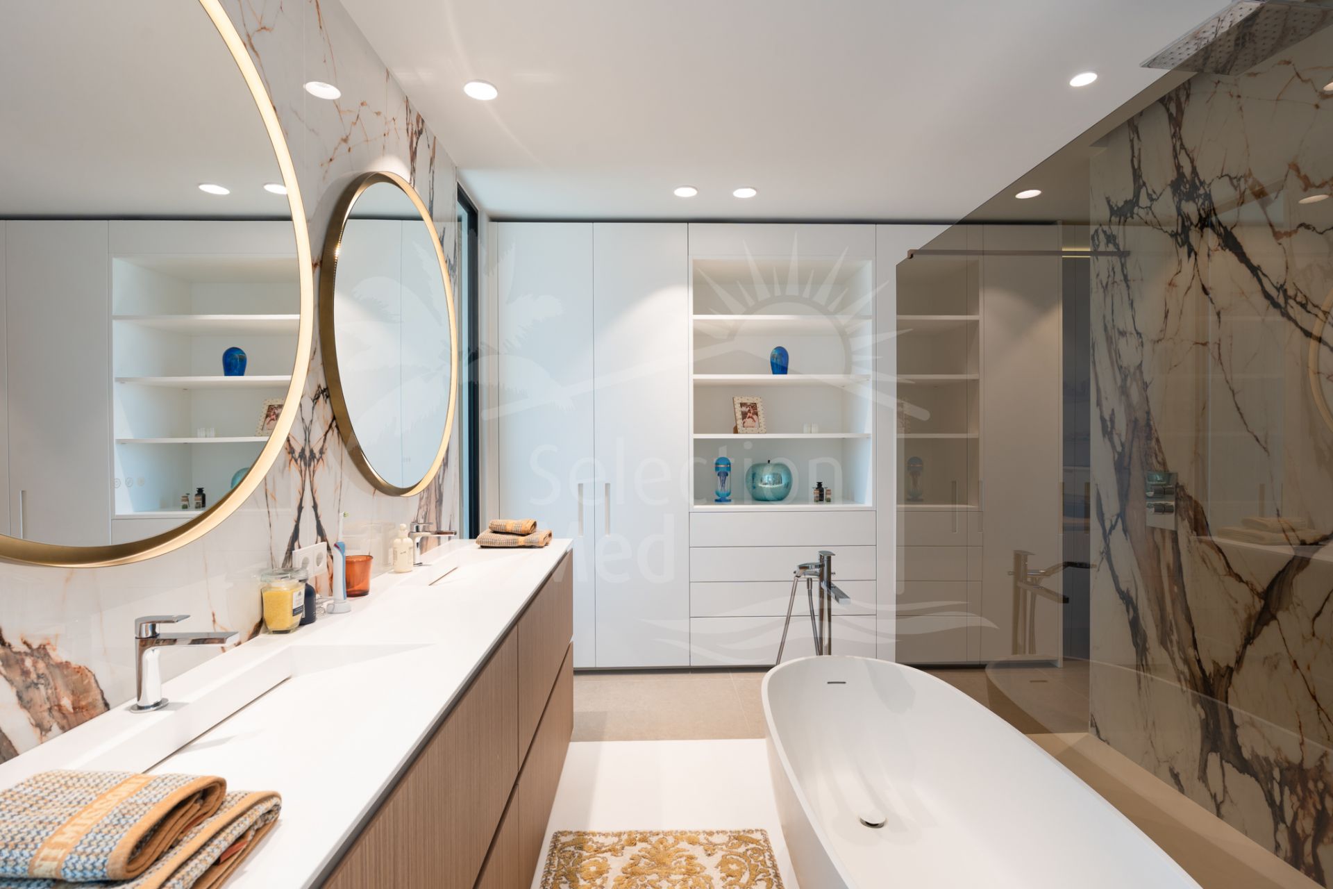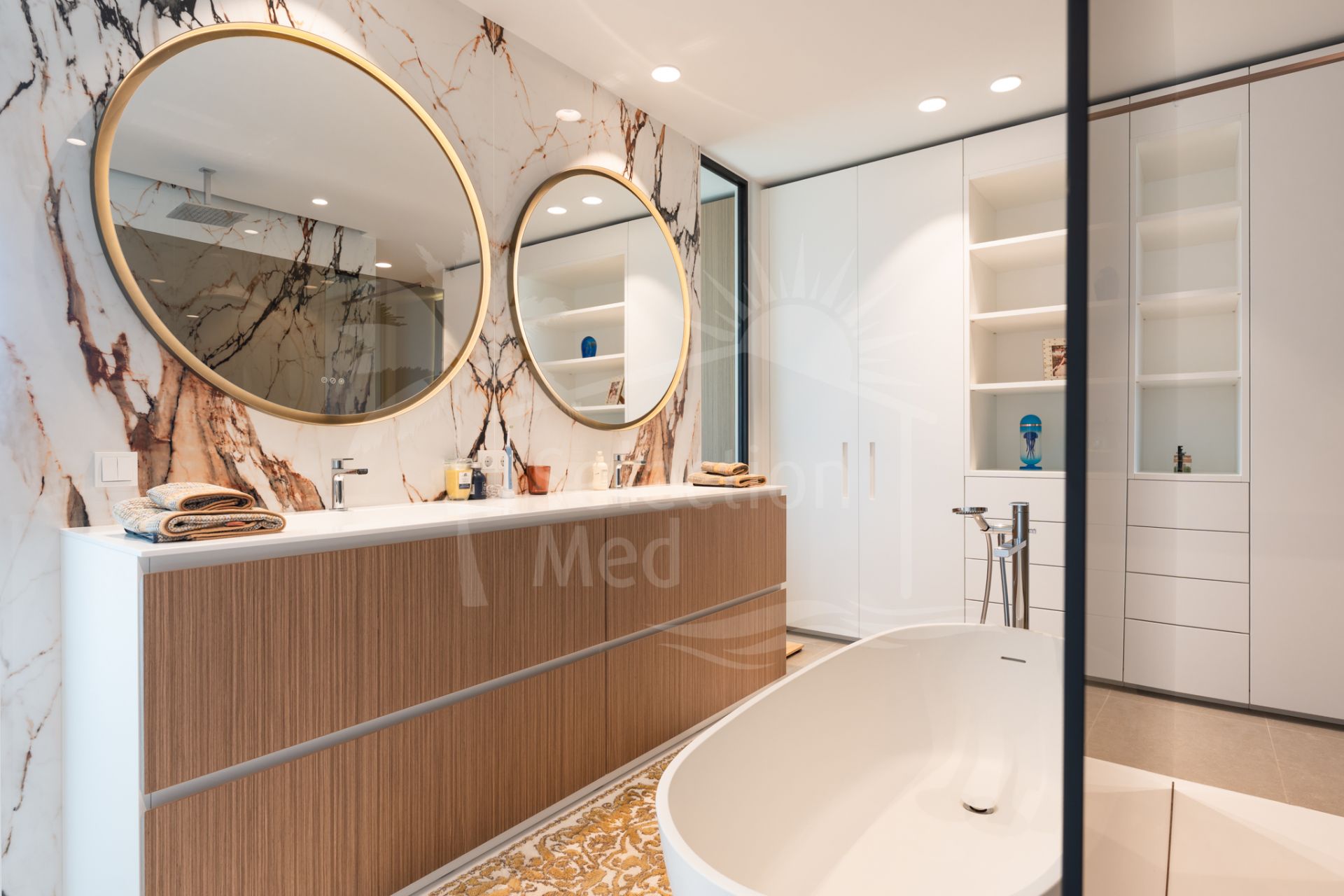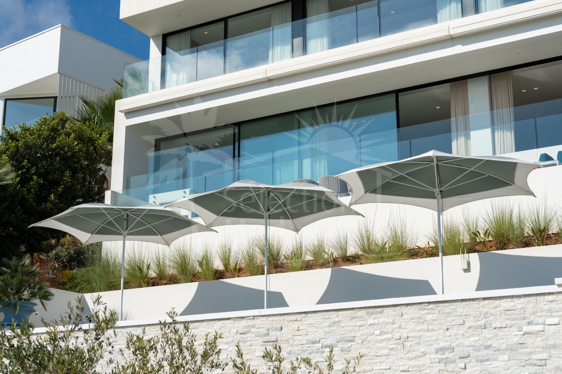 Situada sobre una parcela de 1.113 m², la villa cuenta con 550 m² construidos, diseñados con materiales de alta gama y acabados de lujo. Grandes ventanales y espacios abiertos permiten disfrutar de las vistas desde prácticamente todas las estancias. Dispone de cuatro amplios dormitorios, cada uno con su baño en suite, garantizando confort y privacidad.
