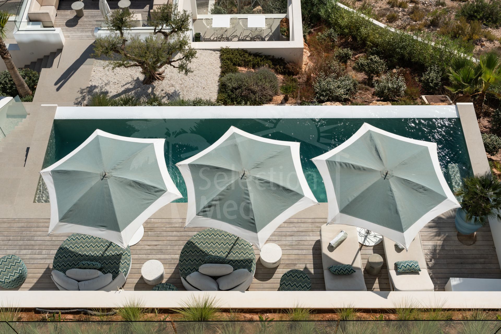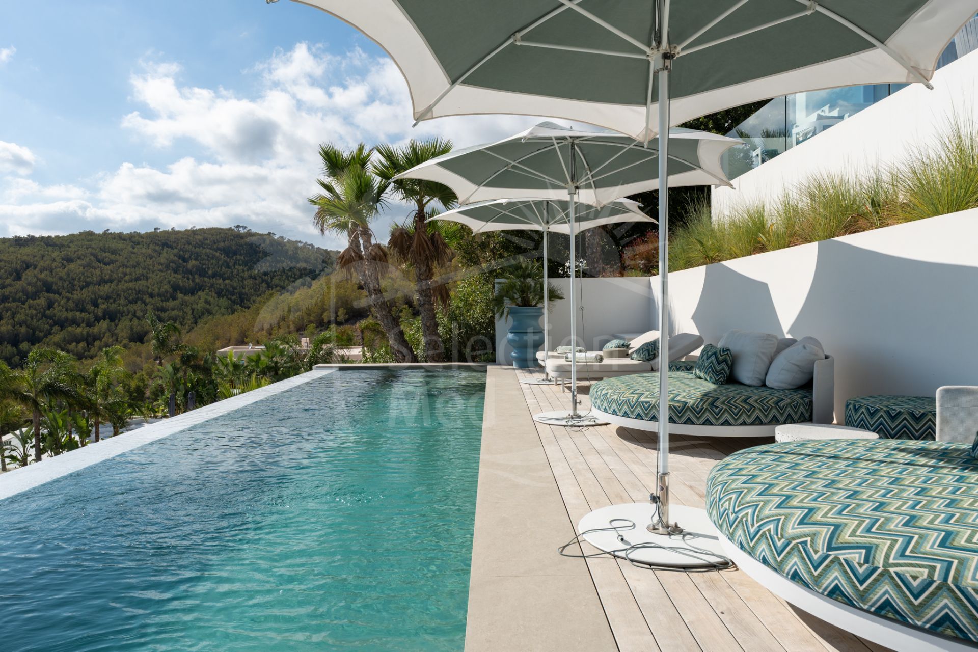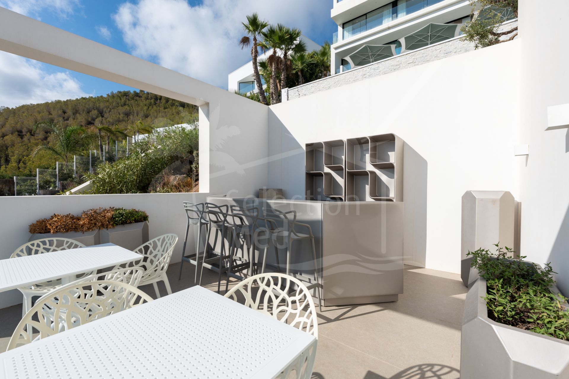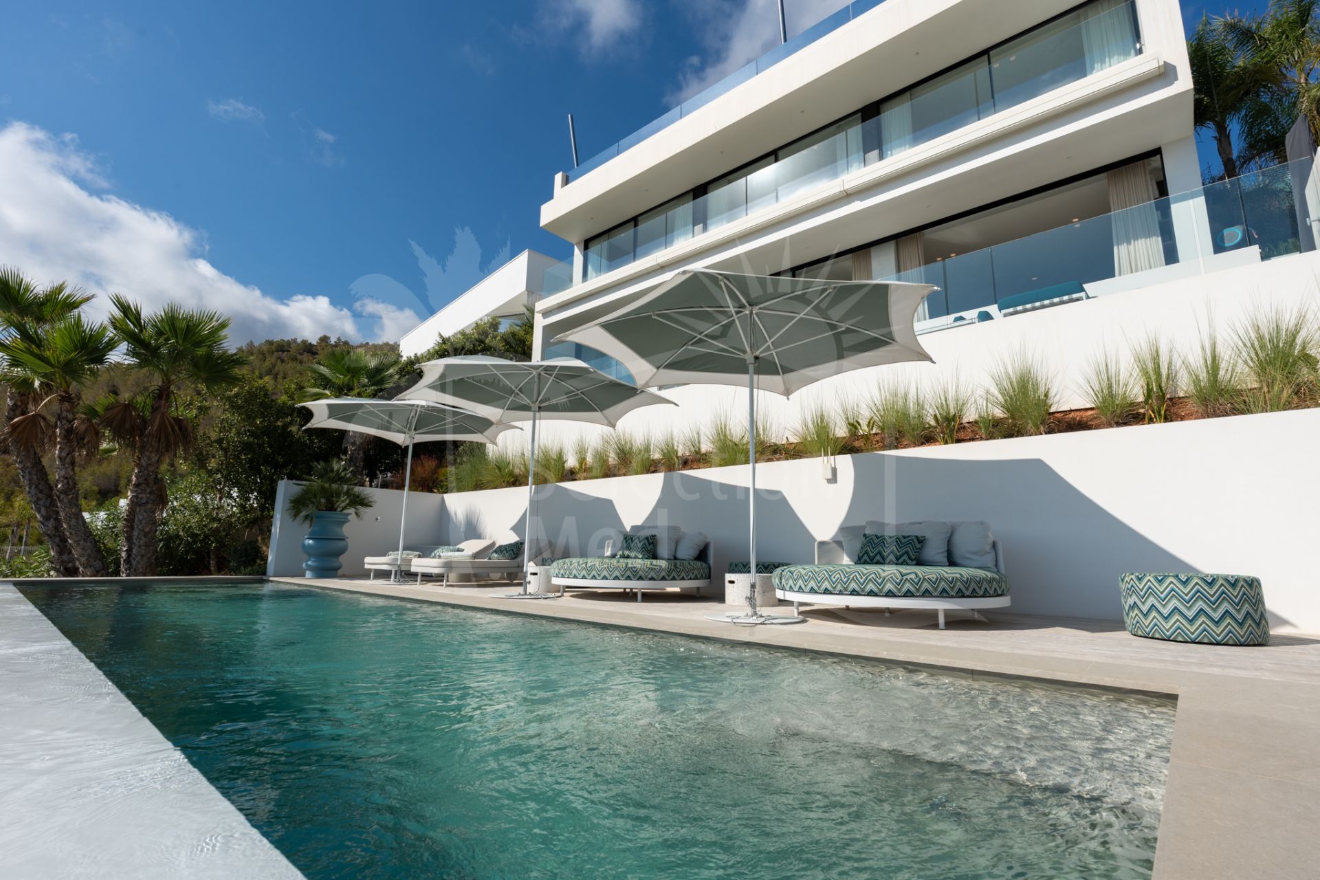 Las zonas de estar se abren a amplias terrazas, ideales para disfrutar del estilo de vida ibicenco y de las vistas espectaculares. Los jardines, cuidadosamente diseñados, refuerzan el carácter exclusivo de esta propiedad única.