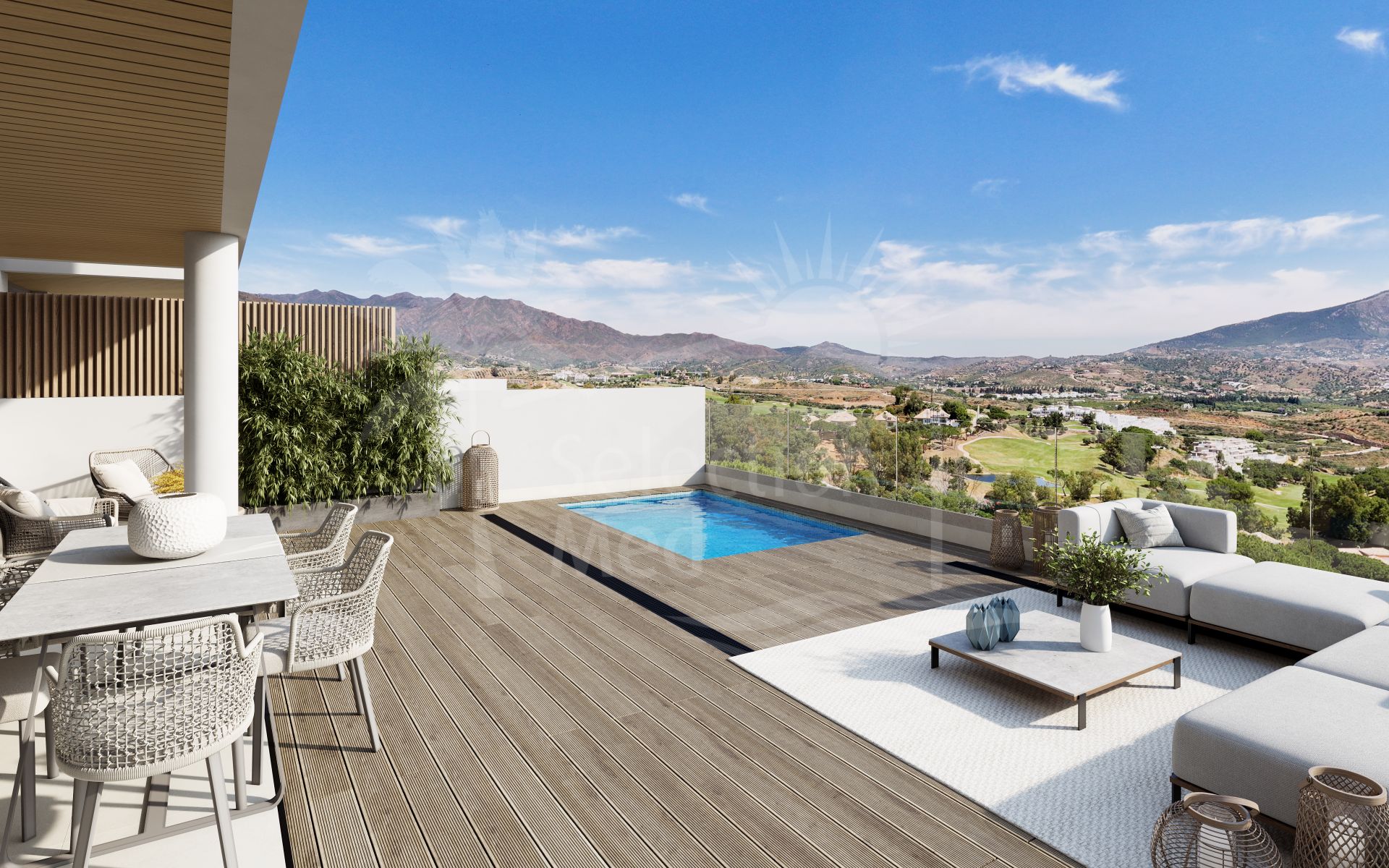 Los espacios exteriores son protagonistas en Sunrise Golf Residences. Las terrazas privadas permiten disfrutar del entorno natural y las vistas al golf, al mar o a la montaña. Algunas viviendas, como los áticos y plantas bajas, ofrecen la posibilidad de añadir una piscina privada y zona de cocina exterior, ideales para disfrutar del clima excepcional de la Costa del Sol.
