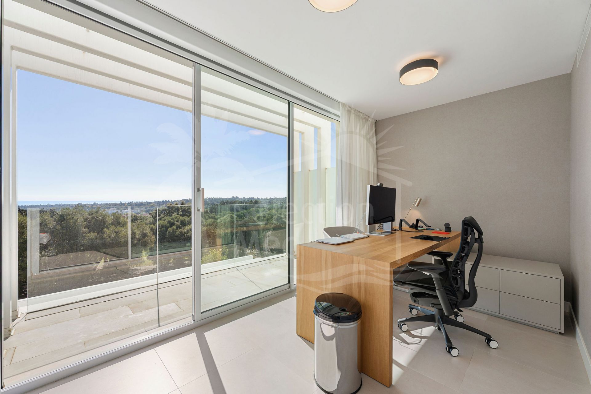 La planta superior cuenta con un luminoso y espacioso dormitorio actualmente utilizado como oficina, un baño separado, y acceso a una amplia terraza en la azotea, un espacio excepcional para comer al aire libre, descansar o añadir un spa privado, todo mientras disfruta de amplias vistas al golf y al mar.