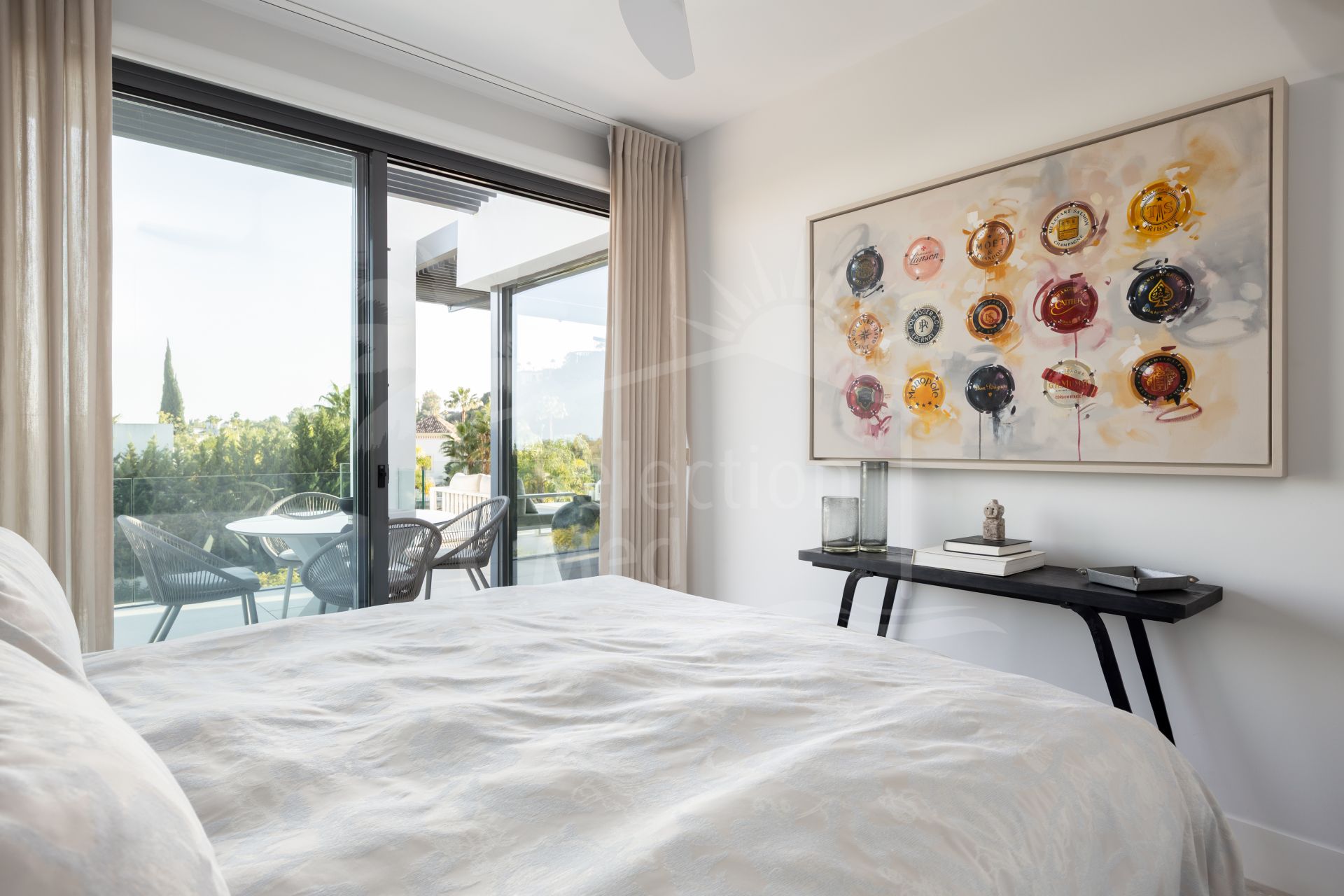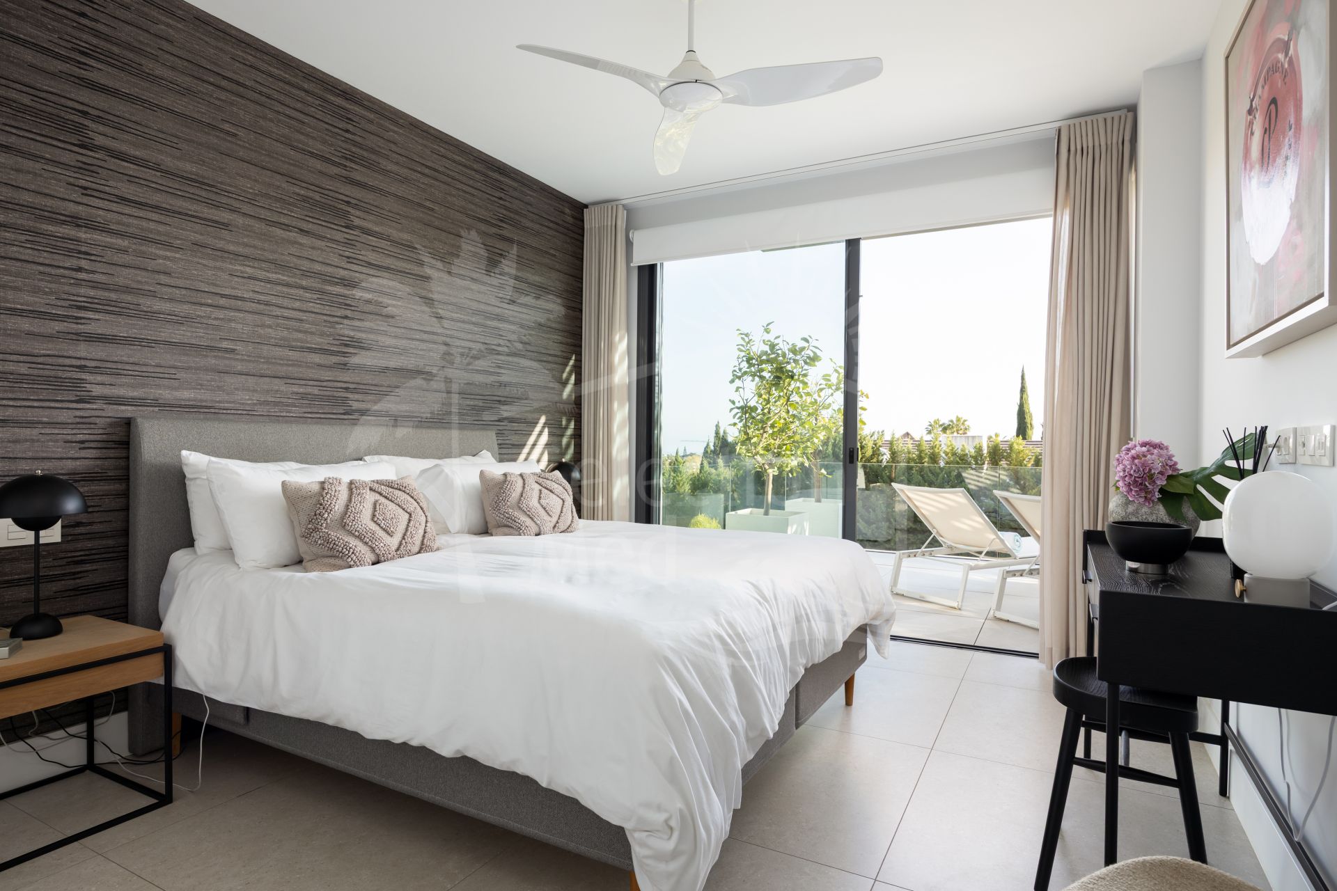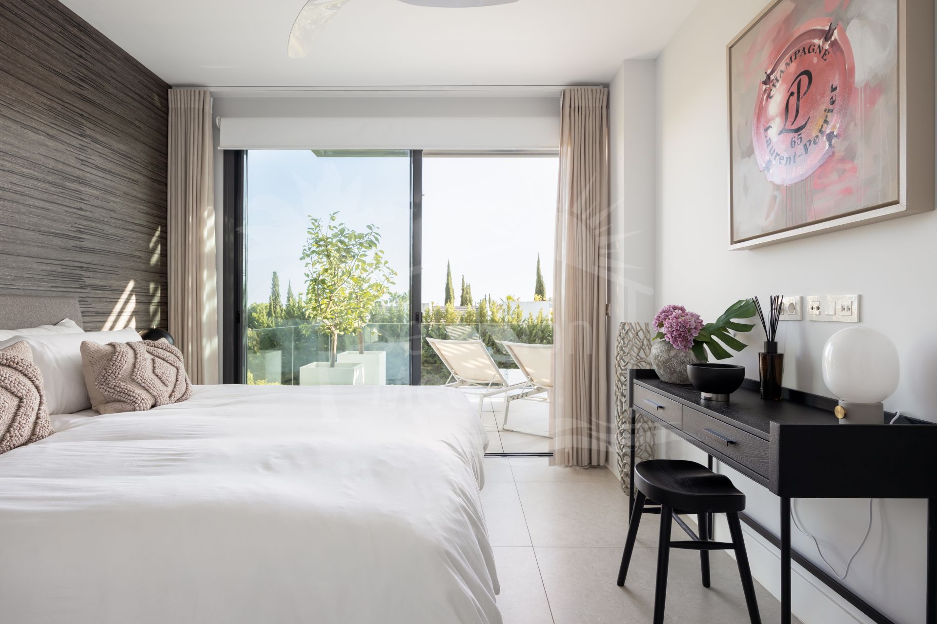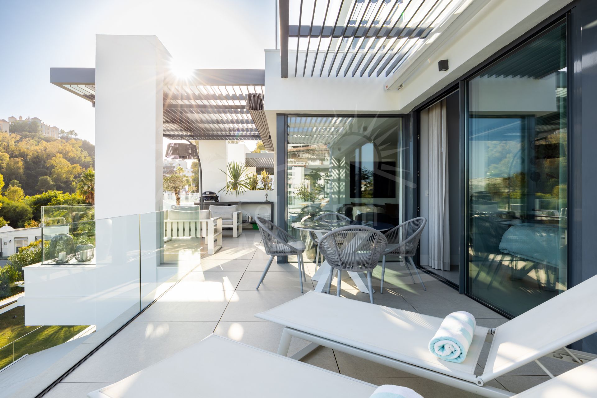 Este hermoso apartamento de dos dormitorios y dos baños ofrece una combinación armoniosa de confort y sofisticación en una de las zonas más buscadas del Valle del Golf. Con 112 m2 de espacio interior y una generosa terraza privada de 43 m2, la propiedad ofrece el entorno perfecto para vivir relajado y elegante entretenimiento.