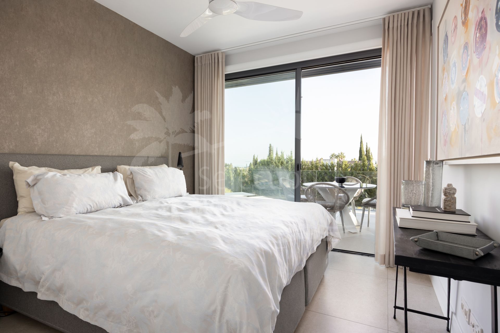 Elegante apartamento de 2 dormitorios, 2 baños en el Valle del Golf de Marbella con 112m2 interior, terraza de 43m2, acabados de lujo, piscinas, gimnasio, conserje & 2 plazas de aparcamiento.