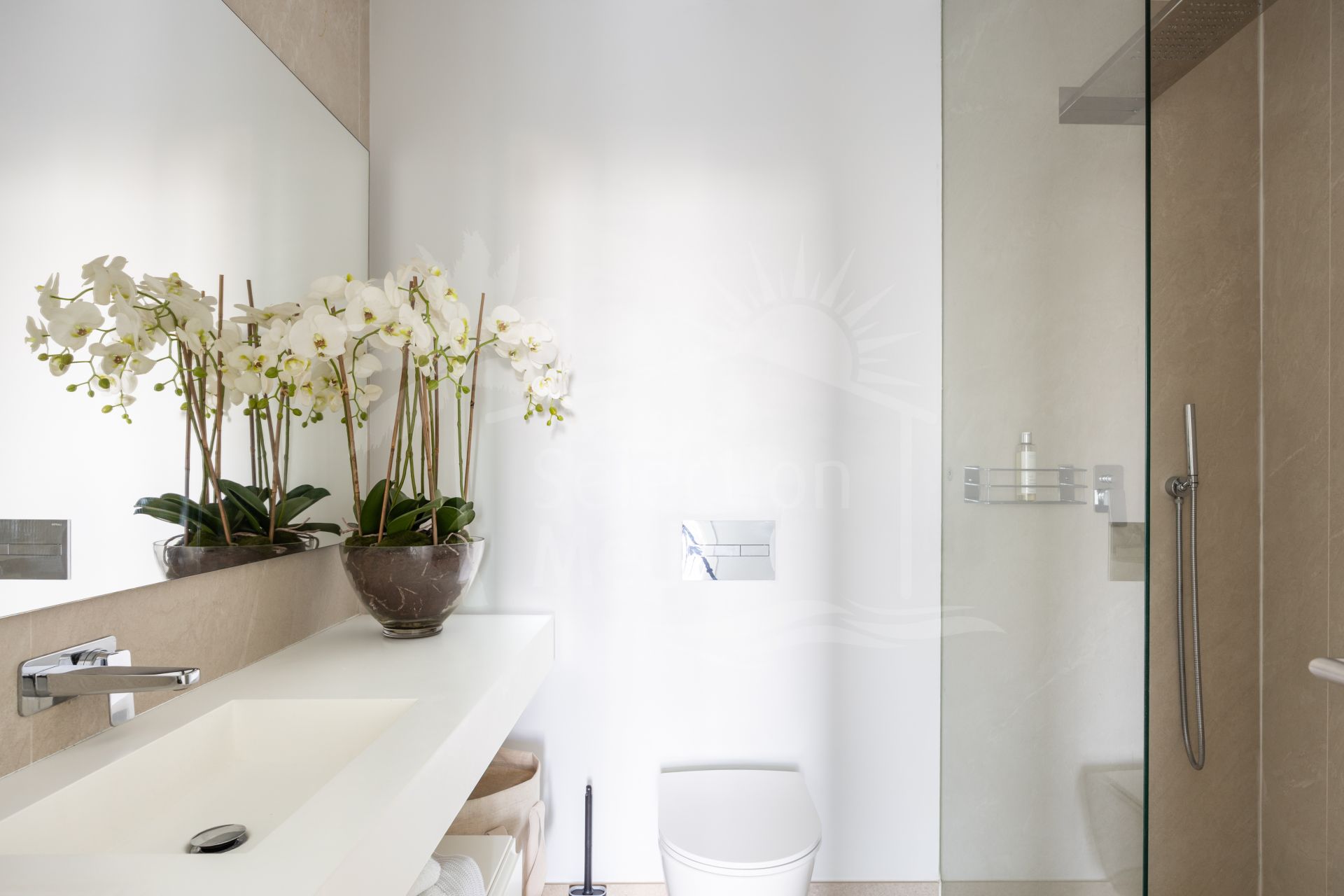 El confort está asegurado con calefacción por suelo radiante y aire acondicionado en las habitaciones principales, cortinas controladas a distancia en el salón, y ventiladores de techo remoto en los dormitorios. Los baños están terminados con detalles refinados, como una pantalla de ducha en la suite principal y práctico almacenamiento bajo la base. Además, el garaje es pre-wired para un cargador de coche eléctrico, añadiendo una comodidad moderna para el futuro.