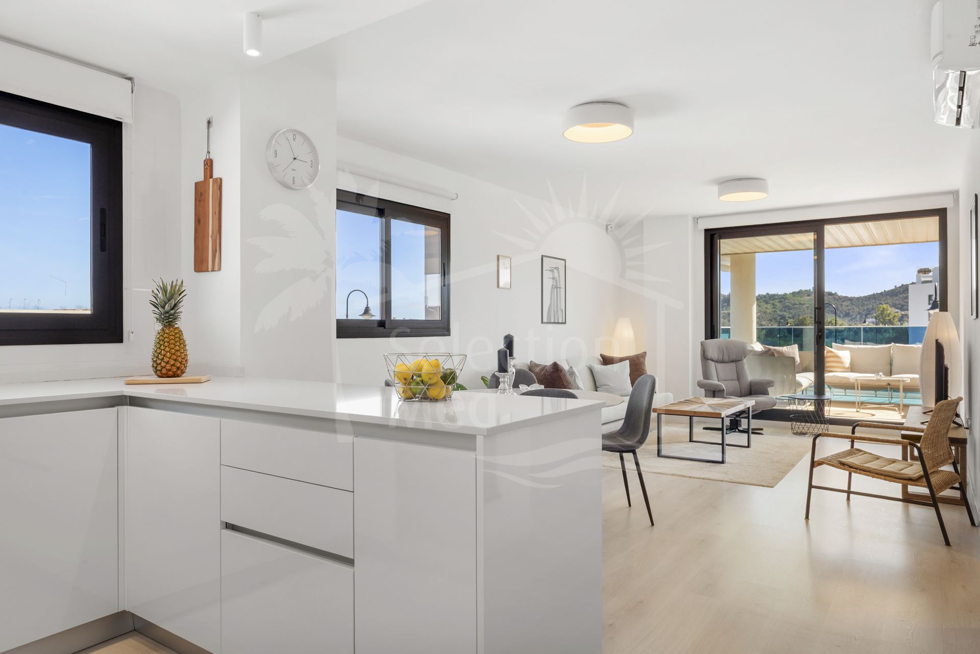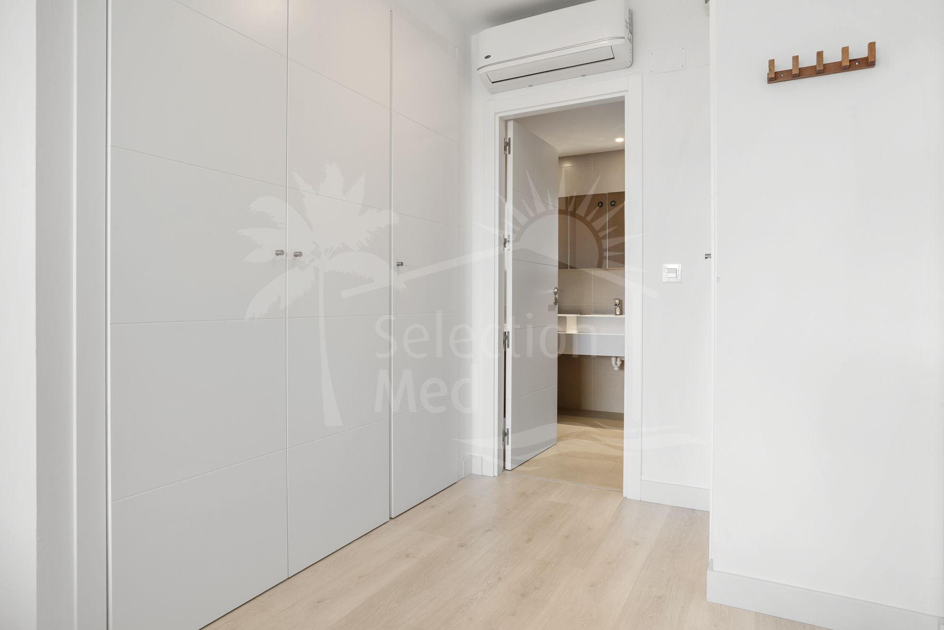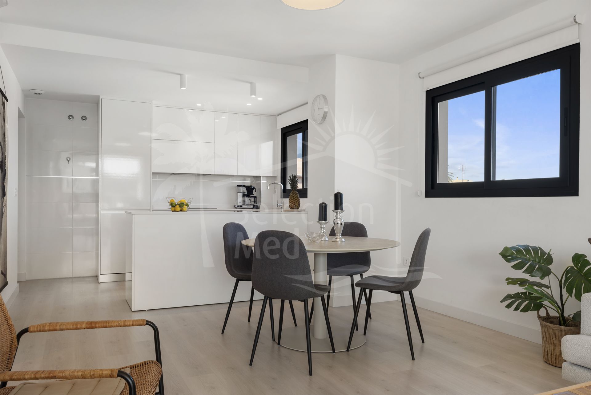 El corazón del apartamento es la cocina de concepto abierto, que fluye de manera natural hacia el luminoso salón-comedor. Grandes puertas correderas de cristal se abren a la espaciosa terraza, perfecta para disfrutar de comidas al aire libre, relajarse o aprovechar el sol mediterráneo. Los interiores son luminosos, aireados y están diseñados para una vida costera moderna, combinando tonos neutros con acabados de alta calidad.