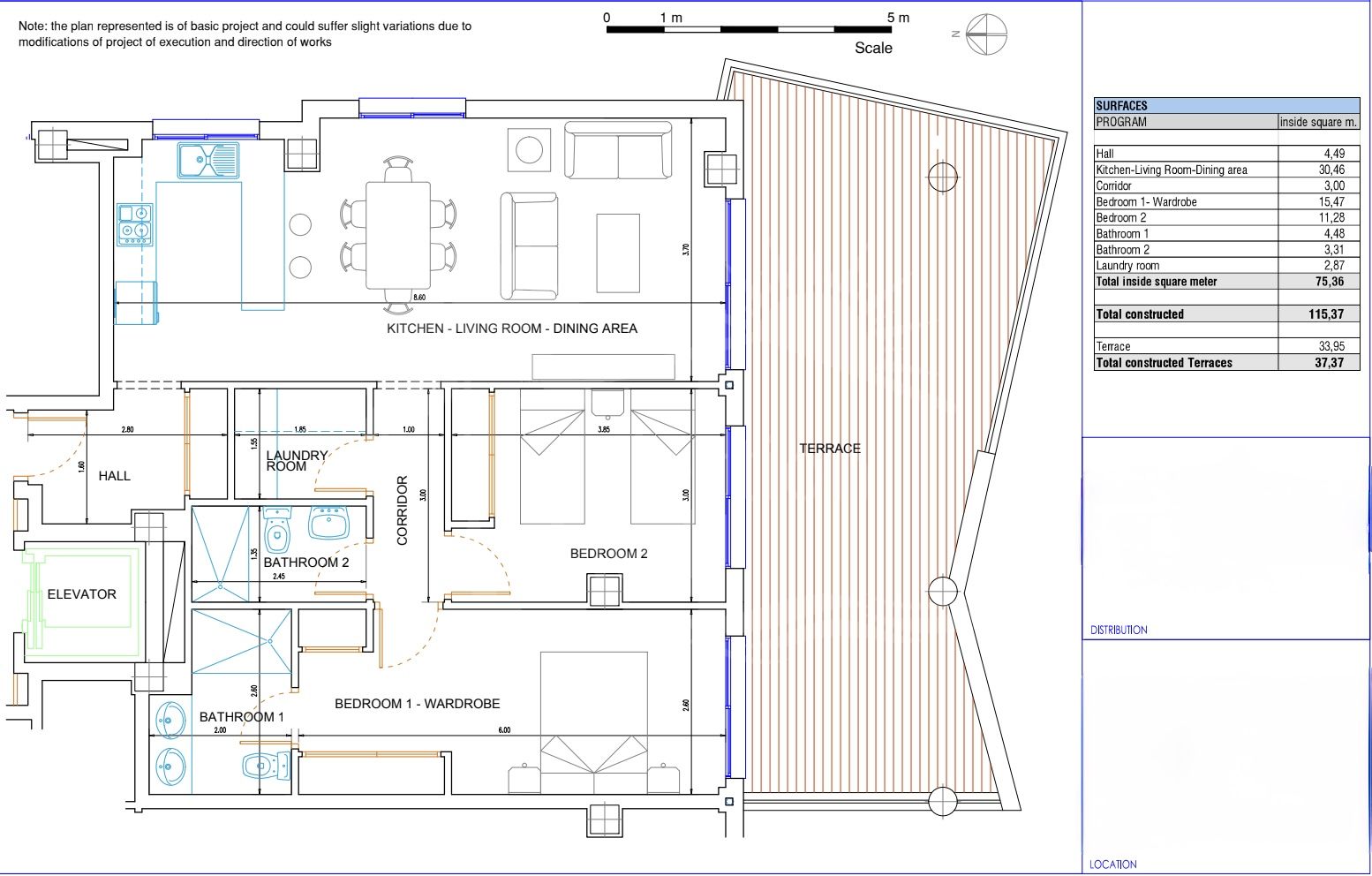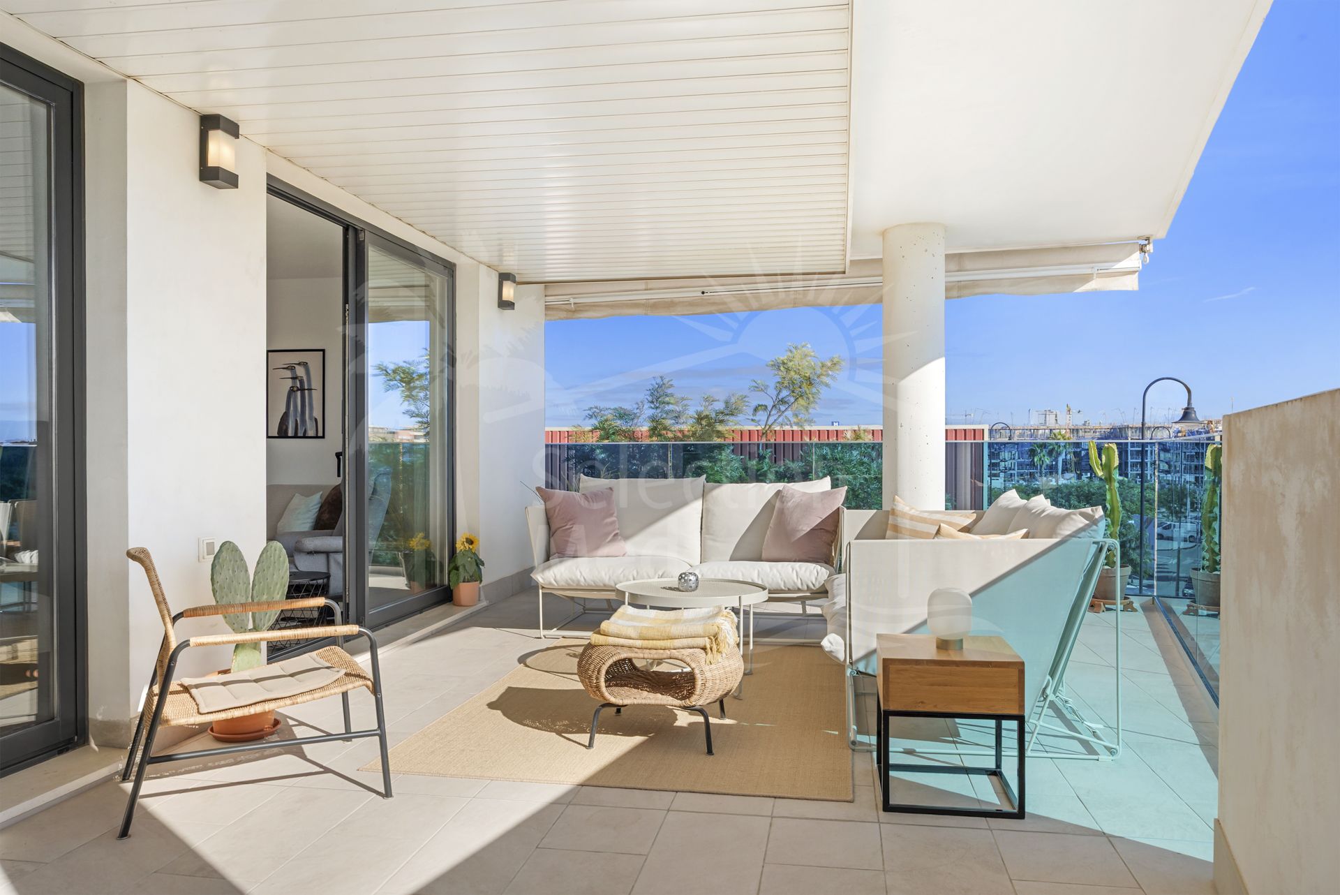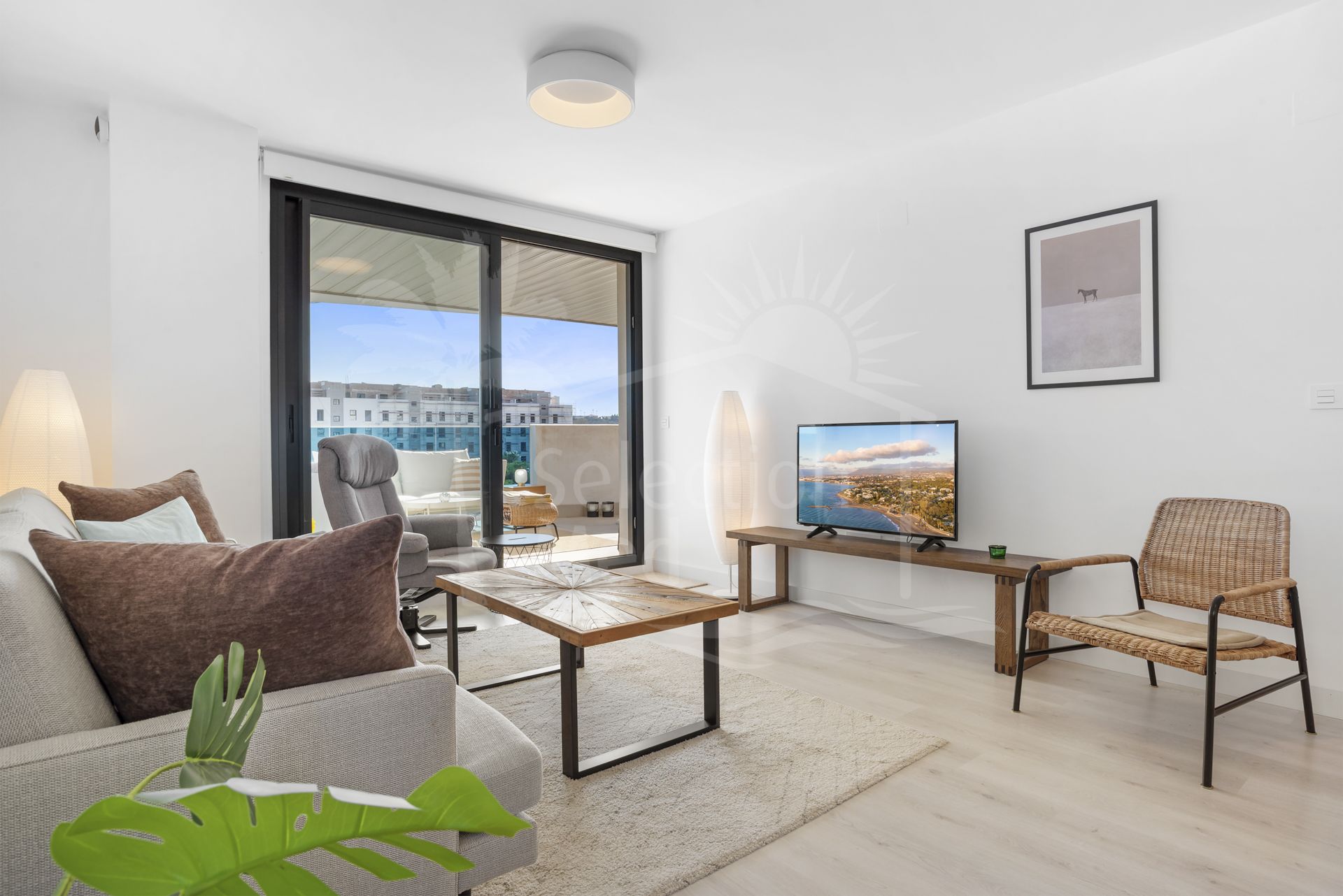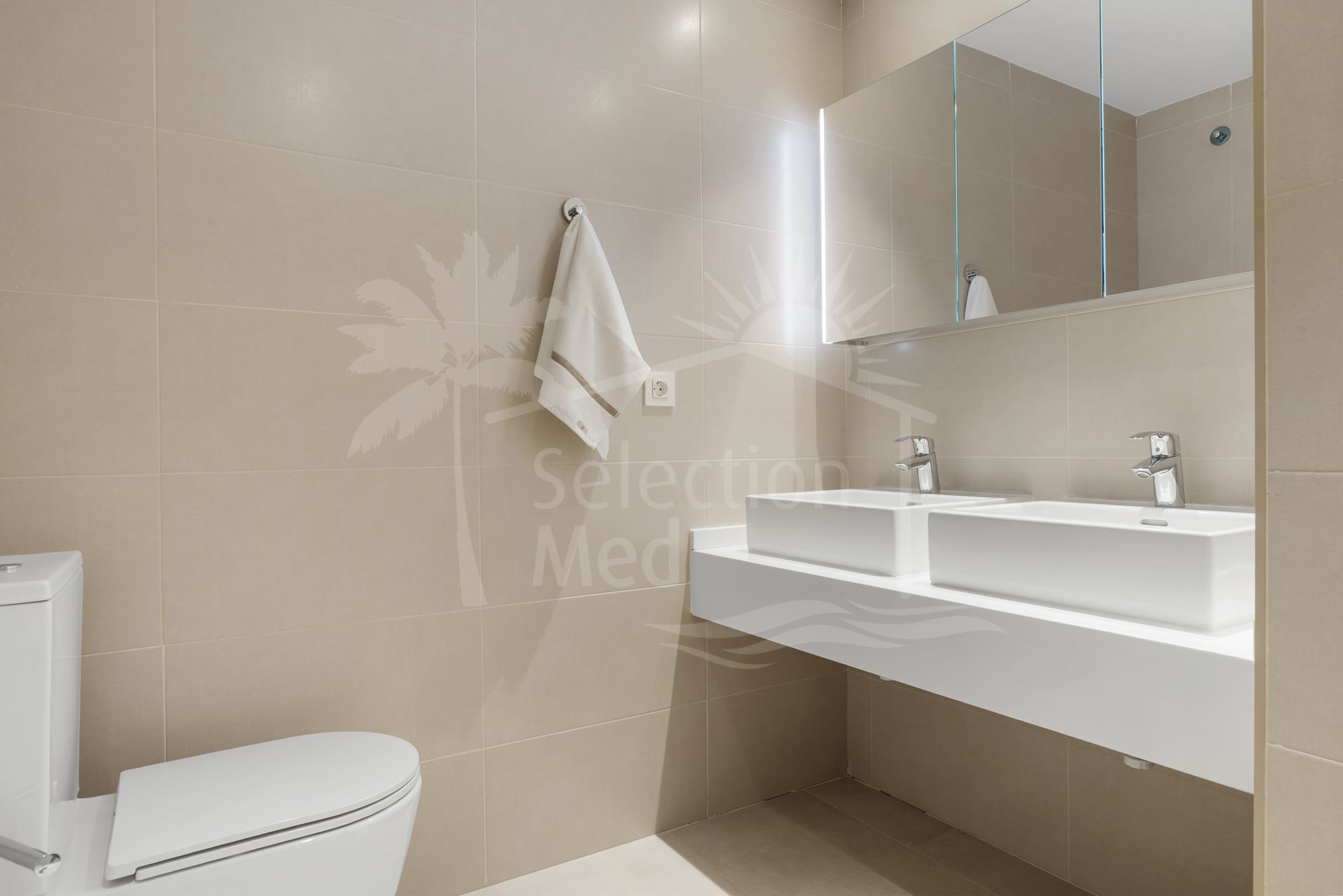 El corazón del apartamento es la cocina de concepto abierto, que fluye de manera natural hacia el luminoso salón-comedor. Grandes puertas correderas de cristal se abren a la espaciosa terraza, perfecta para disfrutar de comidas al aire libre, relajarse o aprovechar el sol mediterráneo. Los interiores son luminosos, aireados y están diseñados para una vida costera moderna, combinando tonos neutros con acabados de alta calidad.