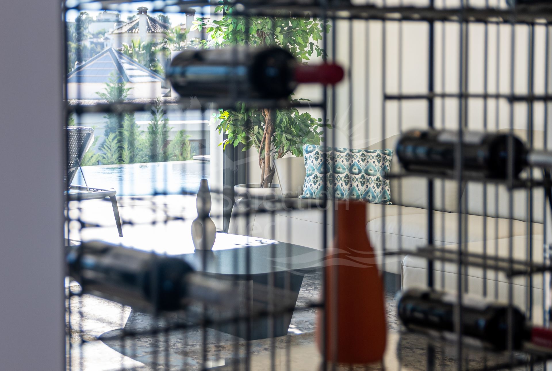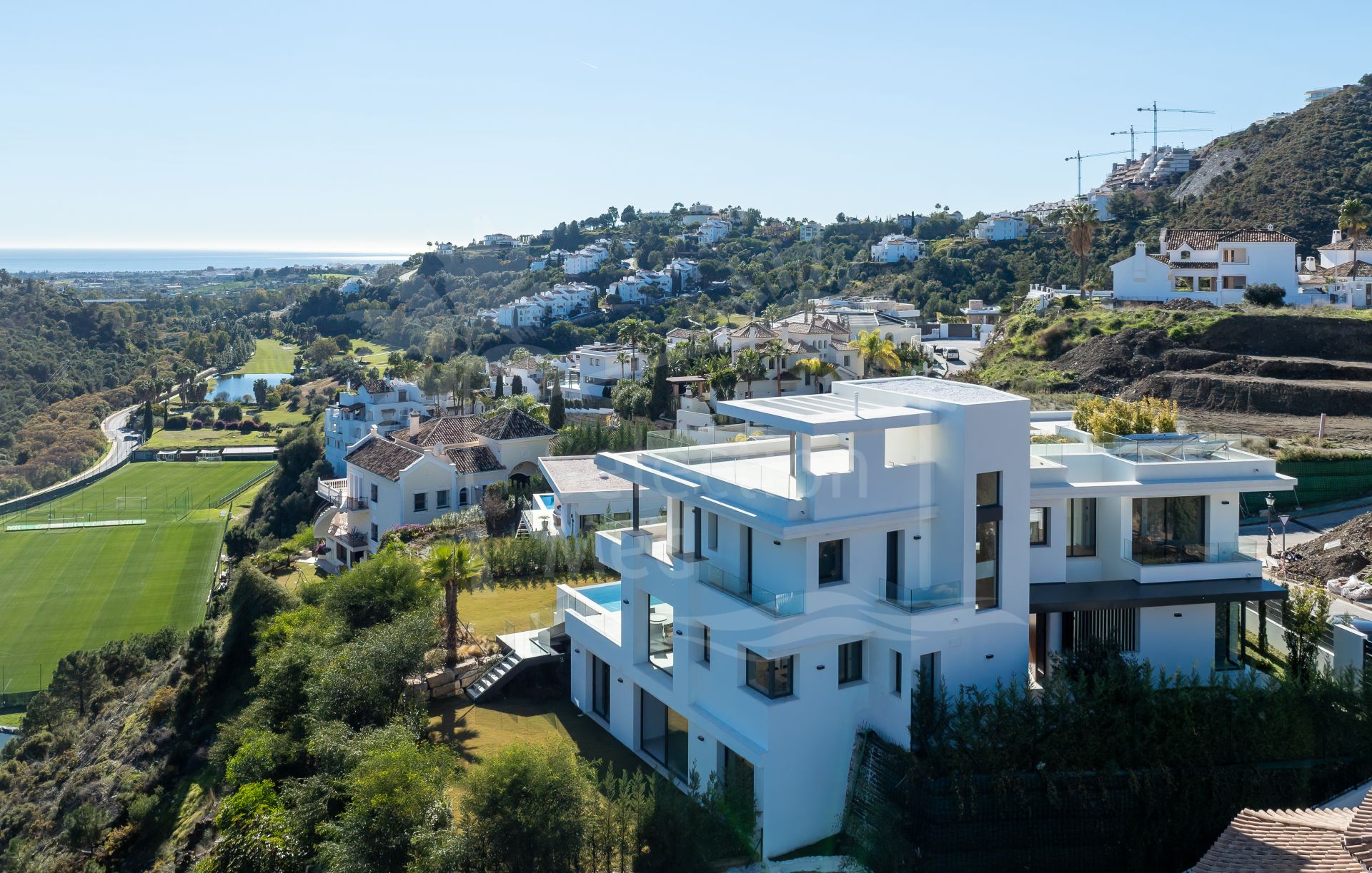 Los espacios exteriores de la villa incluyen dos jardines con magníficas vistas, la terraza principal y la zona de la piscina, además de un espacioso solárium de 158 m² con preinstalación para una cocina exterior y vistas de 360º al mar, al campo de golf y a las montañas. El solárium también cuenta con una zona ajardinada y hay preinstalación para instalar un ascensor desde el sótano. Con calefacción por suelo radiante por agua en toda la vivienda y grifería Hansgroe, esta propiedad ofrece comodidades modernas, vistas espectaculares y una ubicación muy solicitada, lo que la convierte en una oportunidad excepcional para aquellos que buscan vistas, privacidad, espacio y comodidad.