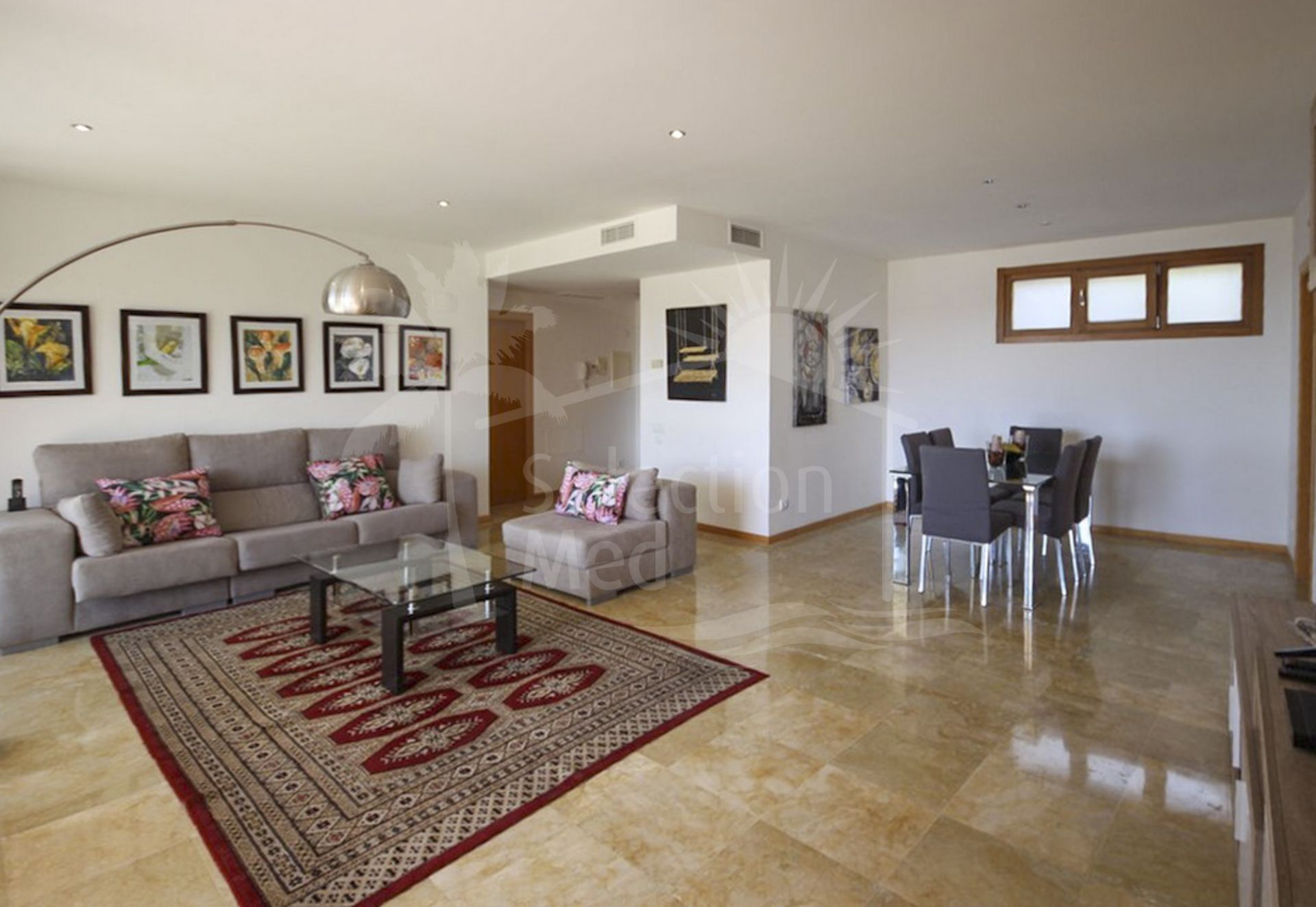 Amplio salon comedor y cocina independiente y totalmente equipada, suelos de mármol, se vende todo amueblado como se ve en las fotos.