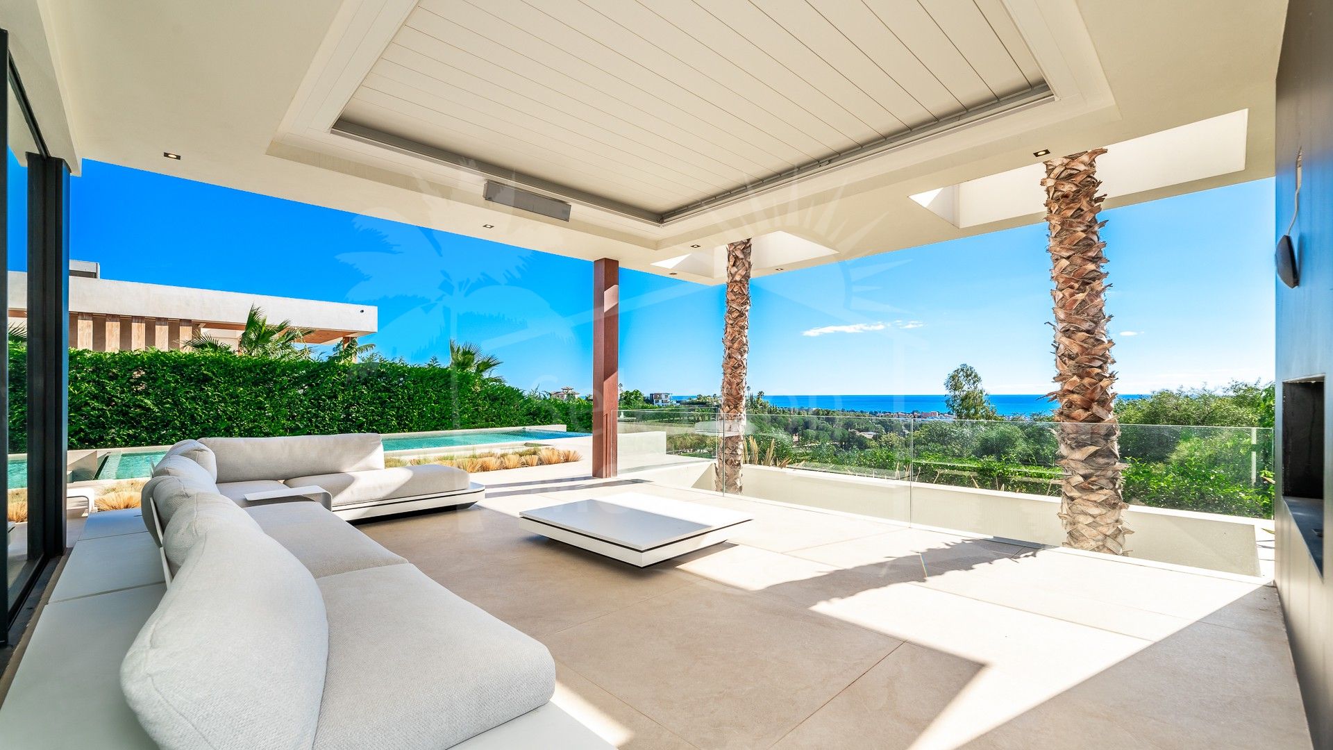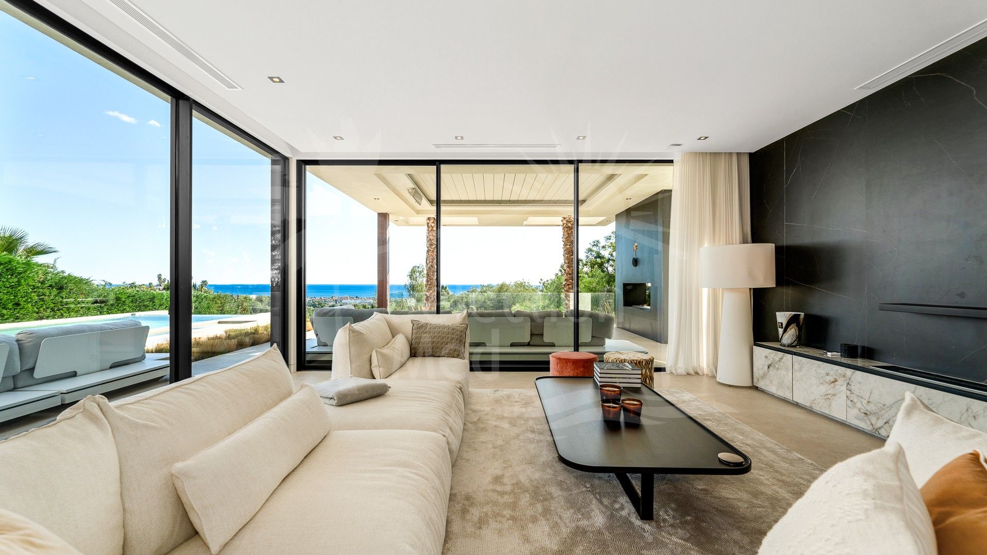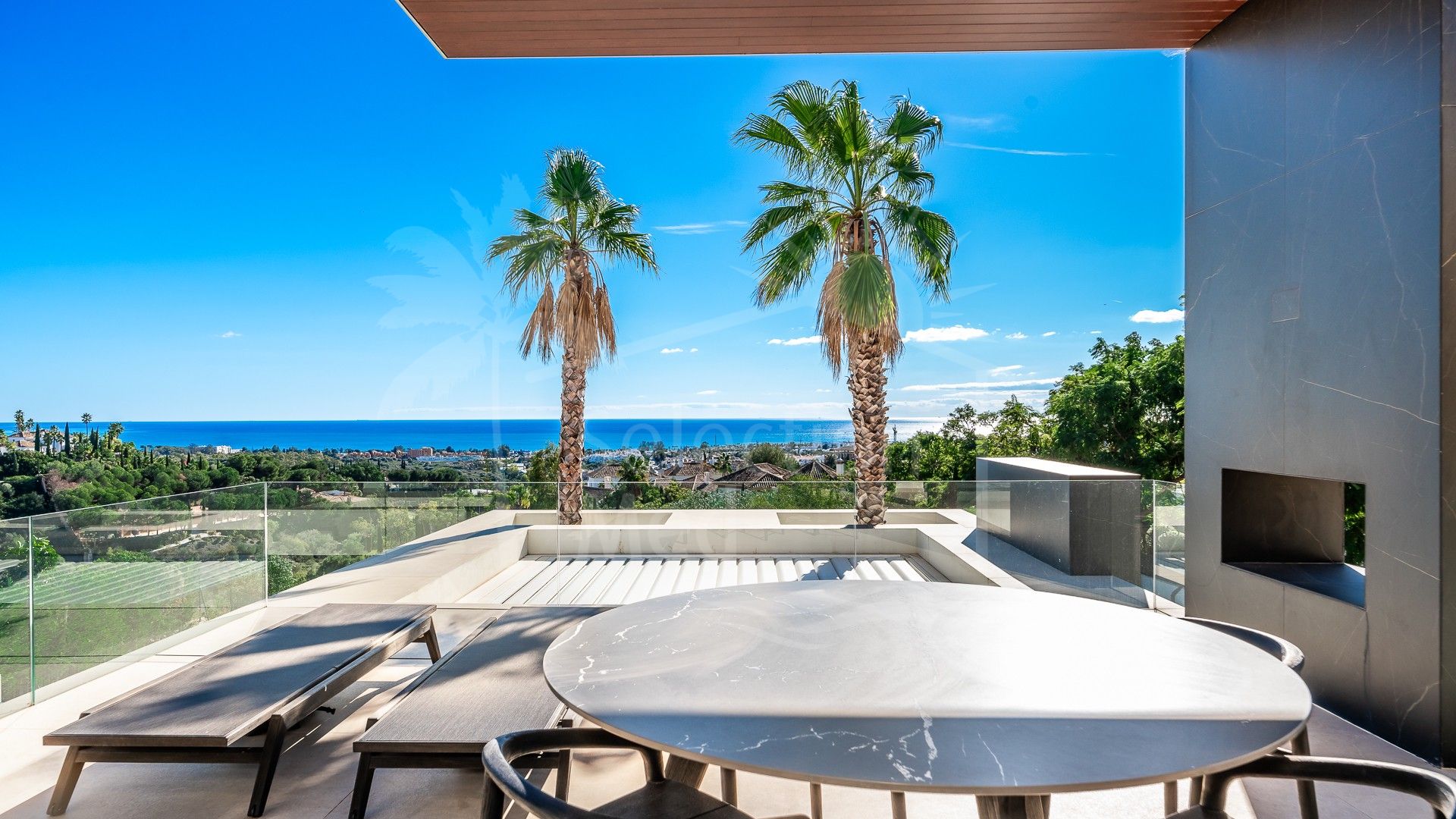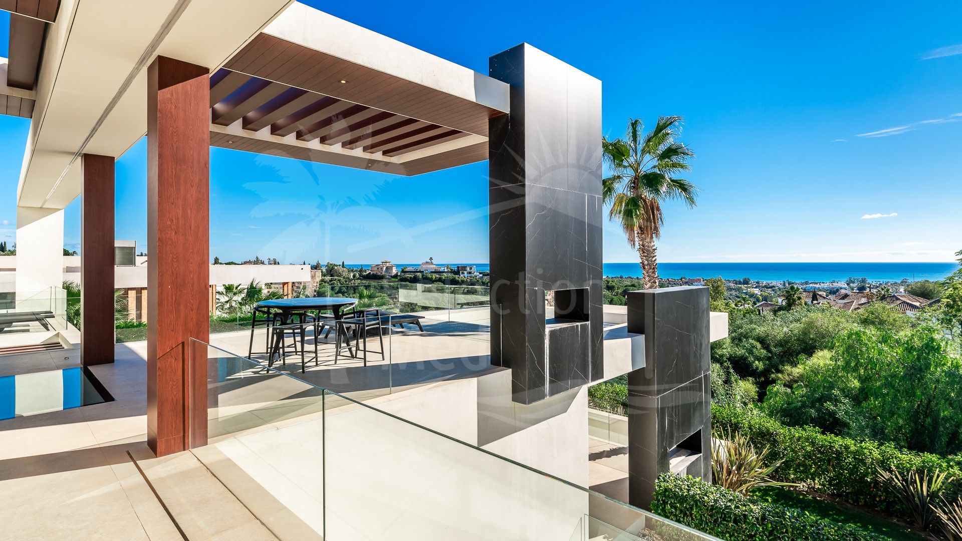 En el exterior, la villa presume de una piscina infinita, una zona de chill-out con chimenea y terrazas diseñadas con gusto, ideales para relajarse o entretenerse mientras disfruta de las vistas panorámicas al mar.