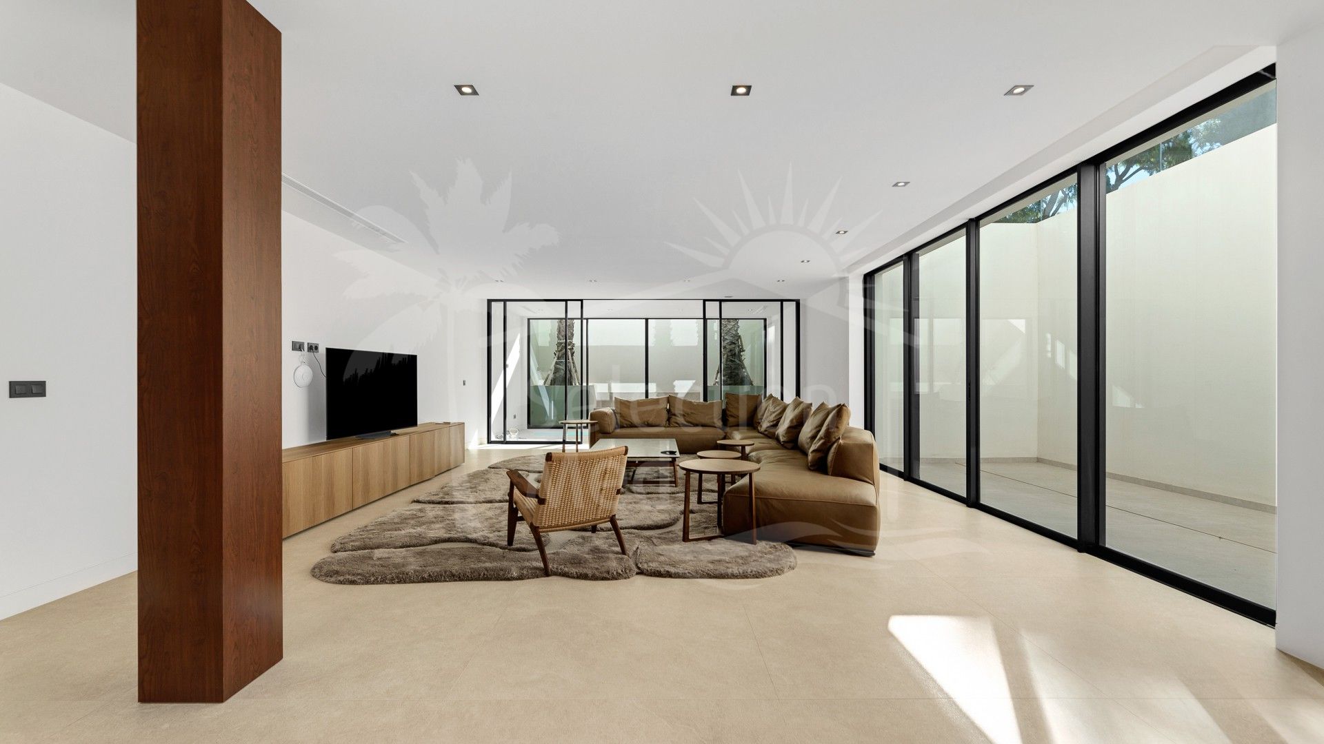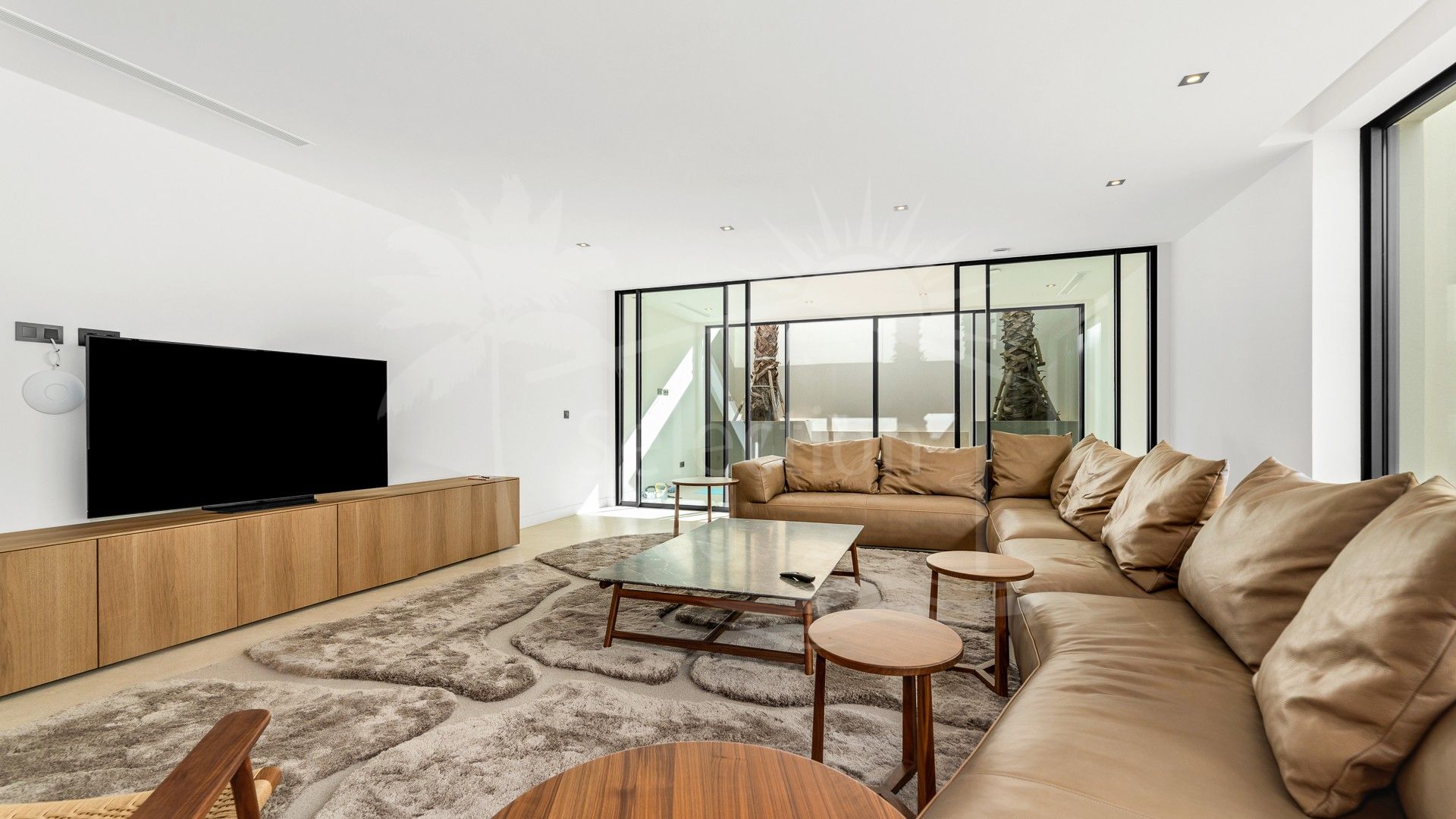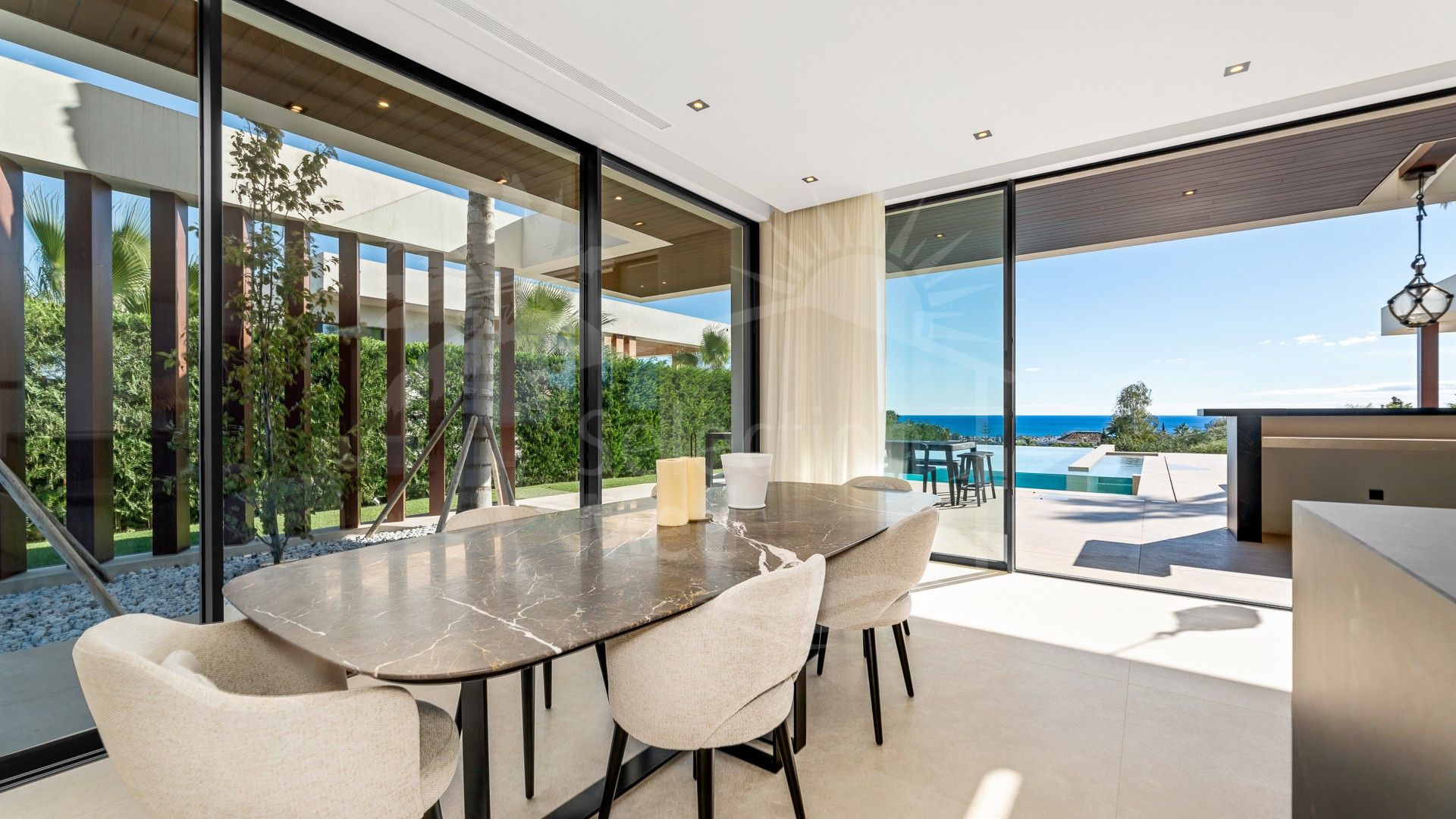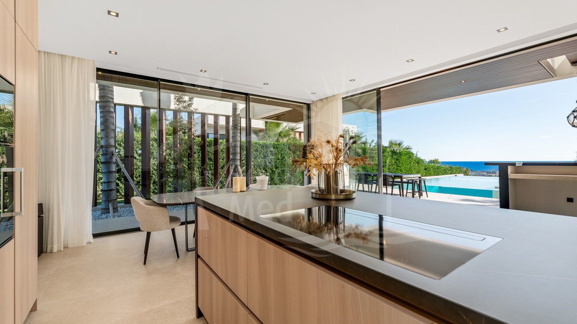 La villa cuenta con un amplio salón de concepto abierto que se conecta perfectamente con la gran terraza a través de grandes ventanales, llenando el espacio de luz natural y conectándolo con la piscina infinita y el entorno verde. La cocina, equipada con electrodomésticos Gaggenau de primera calidad, incluye un área de comedor y acceso directo a la cocina exterior.