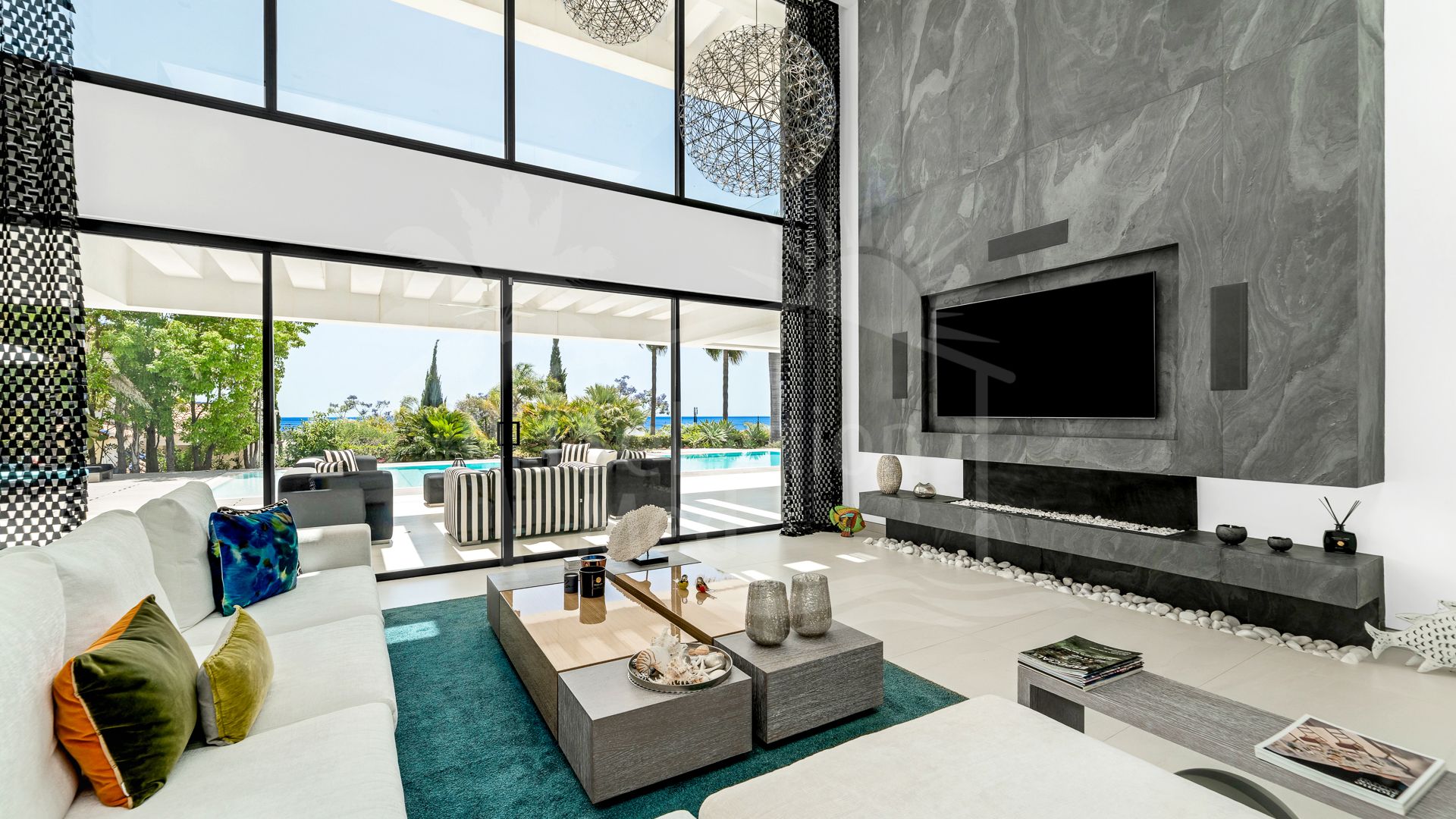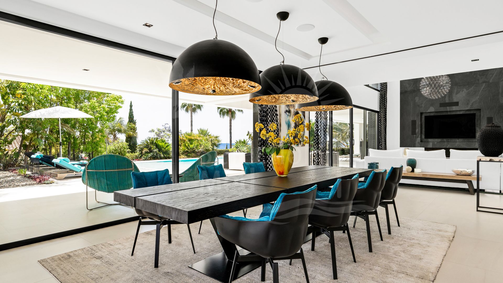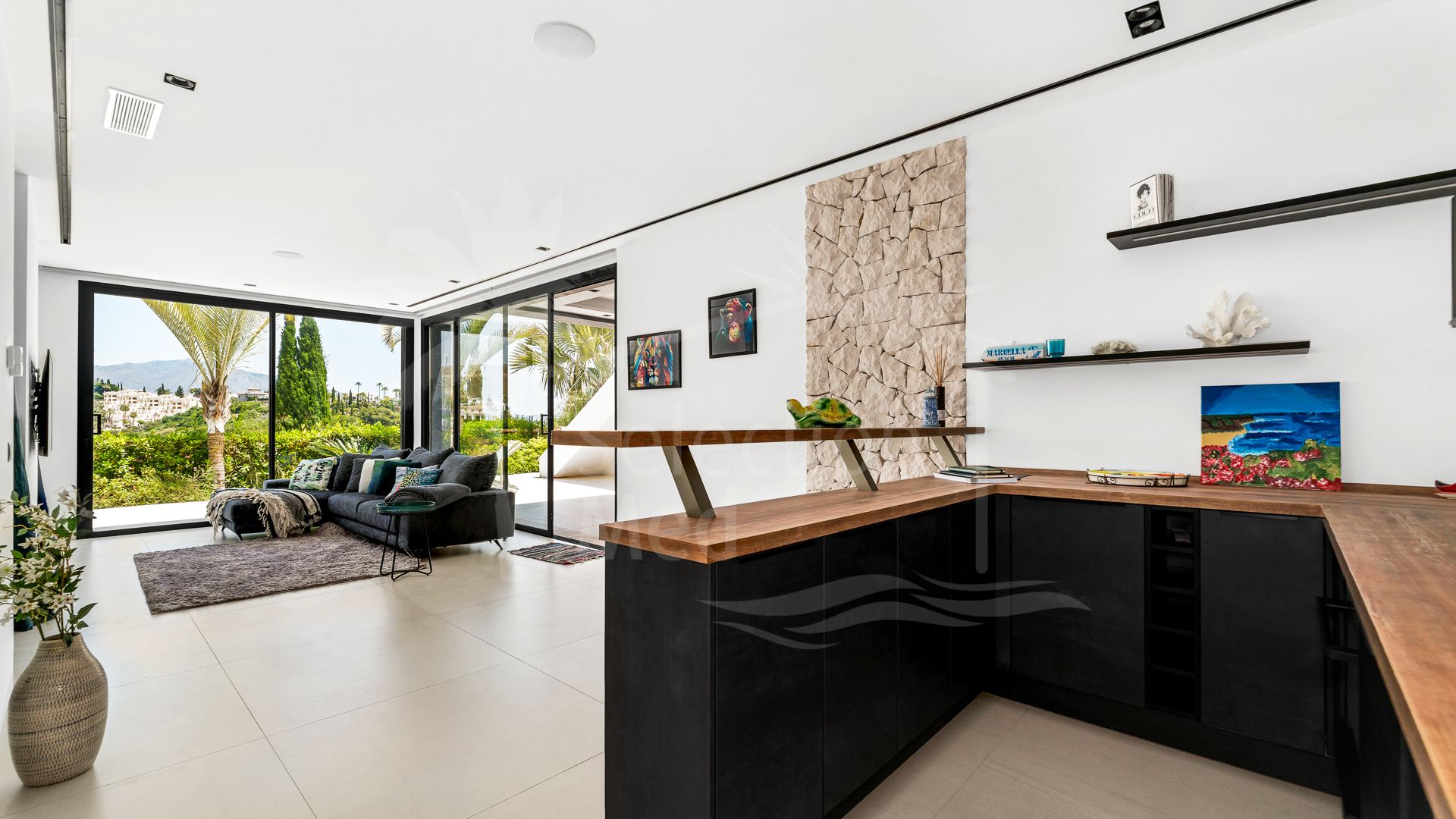 Un espacioso hall de entrada da la bienvenida al hogar, donde la elegante distribución define cada planta. La planta baja cuenta con un impresionante techo de doble altura en el área principal, creando un ambiente grandioso pero acogedor. El salón se conecta directamente con una amplia terraza en forma de L, donde una plataforma de madera rodea una tranquila piscina, todo diseñado para maximizar el estilo de vida al aire libre. Un comedor formal fluye naturalmente desde el salón, continuando el diseño de planta abierta hacia una cocina contemporánea equipada con electrodomésticos Gaggenau de alta gama y acabados elegantes.