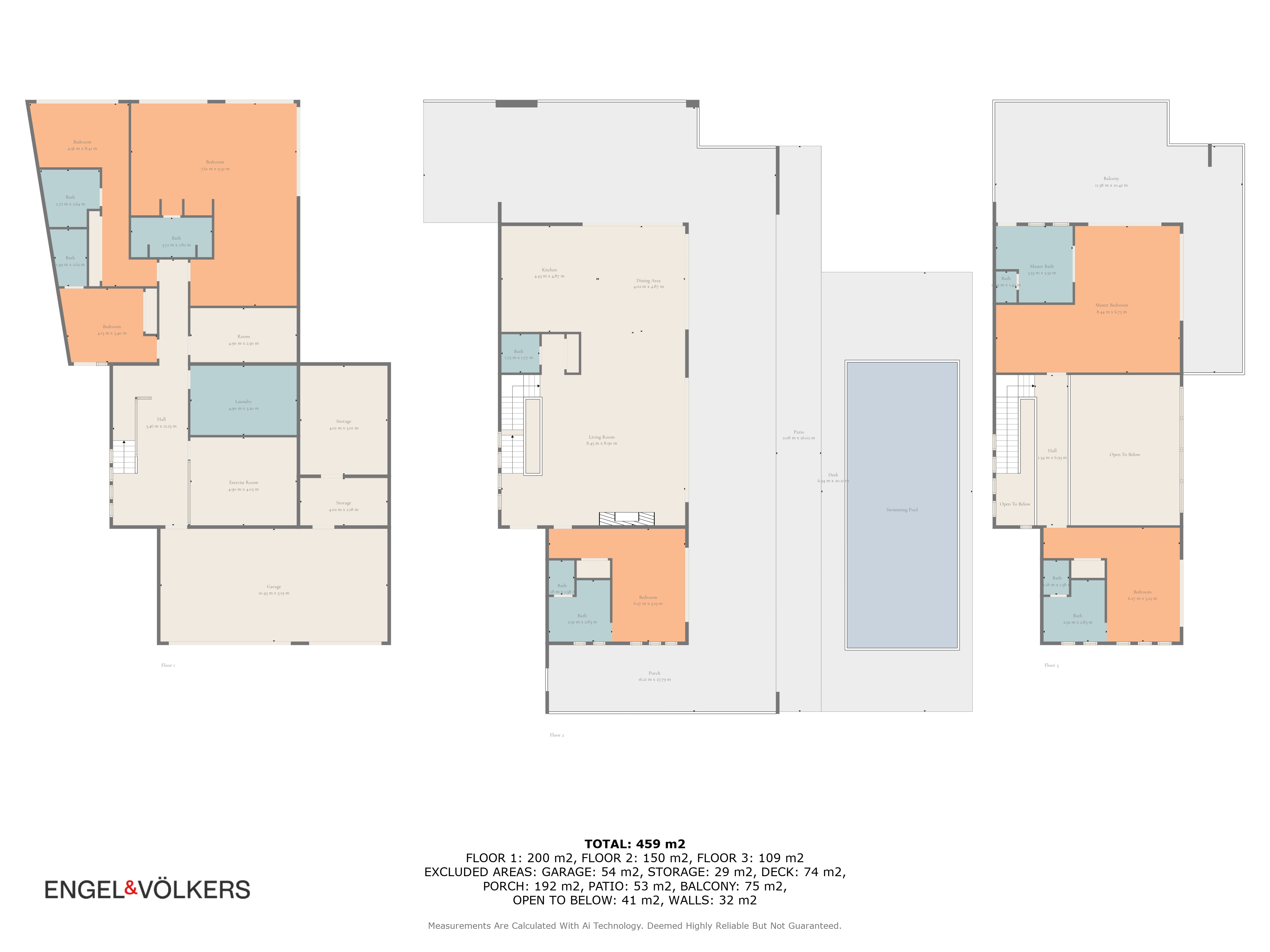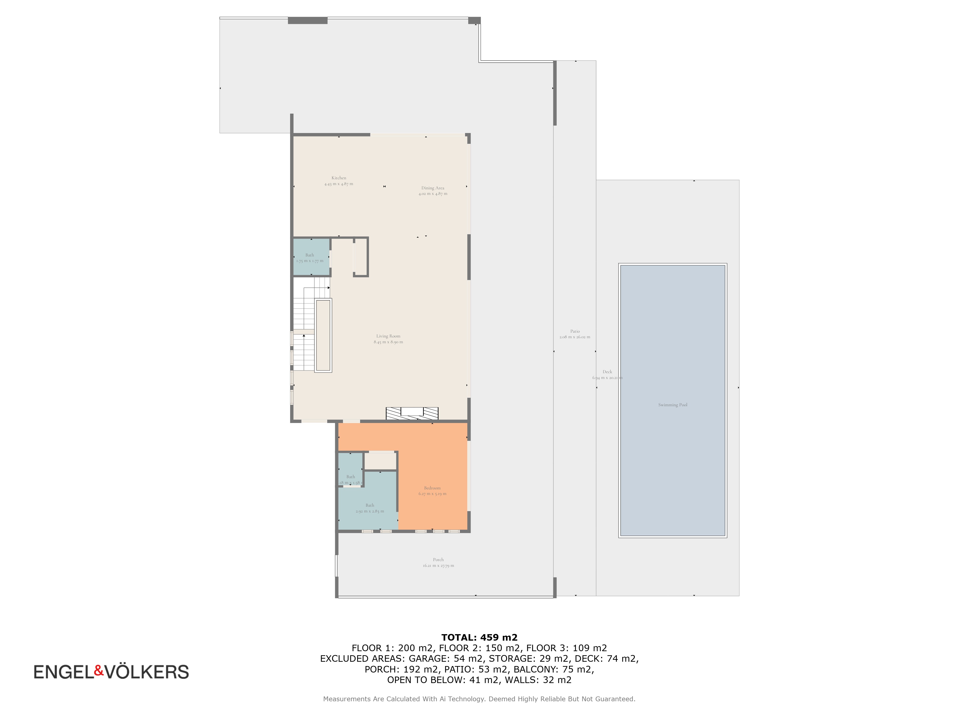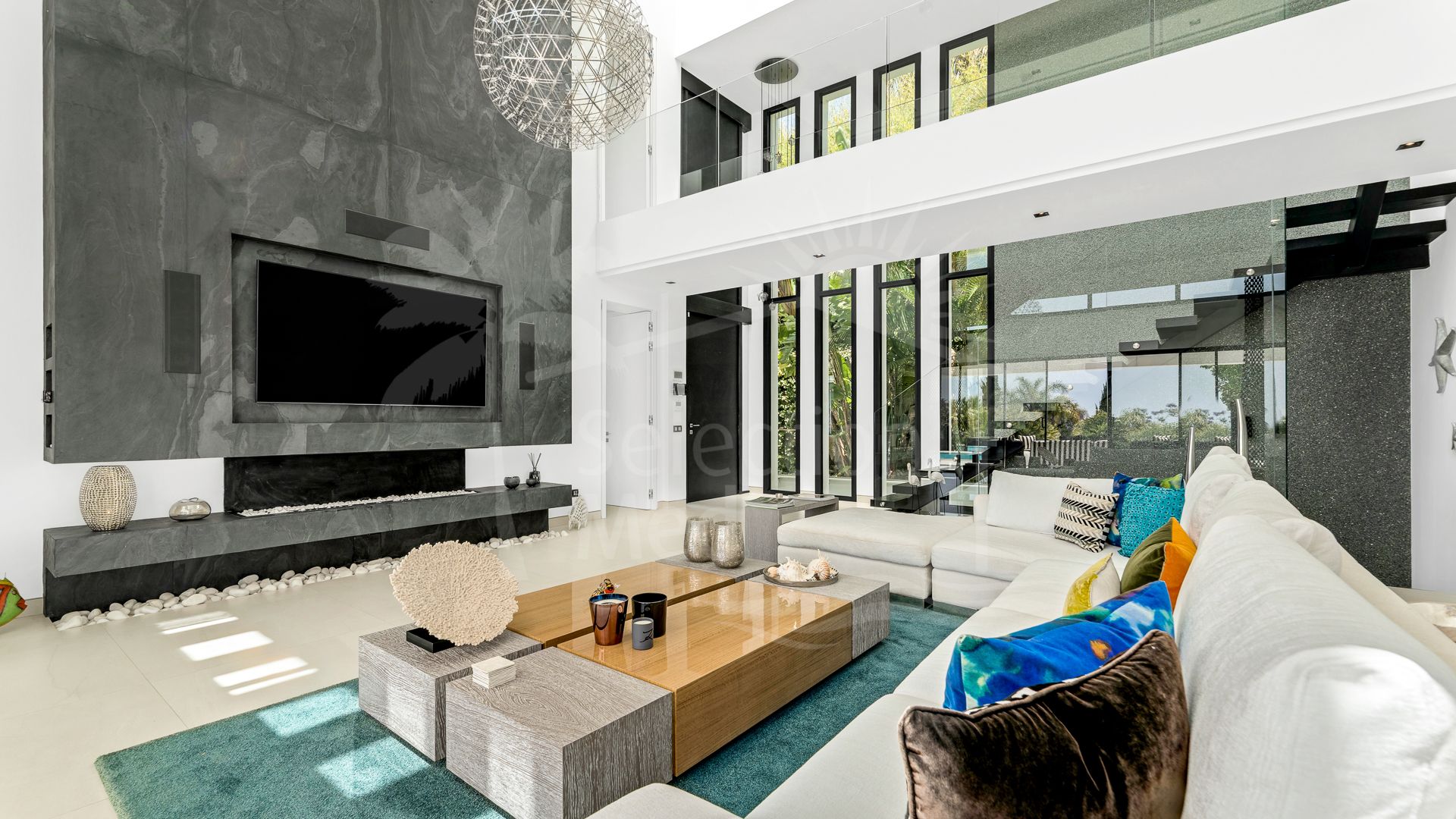 Un espacioso hall de entrada da la bienvenida al hogar, donde la elegante distribución define cada planta. La planta baja cuenta con un impresionante techo de doble altura en el área principal, creando un ambiente grandioso pero acogedor. El salón se conecta directamente con una amplia terraza en forma de L, donde una plataforma de madera rodea una tranquila piscina, todo diseñado para maximizar el estilo de vida al aire libre. Un comedor formal fluye naturalmente desde el salón, continuando el diseño de planta abierta hacia una cocina contemporánea equipada con electrodomésticos Gaggenau de alta gama y acabados elegantes.