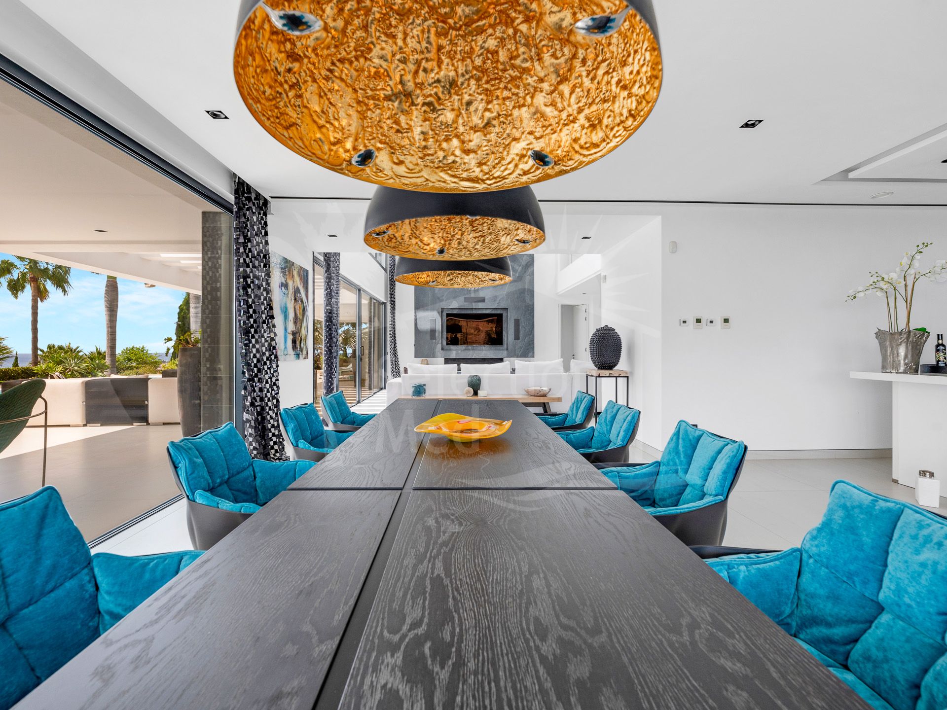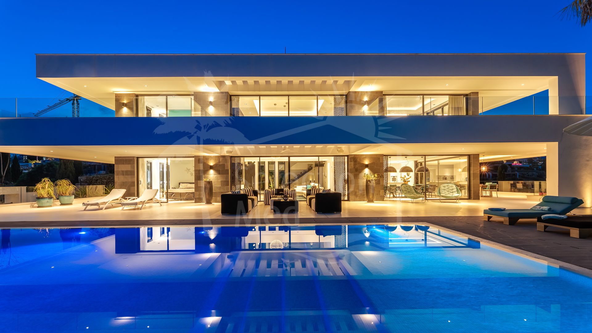 Bienvenido a esta espectacular villa de lujo de seis dormitorios, distribuida en tres amplios niveles y ubicada en la codiciada zona de Los Flamingos Golf en Marbella Oeste. Con vistas panorámicas al mar Mediterráneo y al exuberante paisaje verde de los tres campos de golf circundantes, esta excepcional residencia combina una arquitectura refinada con un estándar de vida superior.