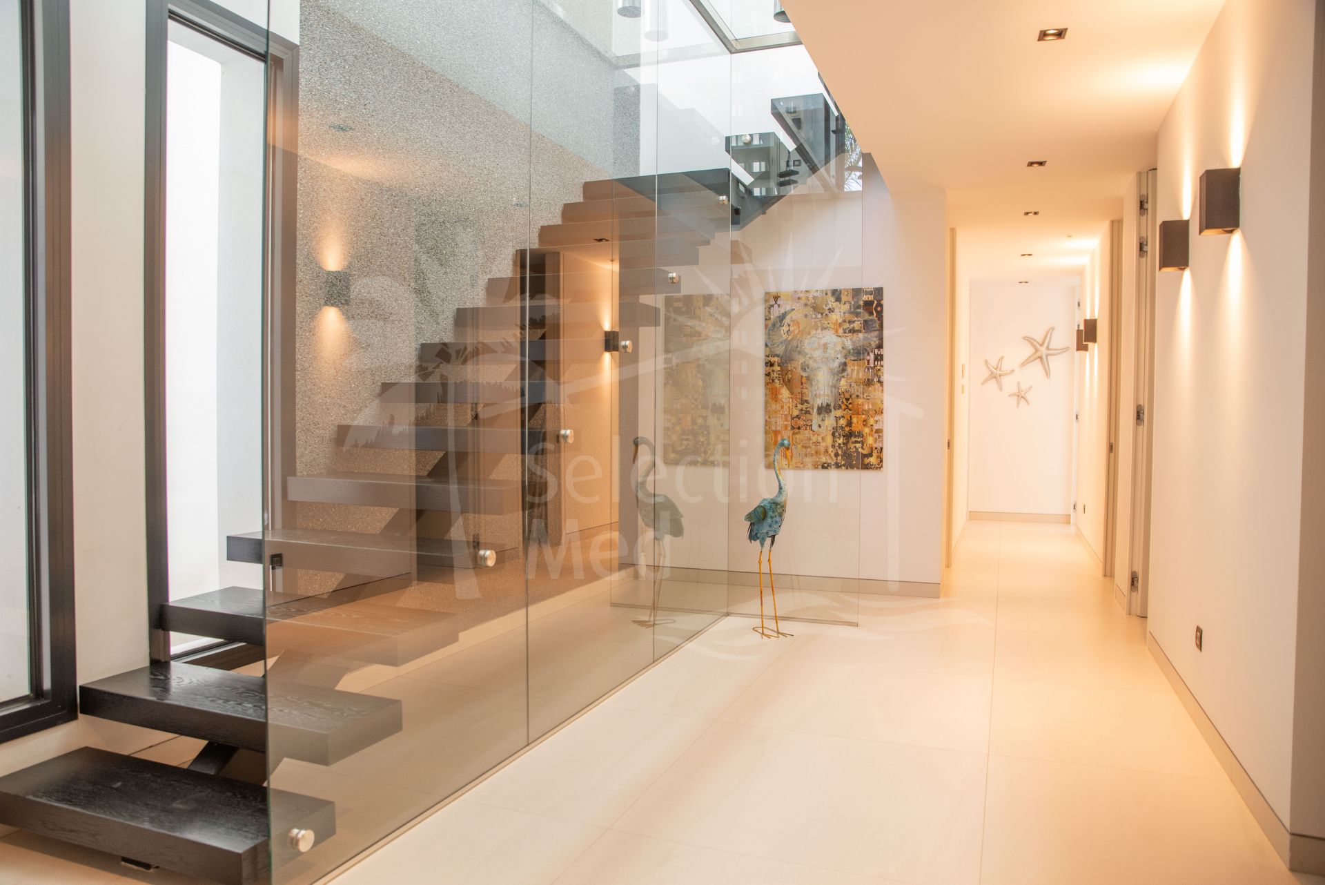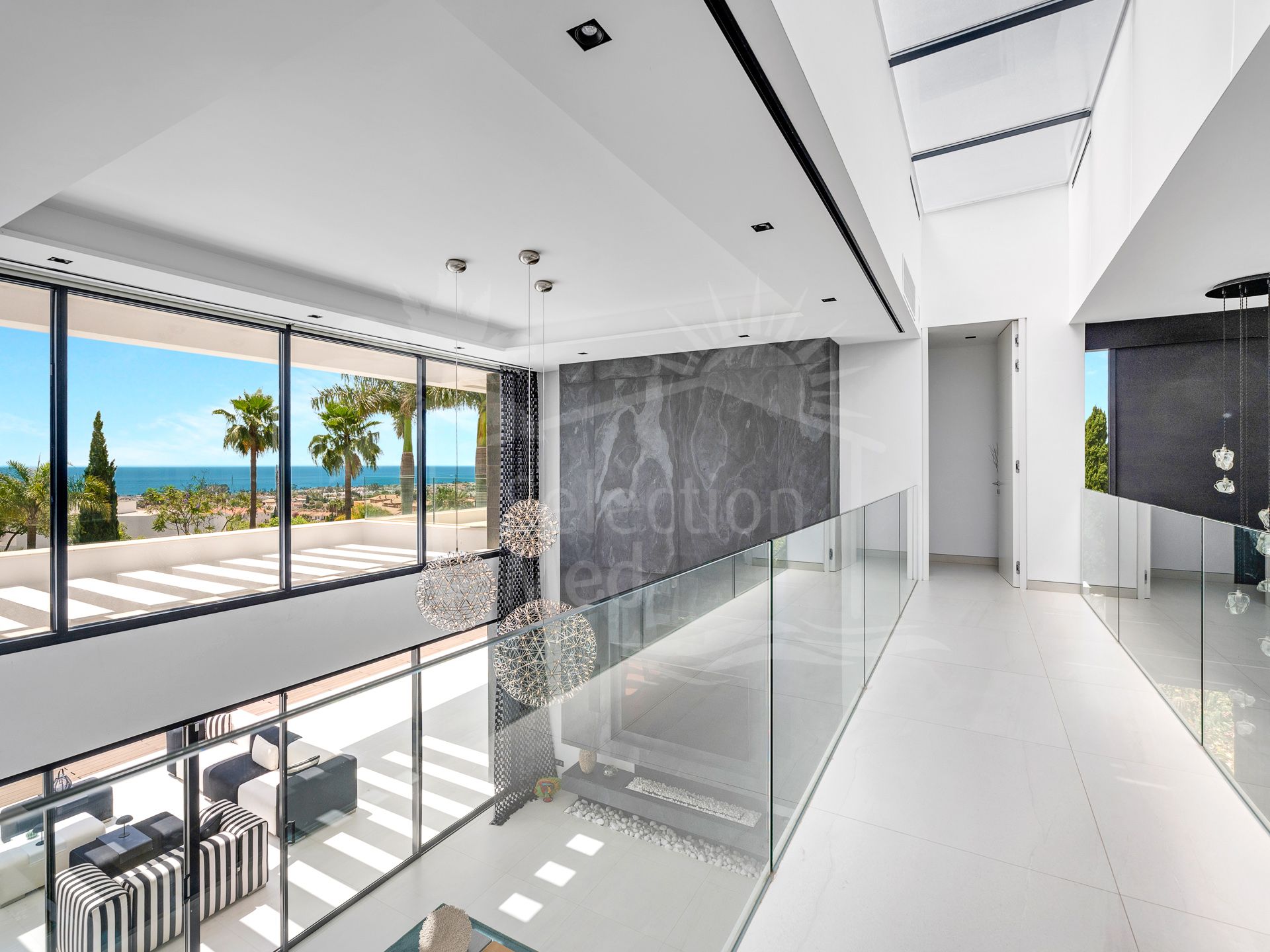 En el nivel superior, una suite junior y el elegante dormitorio principal ofrecen un retiro elevado. La suite principal cuenta con un amplio vestidor, un lujoso baño en suite y acceso a un balcón privado con impresionantes vistas sin obstrucciones. Ambos dormitorios en esta planta disfrutan de terrazas exteriores, mejorando la sensación de espacio y exclusividad.