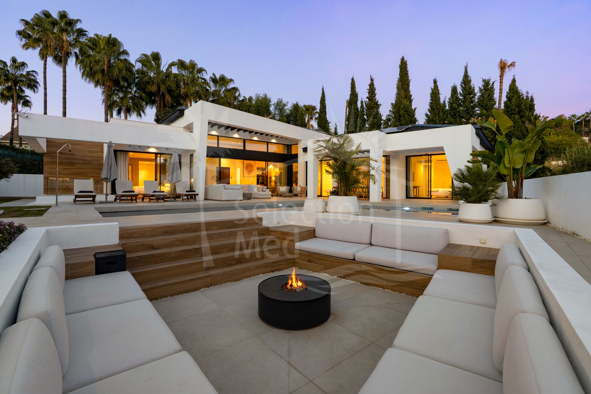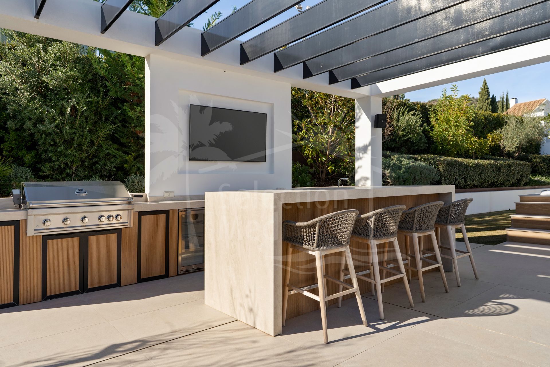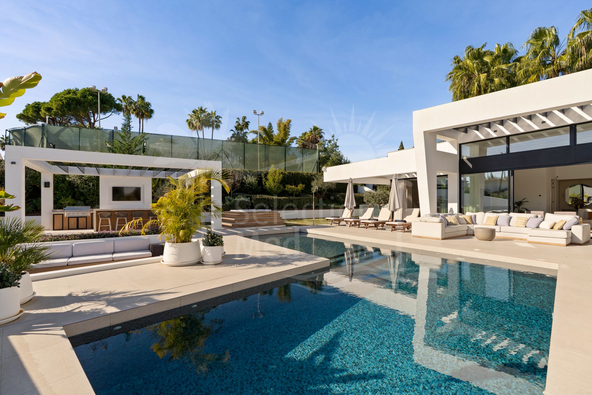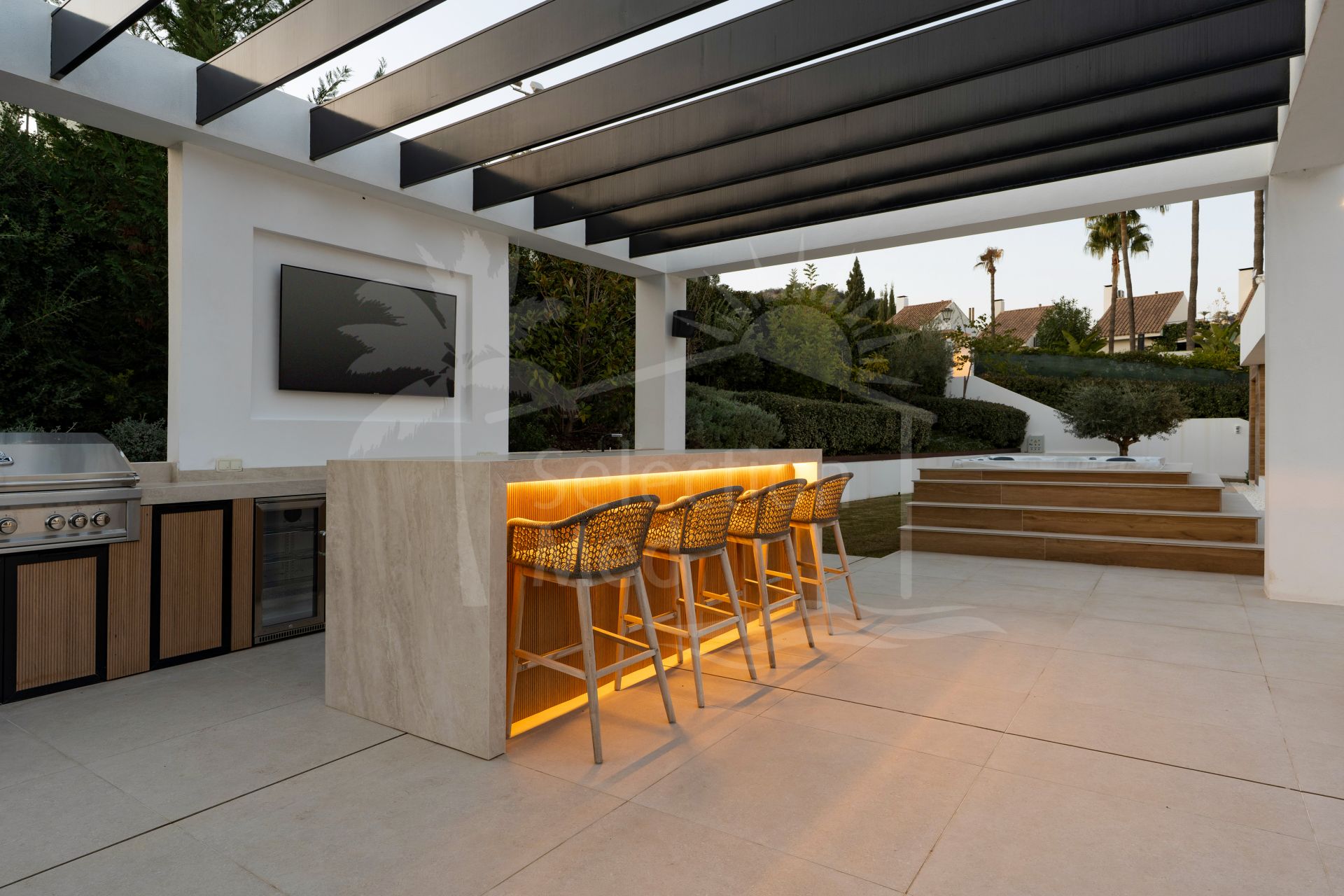 La vida al aire libre es un punto culminante, con amplias terrazas que rodean la piscina, una gran zona de estar con chimenea, un jacuzzi y una cocina al aire libre totalmente equipada con parrilla, neveras, almacenamiento y TV impermeable. Esto crea un entorno ideal para disfrutar y disfrutar del clima de todo el año de Marbella.