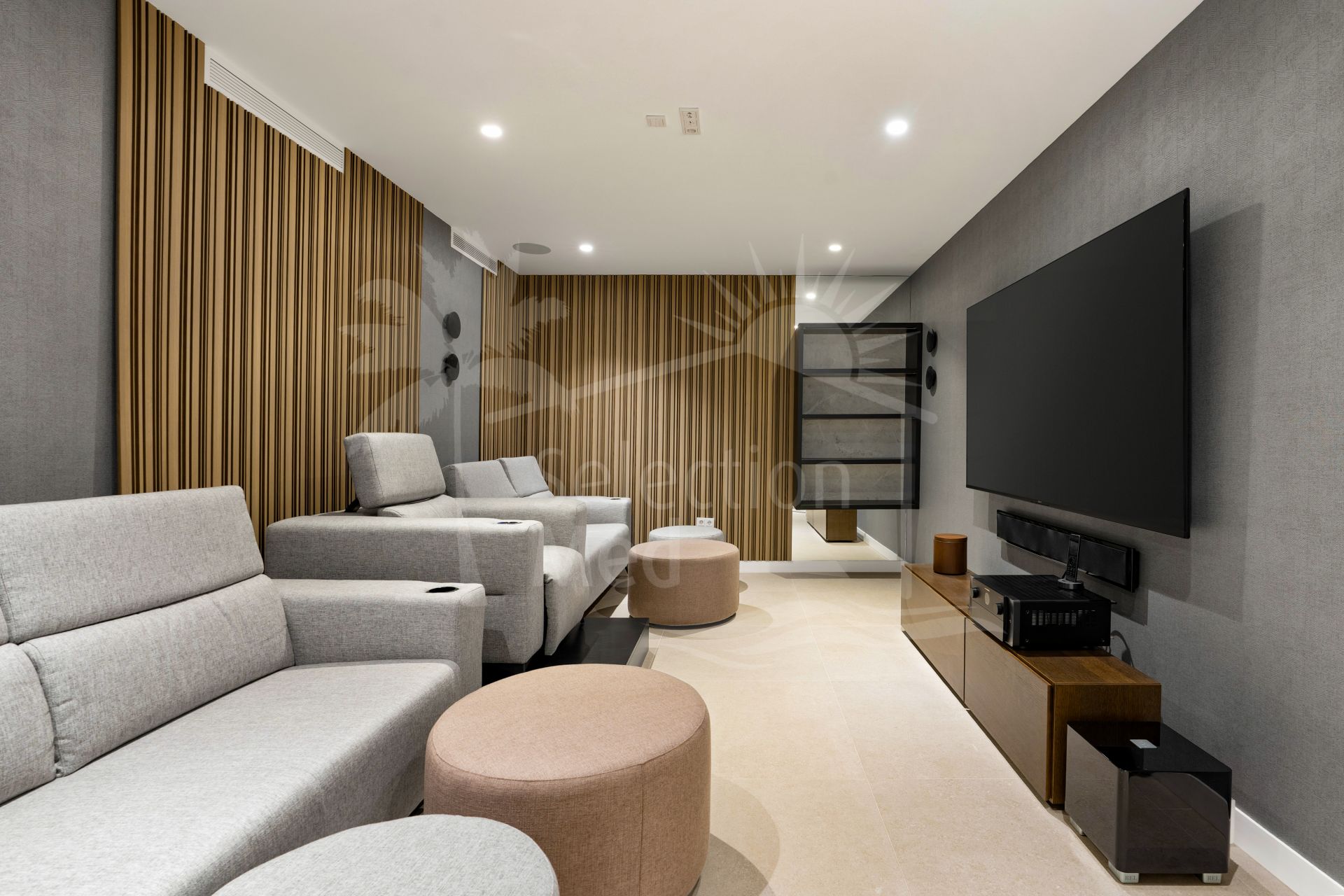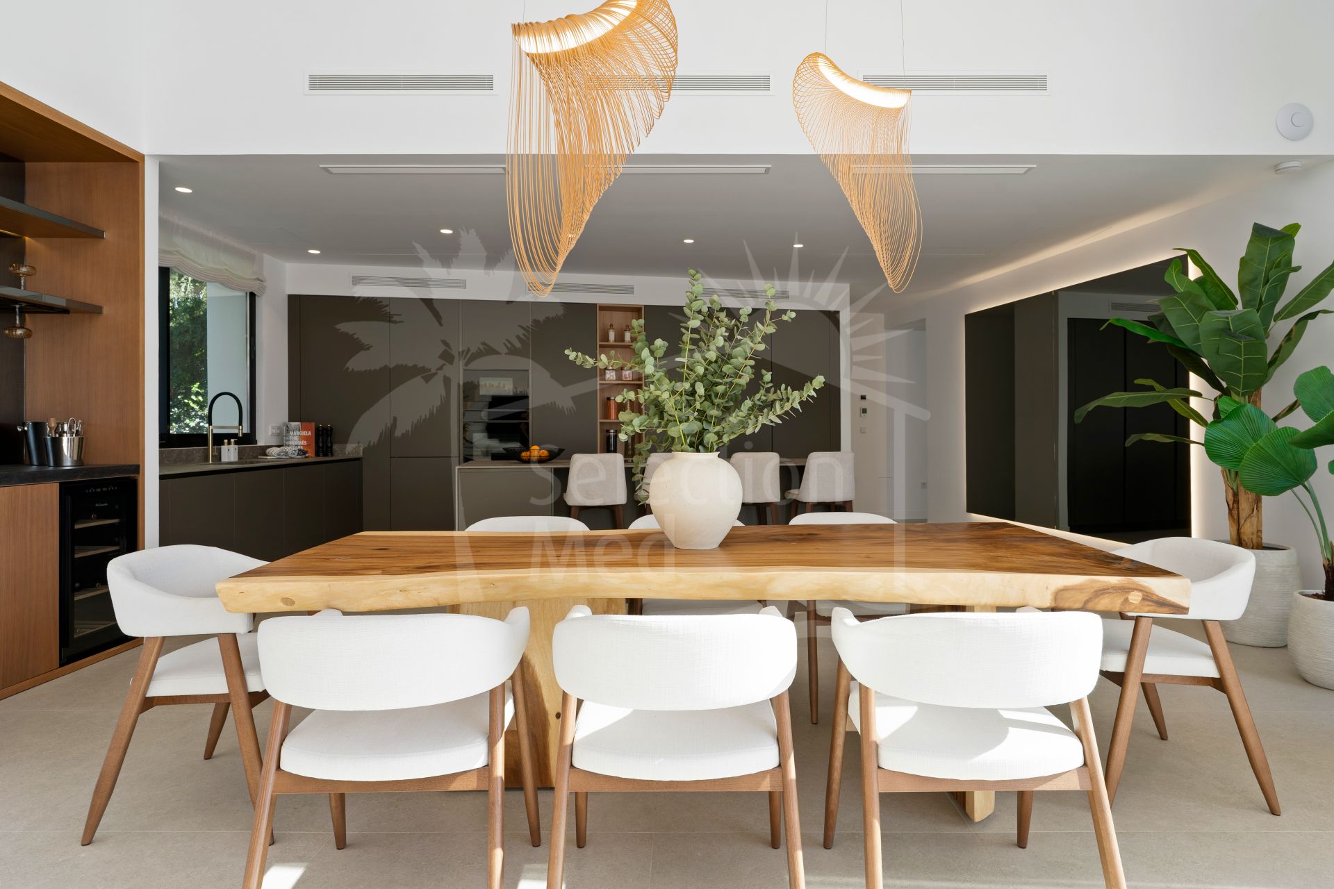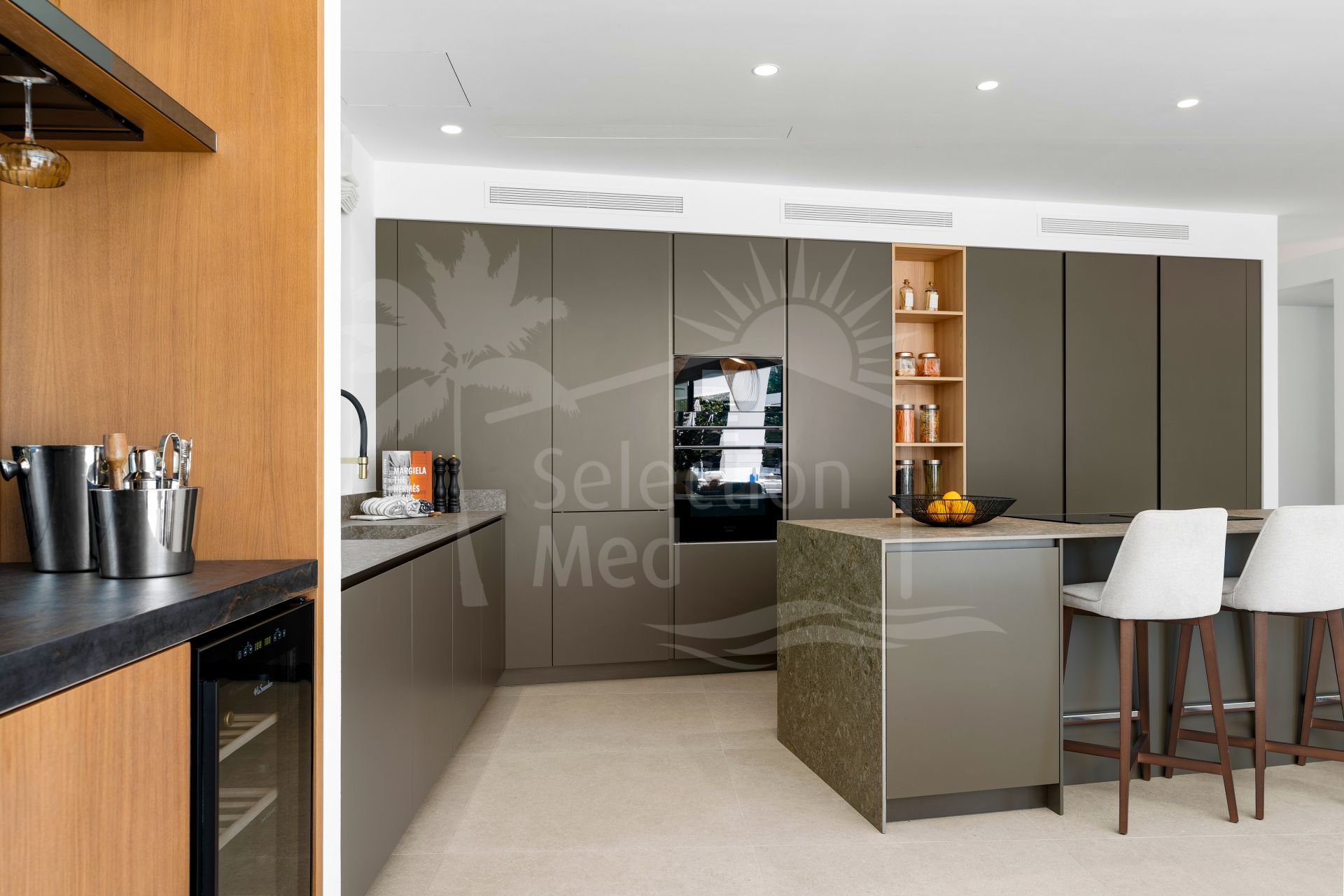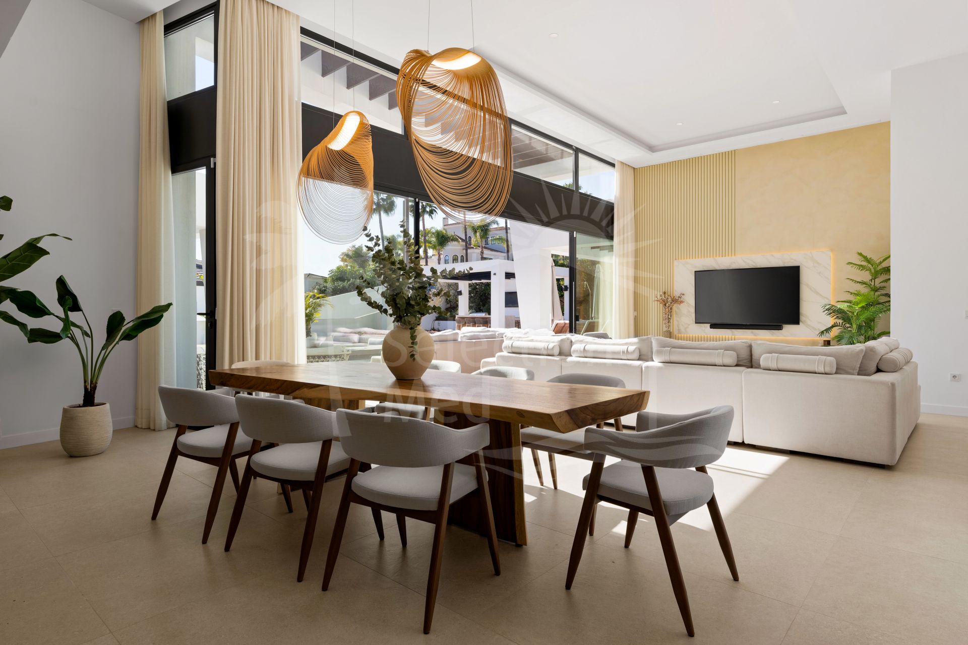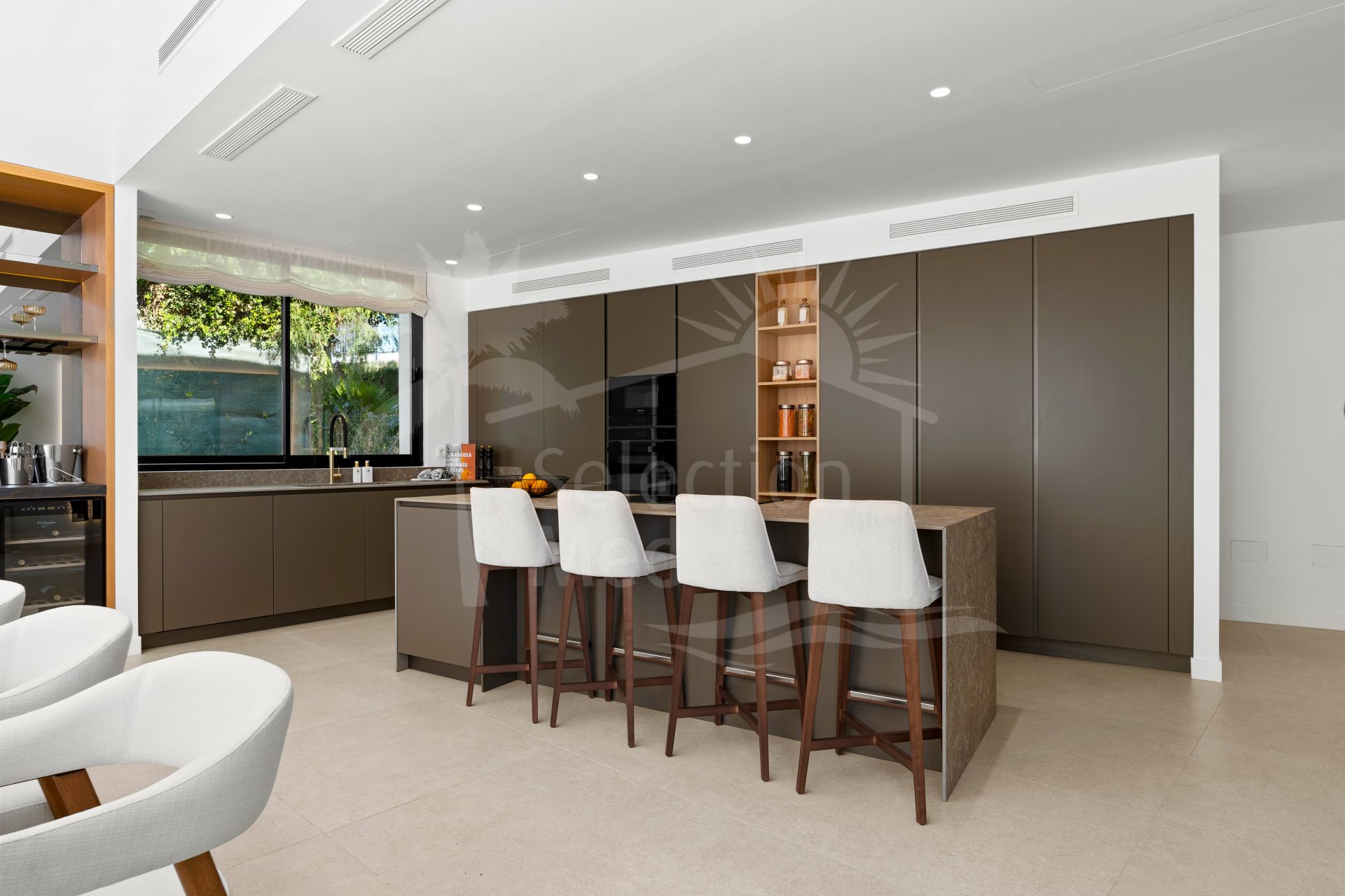 La villa cuenta con seis dormitorios y impresionantes techos de 3,5 metros en el nivel de vida principal, creando un sentido inmediato de apertura y profundidad. Una amplia sala de estar y cocina de planta abierta se conecta directamente a la piscina y espacios de entretenimiento al aire libre, reforzando el estilo de vida que define una villa de alta gama en Marbella. La cocina moderna elegante está totalmente equipada con electrodomésticos Siemens integrados, amplio almacenamiento y una elegante barra seca con dos neveras de vino.