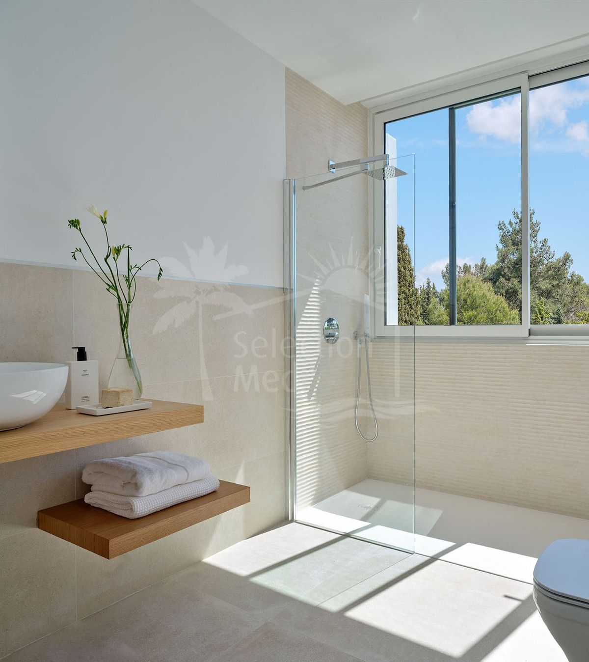 Ventanas correderas de suelo a techo con rieles encastrados en las solerías consiguen que los espacios interiores y exteriores queden perfectamente unidos y refuerzan el concepto de vida en el exterior.
