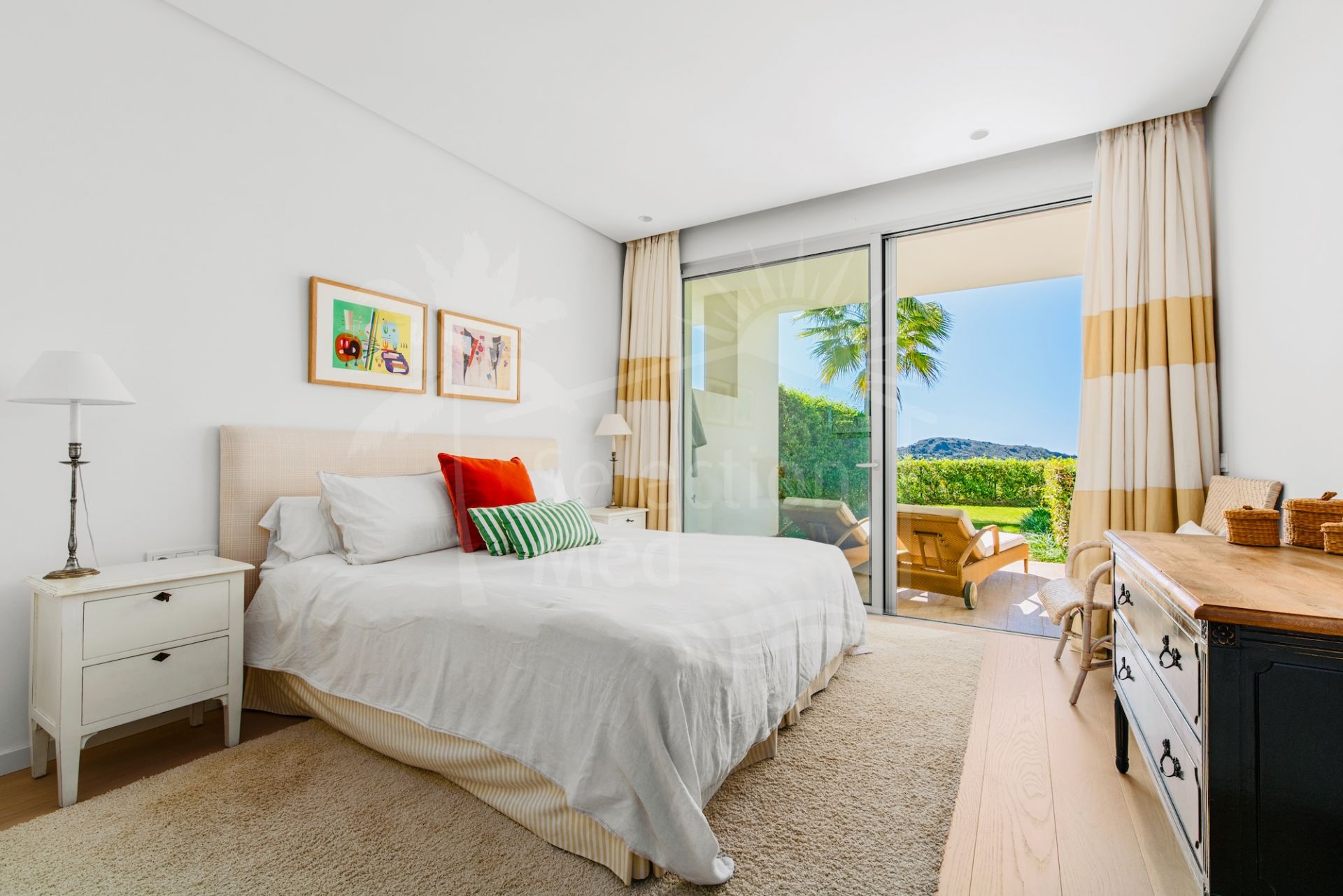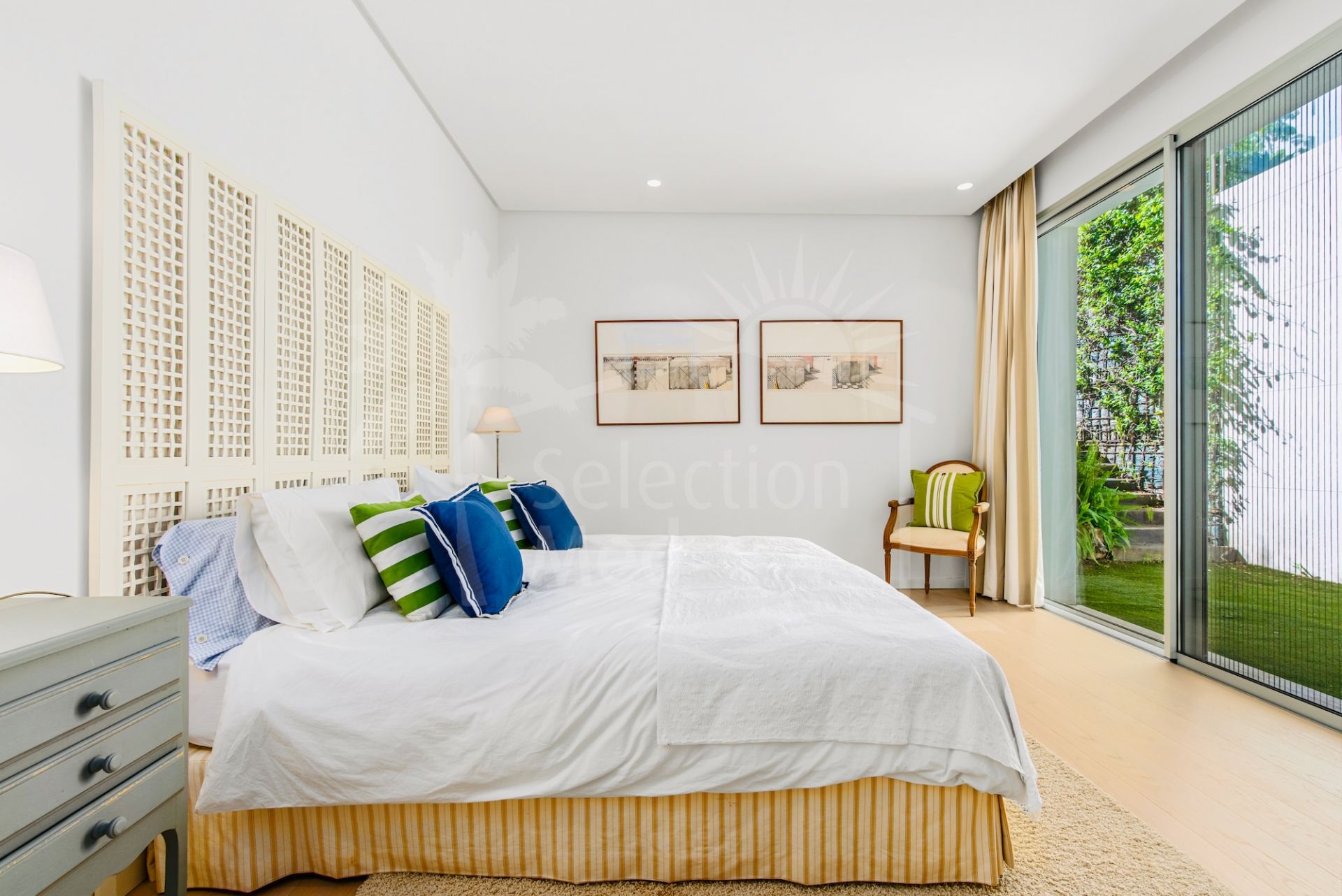 La amplia suite principal, situada en este nivel, también disfruta de vistas al Mar desde el despertar. Dispone de grandes armarios y acceso directo a la terraza y al jardín.