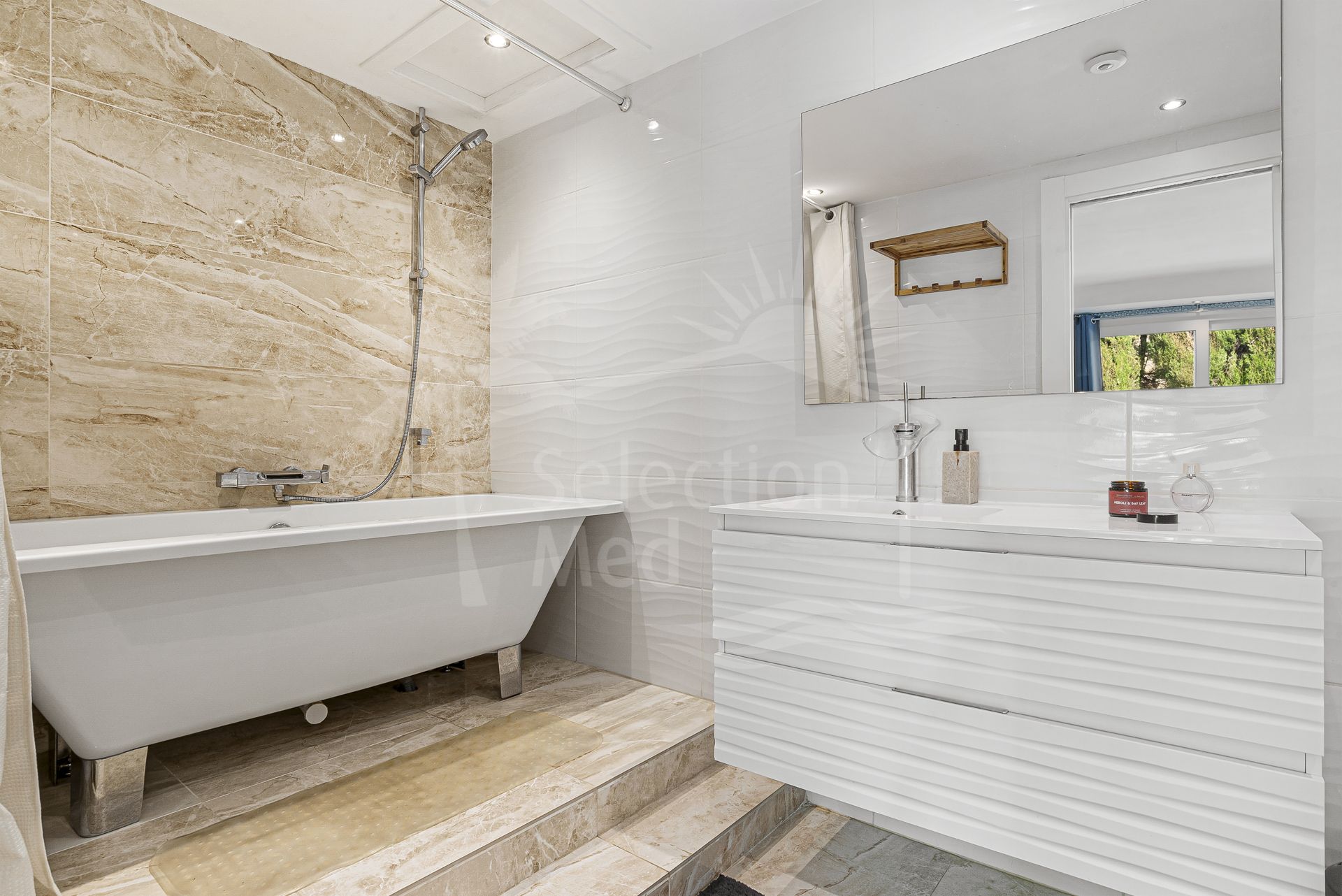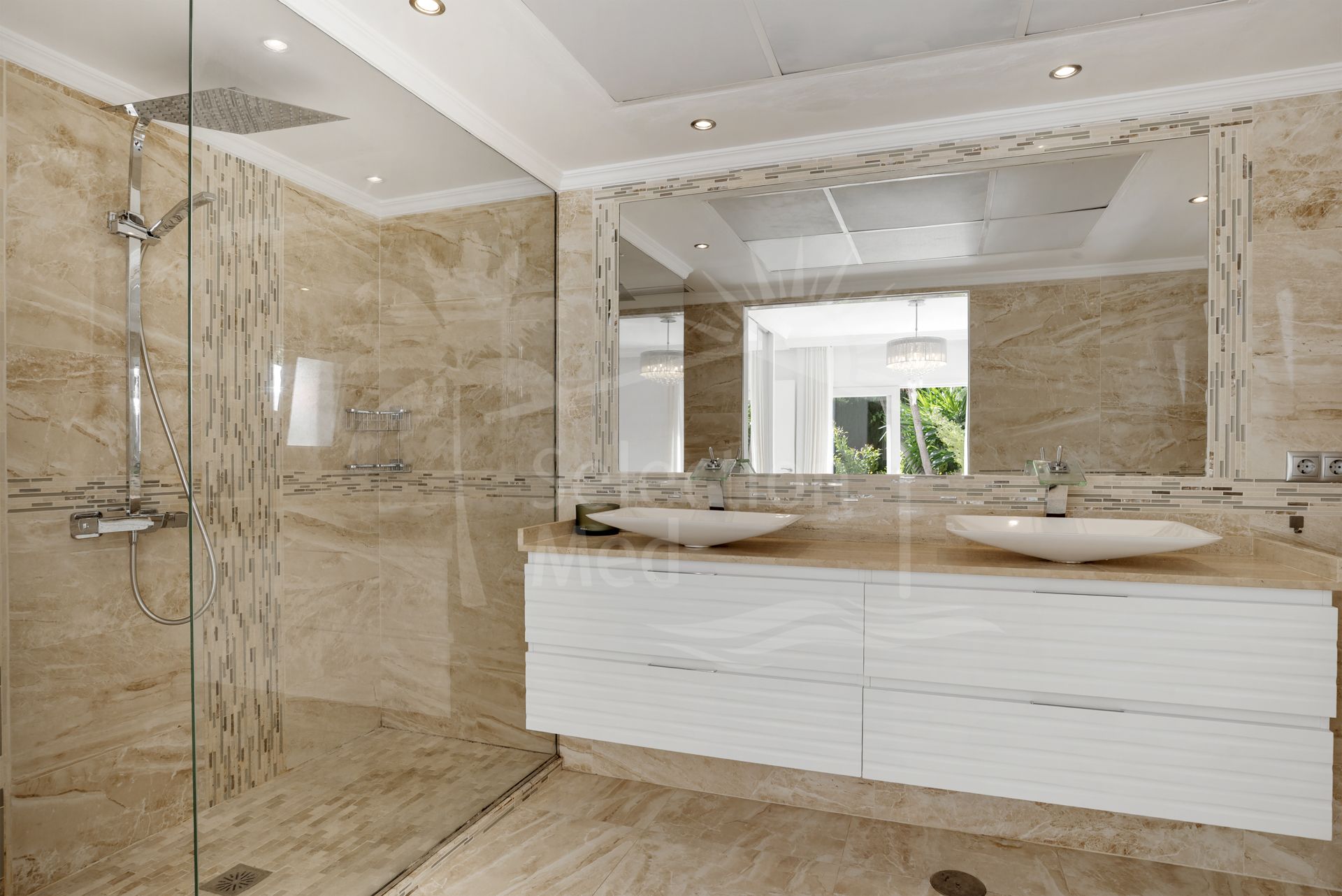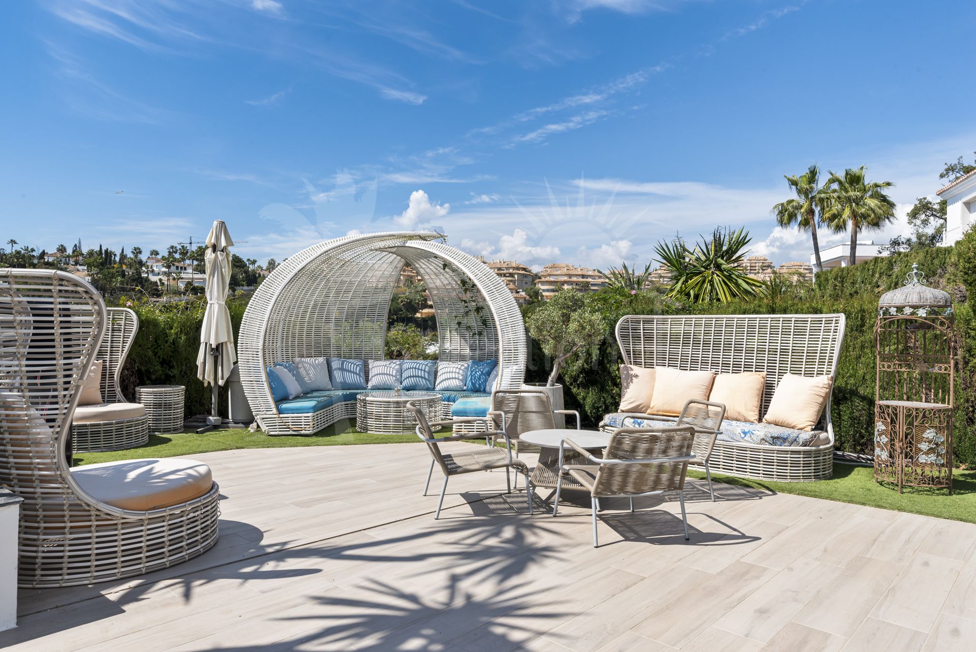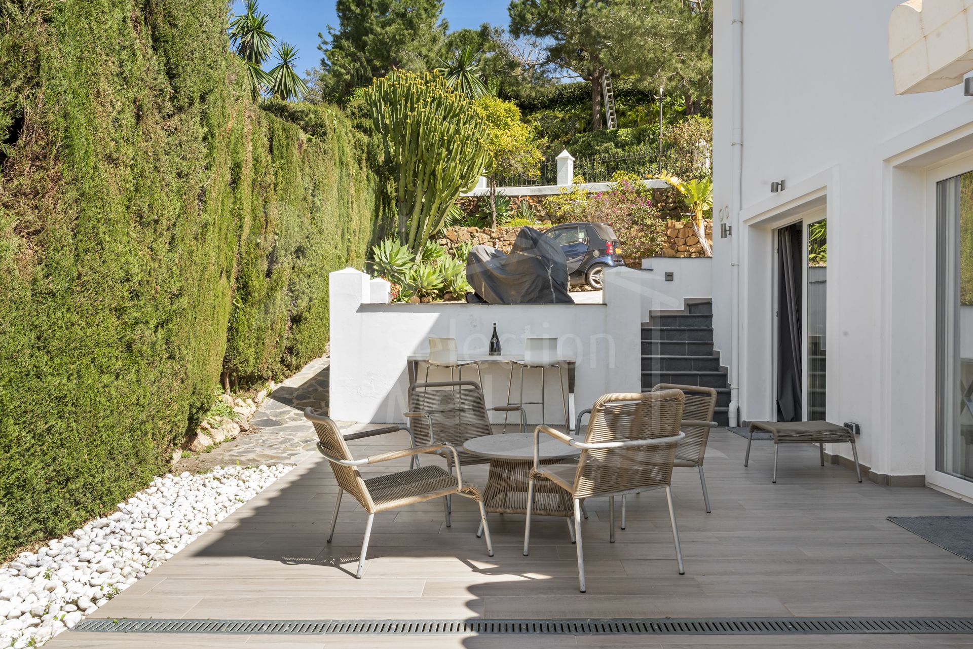 Arriba, 2 amplios dormitorios en suite tienen acceso a una amplia terraza. En el exterior, la villa cuenta con una piscina de agua salada de estilo playa, hermosas terrazas, una cocina de verano con barbacoa, zonas chill out y jardines encantadores. También hay aparcamiento seguro para varios coches dentro de la parcela cerrada.
